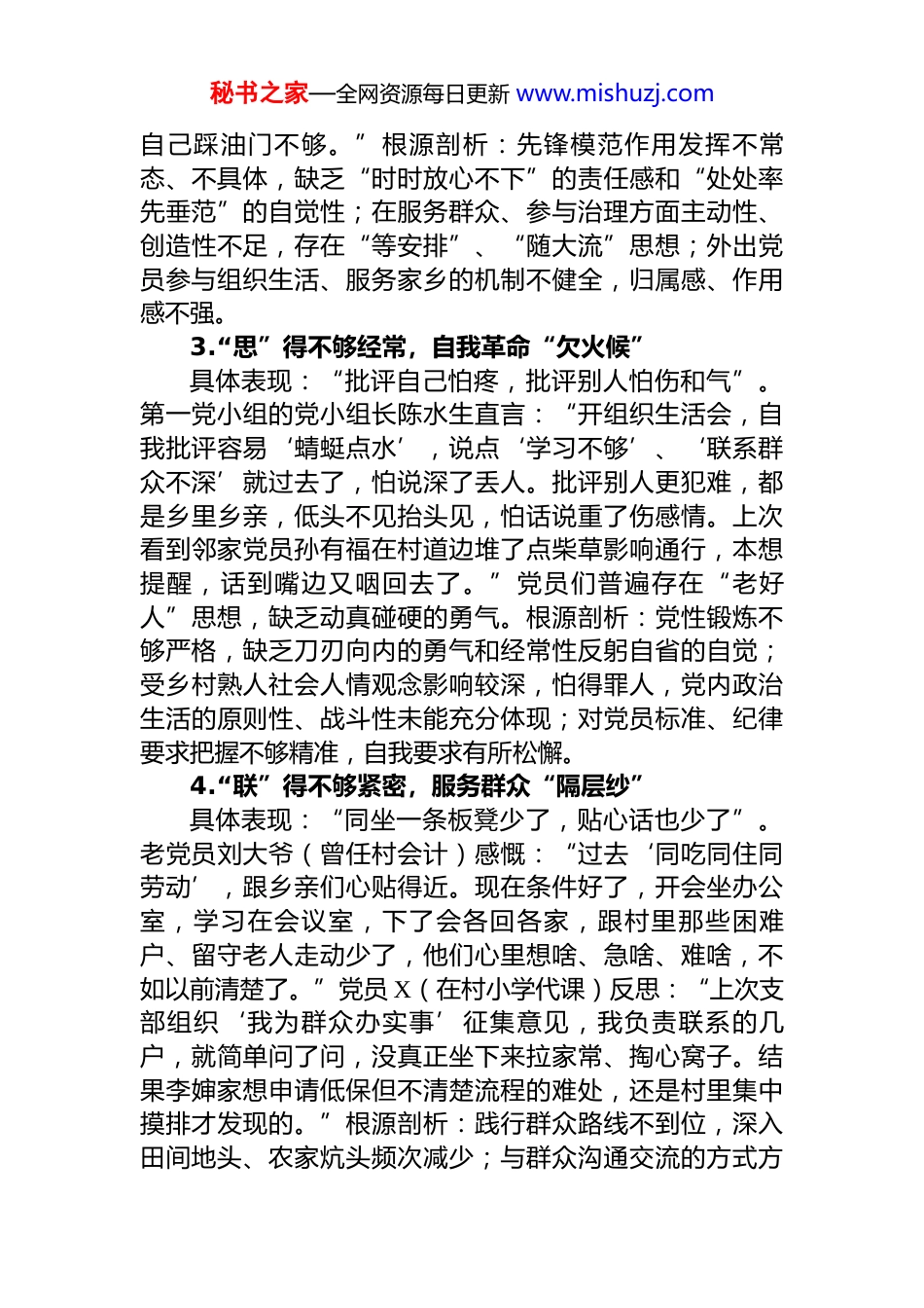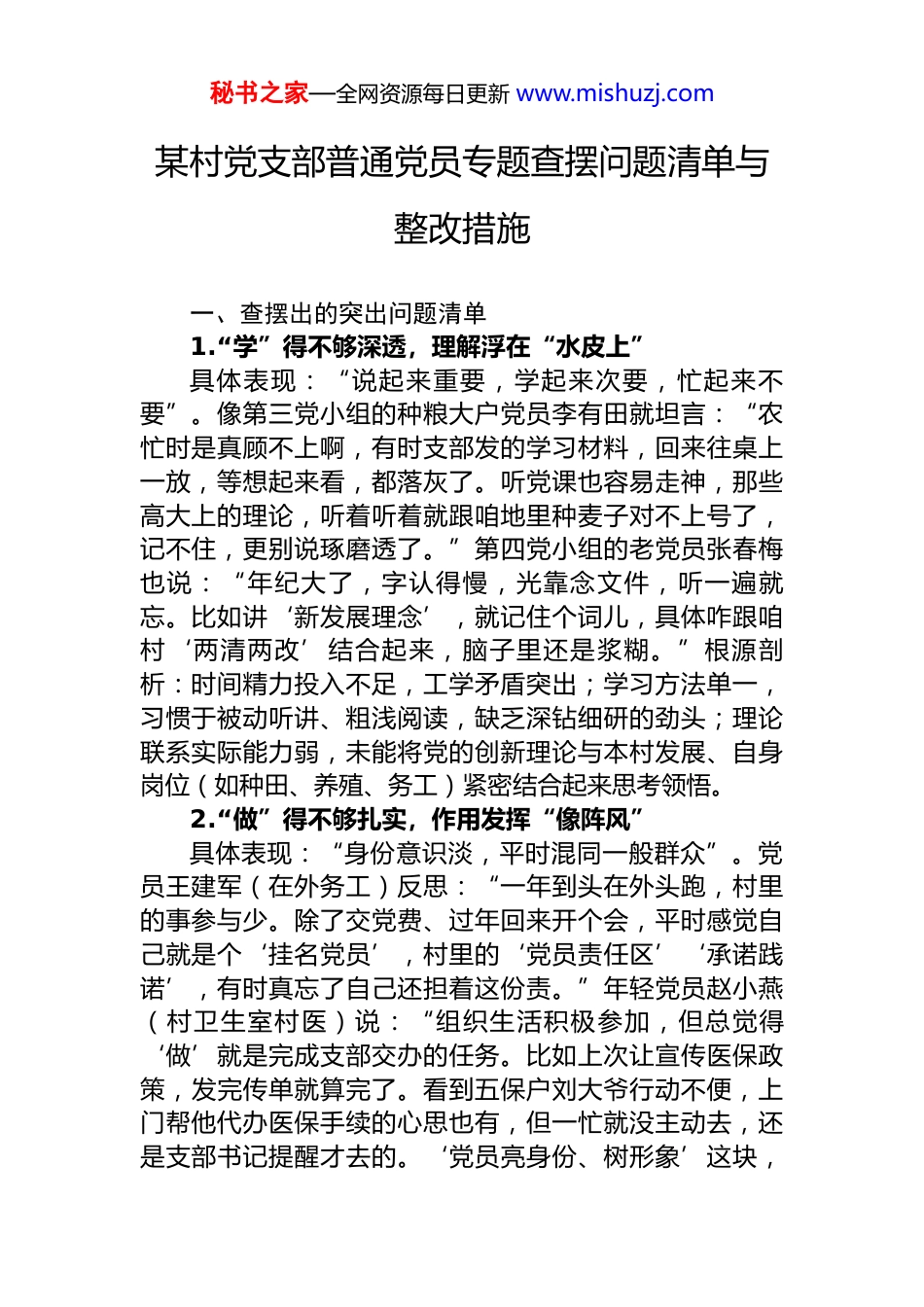 秘书之家—全网资源每日更新 www.mishuzj.com某村党支部普通党员专题查摆问题清单与整改措施一、查摆出的突出问题清单1.“学”得不够深透,理解浮在“水皮上”具体表现:“说起来重要,学起来次要,忙起来不要”。像第三党小组的种粮大户党员李有田就坦言:“农忙时是真顾不上啊,有时支部发的学习材料,回来往桌上一放,等想起来看,都落灰了。听党课也容易走神,那些高大上的理论,听着听着就跟咱地里种麦子对不上号了,记不住,更别说琢磨透了。”第四党小组的老党员张春梅也说:“年纪大了,字认得慢,光靠念文件,听一遍就忘。比如讲‘新发展理念’,就记住个词儿,具体咋跟咱村‘两清两改’结合起来,脑子里还是浆糊。”根源剖析:时间精力投入不足,工学矛盾突出;学习方法单一,习惯于被动听讲、粗浅阅读,缺乏深钻细研的劲头;理论联系实际能力弱,未能将党的创新理论与本村发展、自身岗位(如种田、养殖、务工)紧密结合起来思考领悟。2.“做”得不够扎实,作用发挥“像阵风”具体表现:“身份意识淡,平时混同一般群众”。党员王建军(在外务工)反思:“一年到头在外头跑,村里的事参与少。除了交党费、过年回来开个会,平时感觉自己就是个‘挂名党员’,村里的‘党员责任区’‘承诺践诺’,有时真忘了自己还担着这份责。”年轻党员赵小燕(村卫生室村医)说:“组织生活积极参加,但总觉得‘做’就是完成支部交办的任务。比如上次让宣传医保政策,发完传单就算完了。看到五保户刘大爷行动不便,上门帮他代办医保手续的心思也有,但一忙就没主动去,还是支部书记提醒才去的。‘党员亮身份、树形象’这块,秘书之家—全网资源每日更新 www.mishuzj.com自己踩油门不够。”根源剖析:先锋模范作用发挥不常态、不具体,缺乏“时时放心不下”的责任感和“处处率先垂范”的自觉性;在服务群众、参与治理方面主动性、创造性不足,存在“等安排”、“随大流”思想;外出党员参与组织生活、服务家乡的机制不健全,归属感、作用感不强。3.“思”得不够经常,自我革命“欠火候”具体表现:“批评自己怕疼,批评别人怕伤和气”。第一党小组的党小组长陈水生直言:“开组织生活会,自我批评容易‘蜻蜓点水’,说点‘学习不够’、‘联系群众不深’就过去了,怕说深了丢人。批评别人更犯难,都是乡里乡亲,低头不见抬头见,怕话说重了伤感情。上次看到邻家党员孙有福在村道边堆了点柴草影响通行,本想提醒,话到嘴边又咽回去了。”党员们普遍存在“老好人”思想,缺乏动真碰硬的勇气。根源剖析:党性锻炼不够严格,缺乏刀刃向内的勇气和经常性反躬自省的自觉;受乡村熟人社会人情观念影响较深,怕得罪人,党内政治生活的原则性、战斗性未能充分体现;对党员标准、纪律要求把握不够精准,自我要求有所松懈。4.“联”得不够紧密,服务群众“隔层纱”具体表现:“同坐一条板凳少了,贴心话也少了”。老党员刘大爷(曾任村会计)感慨:“过去‘同吃同住同劳动’,跟乡亲们心贴得近。现在条件好了,开会坐办公室,学习在会议室,下了会各回各家,跟村里那些困难户、留守老人走动少了,他们心里想啥、急啥、难啥,不如以前清楚了。”党员 X(在村小学代课)反思:“上次支部组织‘我为群众办实事’征集意见,我负责联系的几户,就简单问了问,没真正坐下来拉家常、掏心窝子。结果李婶家想申请低保但不清楚流程的难处,还是村里集中摸排才发现的。”根源剖析:践行群众路线不到位,深入田间地头、农家炕头频次减少;与群众沟通交流的方式方秘书之家—全网资源每日更新 www.mishuzj.com法简单化、表面化,缺乏真情实感的投入;主动发现、解决群众身边“急难愁盼”问题的敏锐性和行动力不足。二、整改措施针对上述查摆出的问题,X 村党支部的普通党员们不回避、不推诿,决心以“钉钉子”精神抓好整改落实,在学中干、在干中学、在思中进、在联中暖:1.变“要我学”为“我要学”,在深钻细研、学用结合上求突破。具体行动:挤出时间学:每位党员制定个人年度学习计划,明确每月最低自学时长(如农闲时保证 4 小时/月,农忙时至少保证参加集中学习)。利用好“碎片时间”,比如李有田决定...