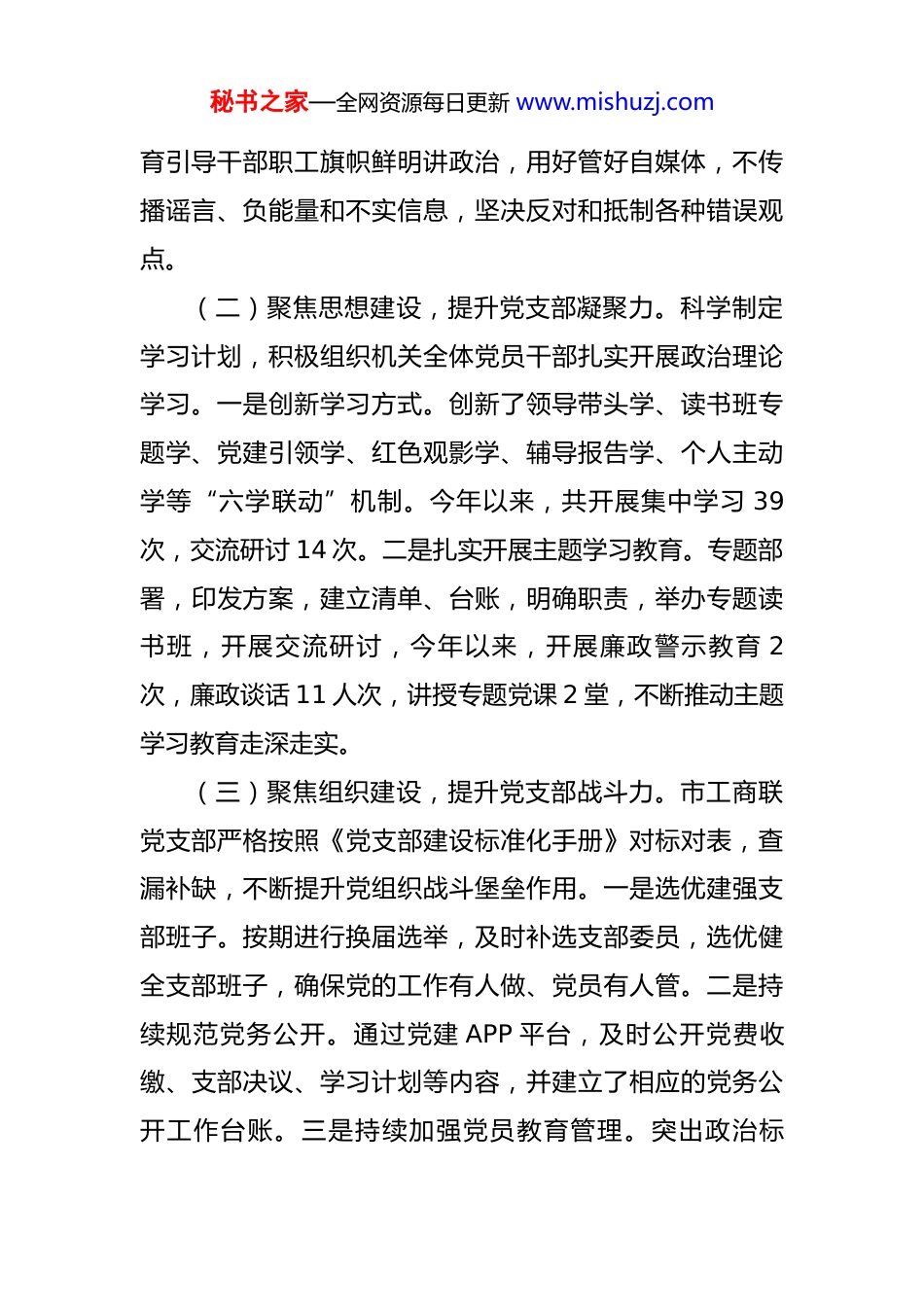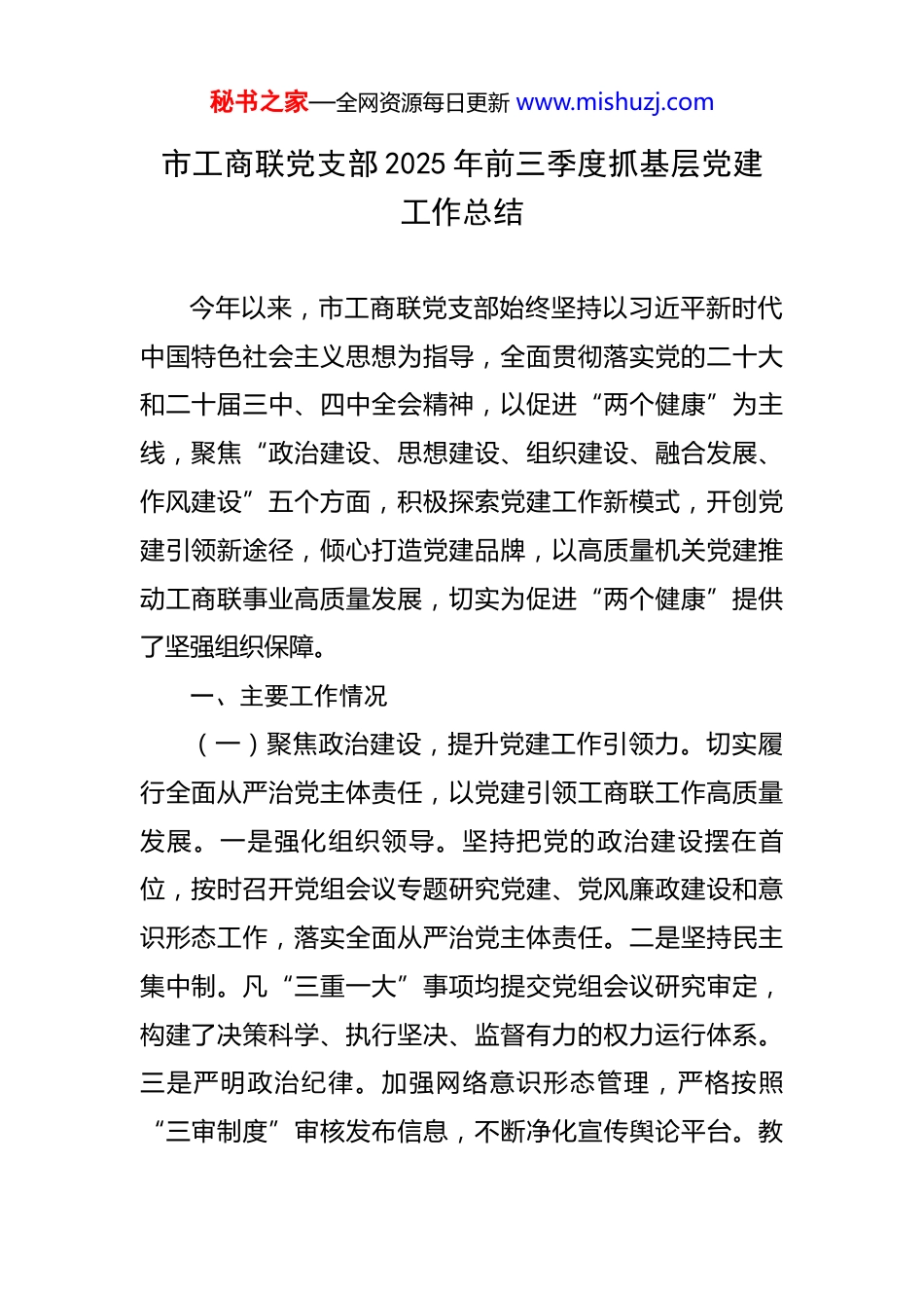秘书之家—全网资源每日更新 www.mishuzj.com市工商联党支部 2025 年前三季度抓基层党建工作总结 今年以来,市工商联党支部始终坚持以习近平新时代中国特色社会主义思想为指导,全面贯彻落实党的二十大和二十届三中、四中全会精神,以促进“两个健康”为主线,聚焦“政治建设、思想建设、组织建设、融合发展、作风建设”五个方面,积极探索党建工作新模式,开创党建引领新途径,倾心打造党建品牌,以高质量机关党建推动工商联事业高质量发展,切实为促进“两个健康”提供了坚强组织保障。一、主要工作情况(一)聚焦政治建设,提升党建工作引领力。切实履行全面从严治党主体责任,以党建引领工商联工作高质量发展。一是强化组织领导。坚持把党的政治建设摆在首位,按时召开党组会议专题研究党建、党风廉政建设和意识形态工作,落实全面从严治党主体责任。二是坚持民主集中制。凡“三重一大”事项均提交党组会议研究审定,构建了决策科学、执行坚决、监督有力的权力运行体系。三是严明政治纪律。加强网络意识形态管理,严格按照“三审制度”审核发布信息,不断净化宣传舆论平台。教秘书之家—全网资源每日更新 www.mishuzj.com育引导干部职工旗帜鲜明讲政治,用好管好自媒体,不传播谣言、负能量和不实信息,坚决反对和抵制各种错误观点。(二)聚焦思想建设,提升党支部凝聚力。科学制定学习计划,积极组织机关全体党员干部扎实开展政治理论学习。一是创新学习方式。创新了领导带头学、读书班专题学、党建引领学、红色观影学、辅导报告学、个人主动学等“六学联动”机制。今年以来,共开展集中学习 39次,交流研讨 14 次。二是扎实开展主题学习教育。专题部署,印发方案,建立清单、台账,明确职责,举办专题读书班,开展交流研讨,今年以来,开展廉政警示教育 2次,廉政谈话 11 人次,讲授专题党课 2 堂,不断推动主题学习教育走深走实。(三)聚焦组织建设,提升党支部战斗力。市工商联党支部严格按照《党支部建设标准化手册》对标对表,查漏补缺,不断提升党组织战斗堡垒作用。一是选优建强支部班子。按期进行换届选举,及时补选支部委员,选优健全支部班子,确保党的工作有人做、党员有人管。二是持续规范党务公开。通过党建 APP 平台,及时公开党费收缴、支部决议、学习计划等内容,并建立了相应的党务公开工作台账。三是持续加强党员教育管理。突出政治标秘书之家—全网资源每日更新 www.mishuzj.com准,严把发展党员入口关,今年以来严格按标准和程序发展了 2 名入党积极分子,1 名发展对象,转接党组织关系 3人次,党员每月按期足额交纳党费。(四)聚焦融合发展,提升党建工作服务力。坚持党建引领,通过扎实开展“党建+”活动,实现党建工作与业务工作同频共振、相融并进。一是党建+品牌创建。市工商联党支部坚持党建引领,以推进党建与业务深度融合为抓手,持续深化“情系民企同心向党”党建品牌创建成果。近年来,共组织民营经济人士开展各类线上线下培训 1 万余人次,设立市内民营经济人士理想信念教育实践活动基地 2 处。引导民营企业家积极履行社会责任,在抗击疫情期间组织全市民营经济人士捐款捐物 1810.28 万元;在“8·12”抗洪救灾捐赠活动中, 23 家企业共捐款捐物527.49 万元;临夏州积石山县 6.2 级地震发生后,全市民营经济人士、各商(协)会组织弘扬光彩精神,共捐款捐物 660.47 万元;积极向省委统战部、省工商联汇报争取,省光彩会向我市捐赠教育发展资金 210 万元。联合公检法司等部门开展“检联商会”“万名干警联万企”“万所联万会”等活动,全市工商联与法院系统共走访企业 1138家,对接、调研 1652 次,开展法律体检 320 件,帮办实事 352 件;与全市检察院走访企业 254 家,收集法律诉求秘书之家—全网资源每日更新 www.mishuzj.com38 件,发放线索登记表 254 余份,帮助解决企业面临的法律风险和法律问题,创建了全市清廉民企示范点 3 个。组织 30 多家市、县区工商联执常委企业及市外企业参加师范学院 2025 届毕业生春季校园双选会,提供就业岗位 400多个,现场达成初步就业意向 11...