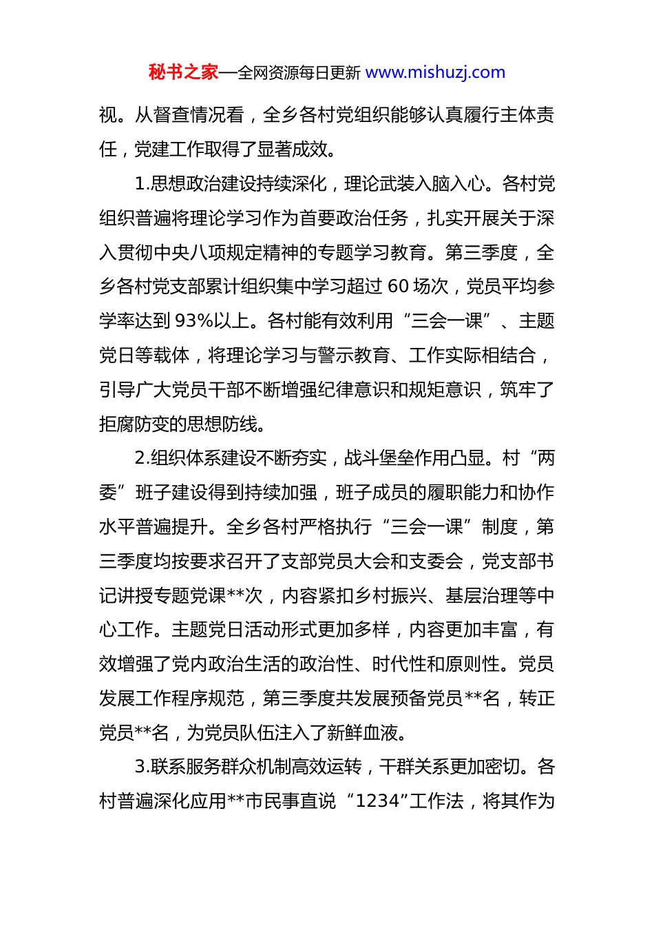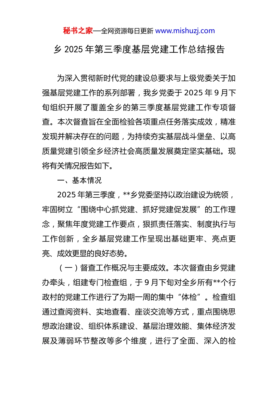 秘书之家—全网资源每日更新 www.mishuzj.com乡 2025 年第三季度基层党建工作总结报告 为深入贯彻新时代党的建设总要求与上级党委关于加强基层党建工作的系列部署,我乡党委于 2025 年 9 月下旬组织开展了覆盖全乡的第三季度基层党建工作专项督查。本次督查旨在全面检验各项重点任务落实成效,精准发现并解决存在的问题,为持续夯实基层战斗堡垒、以高质量党建引领全乡经济社会高质量发展奠定坚实基础。现将有关情况报告如下。一、基本情况2025 年第三季度,**乡党委坚持以政治建设为统领,牢固树立“围绕中心抓党建、抓好党建促发展”的工作理念,聚焦年度党建工作要点,狠抓责任落实、制度执行与工作创新,全乡基层党建工作呈现出基础更牢、亮点更亮、成效更显的良好态势。(一)督查工作概况与主要成效。本次督查由乡党建办牵头,组建专门检查组,于 9 月下旬对全乡所有**个行政村的党建工作进行了为期一周的集中“体检”。检查组通过查阅资料、实地查看、座谈交流等方式,重点围绕思想政治建设、组织体系建设、基层治理效能、集体经济发展及薄弱环节整改等多个维度,进行了全面、深入的检秘书之家—全网资源每日更新 www.mishuzj.com视。从督查情况看,全乡各村党组织能够认真履行主体责任,党建工作取得了显著成效。1.思想政治建设持续深化,理论武装入脑入心。各村党组织普遍将理论学习作为首要政治任务,扎实开展关于深入贯彻中央八项规定精神的专题学习教育。第三季度,全乡各村党支部累计组织集中学习超过 60 场次,党员平均参学率达到 93%以上。各村能有效利用“三会一课”、主题党日等载体,将理论学习与警示教育、工作实际相结合,引导广大党员干部不断增强纪律意识和规矩意识,筑牢了拒腐防变的思想防线。2.组织体系建设不断夯实,战斗堡垒作用凸显。村“两委”班子建设得到持续加强,班子成员的履职能力和协作水平普遍提升。全乡各村严格执行“三会一课”制度,第三季度均按要求召开了支部党员大会和支委会,党支部书记讲授专题党课**次,内容紧扣乡村振兴、基层治理等中心工作。主题党日活动形式更加多样,内容更加丰富,有效增强了党内政治生活的政治性、时代性和原则性。党员发展工作程序规范,第三季度共发展预备党员**名,转正党员**名,为党员队伍注入了新鲜血液。3.联系服务群众机制高效运转,干群关系更加密切。各村普遍深化应用**市民事直说“1234”工作法,将其作为秘书之家—全网资源每日更新 www.mishuzj.com化解矛盾、服务群众的重要抓手。据不完全统计,第三季度全乡通过该工作法累计收集并解决群众反映的各类问题超过 180 件,涉及基础设施维修、邻里纠纷调解、惠农政策咨询等多个方面,办结率达到 98%,群众满意度显著提升。村干部坐班值班制度得到有效落实,确保了群众“找得到人、办得了事”,畅通了服务群众的“最后一公里”。4.民主治理与监督程序严格落实,决策科学化水平提升。“四议两公开”民主决策机制在村级重大事项决策中得到刚性执行。在**村的小微水体整治项目、**村的文化广场升级改造等事务中,均严格履行了党支部提议、村“两委”会商议、党员大会审议和村民代表会议决议的程序,决策过程与结果及时公开,有效保障了村民的知情权、参与权和监督权,从源头上预防了决策失误和廉政风险。5.村级集体经济发展取得新突破,乡村振兴根基更稳。各村党组织积极探索发展壮大村级集体经济的有效路径。截至 2025 年 9 月底,全乡**个村集体经济总收入达到410 万元,同比增长 18%,全面消除了集体经济“空壳村”。其中,**村依托本地生态资源优势,发展“党建+生态旅游”模式,第三季度接待游客超 5000 人次,集体增收秘书之家—全网资源每日更新 www.mishuzj.com近 30 万元。**村通过盘活闲置土地资源,引进特色种植合作社,实现了土地租金和劳务收入双增长。6.薄弱环节整顿提升成效显著,后进转化动态清零。针对年初排查出的 2 个软弱涣散基层党组织,乡党委严格落实“一名乡领导联村、一个工作队驻村、一名第一书记到村”的“三个一”帮扶措施,精准施策、靶向发力。通过建强班子、完善制度、发展产业等一系...