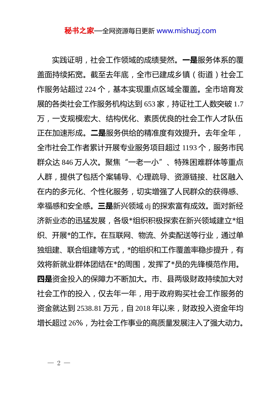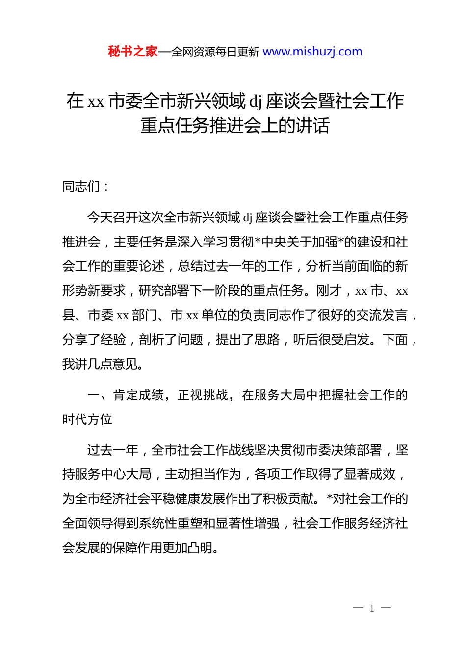 秘书之家—全网资源每日更新 www.mishuzj.com在 xx 市委全市新兴领域 dj 座谈会暨社会工作重点任务推进会上的讲话同志们:今天召开这次全市新兴领域 dj 座谈会暨社会工作重点任务推进会,主要任务是深入学习贯彻*中央关于加强*的建设和社会工作的重要论述,总结过去一年的工作,分析当前面临的新形势新要求,研究部署下一阶段的重点任务。刚才,xx 市、xx县、市委 xx 部门、市 xx 单位的负责同志作了很好的交流发言,分享了经验,剖析了问题,提出了思路,听后很受启发。下面,我讲几点意见。一、肯定成绩,正视挑战,在服务大局中把握社会工作的时代方位过去一年,全市社会工作战线坚决贯彻市委决策部署,坚持服务中心大局,主动担当作为,各项工作取得了显著成效,为全市经济社会平稳健康发展作出了积极贡献。*对社会工作的全面领导得到系统性重塑和显著性增强,社会工作服务经济社会发展的保障作用更加凸明。— 1 —秘书之家—全网资源每日更新 www.mishuzj.com实践证明,社会工作领域的成绩斐然。一是服务体系的覆盖面持续拓宽。截至去年底,全市已建成乡镇(街道)社会工作服务站超过 224 个,基本实现重点区域全覆盖。全市培育发展的各类社会工作服务机构达到 653 家,持证社工人数突破 1.7万,一支规模宏大、结构优化、素质优良的社会工作人才队伍正在加速形成。二是服务供给的精准度有效提升。去年全年,全市社会工作者累计开展专业服务项目超过 1193 个,服务市民群众达 846 万人次。聚焦“一老一小”、特殊困难群体等重点人群,提供了包括个案辅导、心理疏导、资源链接、社区融入在内的多元化、个性化服务,切实增强了人民群众的获得感、幸福感和安全感。三是新兴领域 dj 的探索富有成效。面对新经济新业态的迅猛发展,各级*组织积极探索在新兴领域建立*组织、开展*的工作。在互联网、物流、外卖配送等行业,通过单独组建、联合组建等方式,*的组织和工作覆盖率稳步提升,有效将新就业群体团结在*的周围,发挥了*员的先锋模范作用。四是资金投入的保障力不断加大。市、县两级财政持续加大对社会工作的投入,仅去年一年,用于政府购买社会工作服务的资金就达到 2538.81 万元,自 2018 年以来,财政投入资金年均增长超过 26%,为社会工作事业的高质量发展注入了强大动力。— 2 —秘书之家—全网资源每日更新 www.mishuzj.com在肯定成绩的同时,也必须清醒地认识到工作中存在的短板和不足。比如,社会工作发展不平衡不充分的问题依然存在,部分区域的专业服务能力有待加强;新兴领域 dj 工作还存在一些“盲点”和“空白点”,*组织发挥作用的有效途径尚需进一步探索;社会工作专业人才的激励保障机制还不够完善,职业吸引力有待提高;跨部门、跨领域的协同联动机制还不够顺畅,资源整合、力量统筹的效能没有完全发挥出来。对于这些问题,必须高度重视,在今后的工作中采取有力措施,切实加以解决。二、提高站位,深化认识,从战略高度理解加强新兴领域dj 和社会工作的极端重要性做好新时代新兴领域 dj 和社会工作,是一项严肃的政治任务,更是一项关系长远的基础性工程。必须站在巩固*的执政基础、推进国家治理体系和治理能力现代化的高度,深刻把握其蕴含的战略意义。第一,这是巩固*的执政基础的固本之举。随着经济社会结构的深刻变革,社会阶层日益分化,新的社会群体不断涌现。互联网从业人员、快递员、网约车司机、网络主播等新就业形态劳动者,已经成为经济社会发展中不可忽视的重要力量。这些新兴领域是*的群众工作的新阵地,也是*的建设需要着力开— 3 —秘书之家—全网资源每日更新 www.mishuzj.com拓的新空间。只有把*组织建在他们身边,把*的工作做到他们心坎上,才能把这些新生力量最广泛地团结和凝聚在*的周围,不断夯实*在城市的执政根基,确保*的路线方针政策在基层得到不折不扣的贯彻执行。第二,这是推进国家治理现代化的必然要求。社会工作是社会建设的重要组成部分,是国家治理体系的重要一环。在社会转型期,各种社会矛盾和风险隐患交织叠加,对社会治理提出了更高要求。专业化的社会工作,能够运用其专业知...