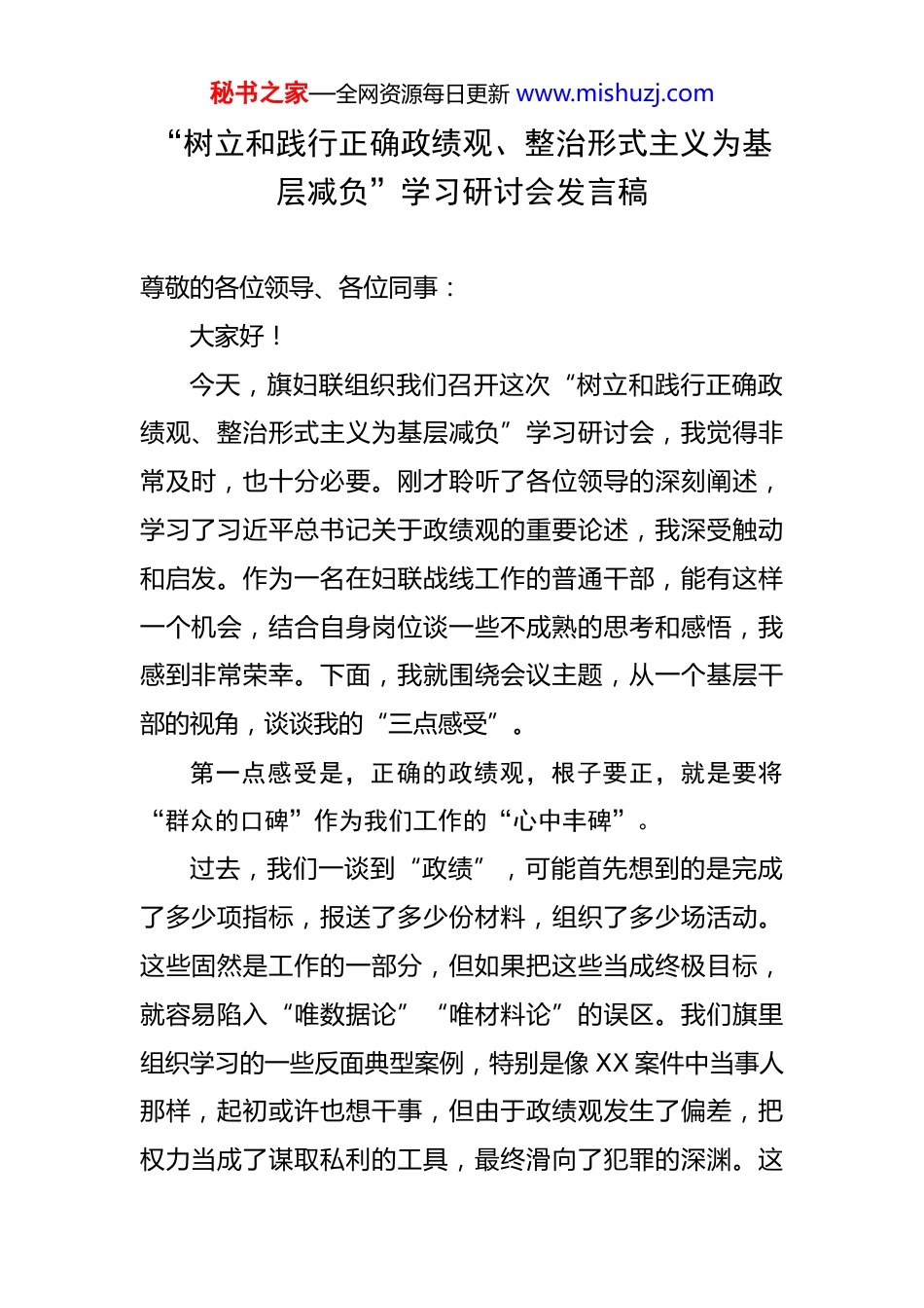 秘书之家—全网资源每日更新 www.mishuzj.com“树立和践行正确政绩观、整治形式主义为基层减负”学习研讨会发言稿 尊敬的各位领导、各位同事:大家好!今天,旗妇联组织我们召开这次“树立和践行正确政绩观、整治形式主义为基层减负”学习研讨会,我觉得非常及时,也十分必要。刚才聆听了各位领导的深刻阐述,学习了习近平总书记关于政绩观的重要论述,我深受触动和启发。作为一名在妇联战线工作的普通干部,能有这样一个机会,结合自身岗位谈一些不成熟的思考和感悟,我感到非常荣幸。下面,我就围绕会议主题,从一个基层干部的视角,谈谈我的“三点感受”。第一点感受是,正确的政绩观,根子要正,就是要将“群众的口碑”作为我们工作的“心中丰碑”。过去,我们一谈到“政绩”,可能首先想到的是完成了多少项指标,报送了多少份材料,组织了多少场活动。这些固然是工作的一部分,但如果把这些当成终极目标,就容易陷入“唯数据论”“唯材料论”的误区。我们旗里组织学习的一些反面典型案例,特别是像 XX 案件中当事人那样,起初或许也想干事,但由于政绩观发生了偏差,把权力当成了谋取私利的工具,最终滑向了犯罪的深渊。这秘书之家—全网资源每日更新 www.mishuzj.com些教训是惨痛的,它时刻警醒我们,政绩为谁而树、树什么样的政绩、靠什么树政绩,是必须始终想清楚、弄明白的根本问题。对我而言,正确的政绩观其实很朴素。它不是会议记录本上写得有多厚,也不是宣传报道里上镜了多少次。它是我们走进社区、深入牧区时,妇女姐妹们愿不愿意跟我们说心里话;是她们遇到难处时,第一个想到的是不是找妇联;是我们在帮助她们解决了实际困难后,从她们脸上看到的笑容和眼中闪烁的泪光。这些瞬间,才是对我们工作最有分量的肯定,是我们心里最踏实的“政绩”。就像我们旗里一些创新做法,推行“XX 秒办”工作机制,就是要第一时间回应群众关切。这种把群众“急难愁盼”放在首位的态度,就是我们应该追求的政绩。第二点感受是,形式主义的“紧箍咒”松一寸,我们服务基层的脚步就能进一尺。坦白说,基层工作千头万绪,我们都曾或多或少地被形式主义所困扰。曾经有一段时间,“指尖上的负担”尤为突出,手机里各种工作群消息不断,不仅要时刻关注,还要及时“接龙”回应。有时为了迎接一次检查,需要提前几天就开始准备堆积如山的台账资料,反复打磨汇报内容,甚至还要布置会场、安排路线。我记得之前有个新闻报道,提到有基层单位在进行安全检查时,一天之内要求秘书之家—全网资源每日更新 www.mishuzj.com企业对过去一整年的安全生产、消防、环保等多个方面进行“地毯式”的自查和汇报。这种做法看似“高标准、严要求”,实则耗费了基层大量的时间和精力,却未必能真正发现和解决问题。这种状况的危害是显而易见的。它让我们这些本应“身入”基层的干部,却常常“心不入”,大量的时间和精力被消耗在这些无谓的事务中,真正用于深入群众、调查研究、解决问题的时间反而被严重挤占了。我常常在想,如果把准备一份材料的时间,用在陪一位遭遇家暴的妇女去申请法律援助上;如果把开一个冗长会议的时间,用在为一位“两癌”患病母亲申请救助金上,我们的工作会更有温度,也更有价值。令人欣慰的是,近年来,从中央到地方,整治形式主义为基层减负的决心和力度越来越大。我们能明显感觉到,会议文件在精简,督查考核在优化。我看到有材料说,有的地方通过改革,考核指标总量精简了 40%以上;通过数据共享,实现了从“找基层要报表”到“在平台取数据”的转变。这些变化让我们基层干部拍手称快。这不仅是为我们“松绑”,更是为我们“赋能”,让我们能从文山会海和过度留痕中解脱出来,把更多的精力投入到抓落实、干实事、求实效上。第三点感受是,为基层减负的最终目的,是为妇女群秘书之家—全网资源每日更新 www.mishuzj.com众的幸福“增能”。减负不是目的,而是手段。减负减下来的时间、精力,应该毫不犹豫地投入到服务妇女群众的第一线。这才是我们践行正确政绩观的落脚点。在我们 XX 旗,妇联工作有很多鲜活的实践。在促进妇女创业就业方面,我们旗的 XX 绣毯厂就...