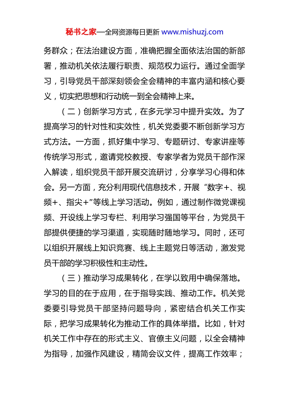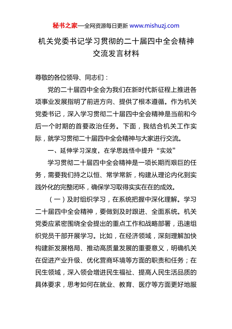 秘书之家—全网资源每日更新 www.mishuzj.com机关党委书记学习贯彻的二十届四中全会精神交流发言材料 尊敬的各位领导、同志们:党的二十届四中全会为我们在新时代新征程上推进各项事业发展指明了前进方向、提供了根本遵循。作为机关党委书记,深入学习贯彻二十届四中全会精神是当前和今后一个时期的首要政治任务。下面,我结合机关工作实际,就学习贯彻二十届四中全会精神与大家进行交流。一、延伸学习深度,在学思践悟中提升“实效”学习贯彻二十届四中全会精神是一项长期而艰巨的任务,需要我们持之以恒、常学常新,构建从理论内化到实践外化的完整闭环,确保学习取得实实在在的成效。(一)及时组织学习,在系统把握中深化理解。学习二十届四中全会精神,要做到及时跟进、全面系统。机关党委应紧密围绕全会提出的重点工作和战略部署,迅速组织党员干部开展学习。比如,在经济领域,深刻理解加快构建新发展格局、推动高质量发展的重要意义,明确机关在促进产业升级、优化营商环境等方面的职责和任务;在民生领域,深入领会增进民生福祉、提高人民生活品质的具体要求,思考如何在就业、教育、医疗等方面更好地服秘书之家—全网资源每日更新 www.mishuzj.com务群众;在法治建设方面,准确把握全面依法治国的新部署,推动机关依法履行职责、规范权力运行。通过全面学习,引导党员干部深刻领会全会精神的丰富内涵和核心要义,切实把思想和行动统一到全会精神上来。(二)创新学习方式,在多元学习中提升实效。为了提高学习的针对性和实效性,机关党委要不断创新学习方式方法。一方面,抓好集中学习、专题研讨、专家讲座等传统学习形式,邀请党校教授、专家学者为党员干部作深入解读,组织党员干部开展交流研讨,分享学习心得和体会。另一方面,充分利用现代信息技术,开展“数字+、视频+、指尖+”等线上学习活动。例如,通过制作微党课视频、开设线上学习专栏、利用学习强国等平台,为党员干部提供便捷的学习渠道,实现随时随地学习。同时,还可以组织开展线上知识竞赛、线上主题党日等活动,激发党员干部的学习积极性和主动性。(三)推动学习成果转化,在学以致用中确保落地。学习的目的在于应用,在于指导实践、推动工作。机关党委要引导党员干部坚持问题导向,紧密结合机关工作实际,把学习成果转化为推动工作的具体举措。比如,针对机关工作中存在的形式主义、官僚主义问题,以全会精神为指导,加强作风建设,精简会议文件,提高工作效率;秘书之家—全网资源每日更新 www.mishuzj.com在服务群众方面,结合“我为群众办实事”实践活动,聚焦群众关心的热点难点问题,制定切实可行的解决方案,切实增强群众的获得感、幸福感和安全感。通过将全会精神转化为实际行动,确保全会精神在机关工作中落地生根、开花结果。二、拓展落实广度,在融合贯通中增强“精度”学习贯彻二十届四中全会精神,需要我们从多个维度发力,做到上下贯通、内外结合,确保落实工作精准有效。(一)向上对标,把握正确方向。机关党委要认真学习贯彻二十届四中全会精神,深刻理解精神实质、把握核心要义,积极主动与全会精神对表对标。在思想上,要坚定理想信念,增强“四个意识”、坚定“四个自信”、做到“两个维护”,始终与党中央保持高度一致;在目标上,要围绕全会提出的战略目标和任务,结合机关工作实际,制定切实可行的工作计划和措施,确保各项工作与全会精神同向同行;在行动上,要坚决贯彻党中央的决策部署,做到不打折扣、不搞变通,以实际行动推动全会精神在机关落地落实。(二)向下贯通,抓好基层落实。基层是贯彻落实全会精神的“最后一公里”。机关党委要坚持基层至上、落秘书之家—全网资源每日更新 www.mishuzj.com实至上的工作导向,推动工作重心下移、力量资源下沉。要结合机关日常业务工作,深入基层一线开展调查研究,了解基层群众的需求和诉求,帮助基层解决实际问题。例如,在乡村振兴工作中,组织机关党员干部深入农村,为农村产业发展、基础设施建设、生态环境保护等提供支持和帮助;在社区治理方面,积极参与社区共建,协助社区解决环境卫生、安全稳定等问题。通过深入基...