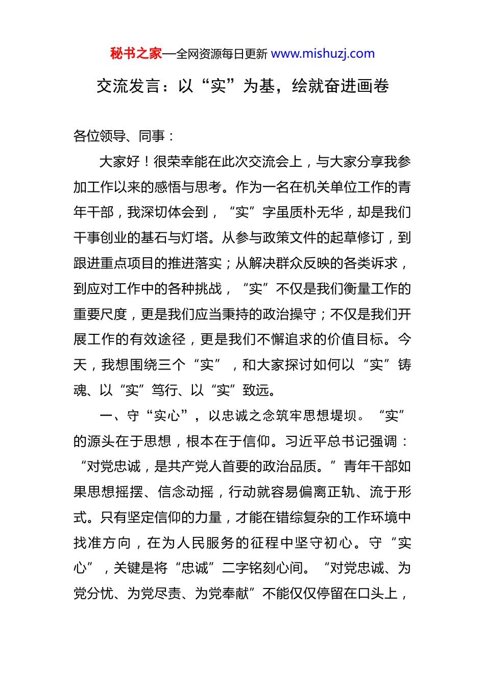 秘书之家—全网资源每日更新 www.mishuzj.com交流发言:以“实”为基,绘就奋进画卷 各位领导、同事:大家好!很荣幸能在此次交流会上,与大家分享我参加工作以来的感悟与思考。作为一名在机关单位工作的青年干部,我深切体会到,“实”字虽质朴无华,却是我们干事创业的基石与灯塔。从参与政策文件的起草修订,到跟进重点项目的推进落实;从解决群众反映的各类诉求,到应对工作中的各种挑战,“实”不仅是我们衡量工作的重要尺度,更是我们应当秉持的政治操守;不仅是我们开展工作的有效途径,更是我们不懈追求的价值目标。今天,我想围绕三个“实”,和大家探讨如何以“实”铸魂、以“实”笃行、以“实”致远。一、守“实心”,以忠诚之念筑牢思想堤坝。“实”的源头在于思想,根本在于信仰。习近平总书记强调:“对党忠诚,是共产党人首要的政治品质。”青年干部如果思想摇摆、信念动摇,行动就容易偏离正轨、流于形式。只有坚定信仰的力量,才能在错综复杂的工作环境中找准方向,在为人民服务的征程中坚守初心。守“实心”,关键是将“忠诚”二字铭刻心间。“对党忠诚、为党分忧、为党尽责、为党奉献”不能仅仅停留在口头上,秘书之家—全网资源每日更新 www.mishuzj.com更要转化为日常工作中的实际行动。青年干部要时常反思:是否把领导的表扬当作工作的唯一目标,而忽略了工作的实际成效和群众的真实感受?是否把完成任务当作工作的终点,而忽视了工作的质量和长远影响?只有将“为党和人民事业奋斗”的崇高理想,转化为“立足岗位踏实干”的具体行动,实现“个人成长”与“党和人民事业发展”相统一,才能在各种诱惑面前坚守原则,在迷茫困惑中保持清醒。就像一位前辈说的:“心中有党和人民,前行的路就不会走歪。”二、重“实行”,以拼搏之劲练就过硬本领。“实”的关键在于行动,核心在于落实。机关工作千头万绪,从政务服务的优化提升,到政策法规的宣传解读;从协调各方的沟通联络,到推动工作的督促检查,每一项任务都需要我们具备脚踏实地、真抓实干的精神。青年干部身处机关工作的前沿,既要避免“眼高手低”的浮躁,也要杜绝“得过且过”的懈怠,必须以持之以恒的行动,把各项工作落到实处。重“实行”,要坚决抵制“形式主义”“官僚主义”。青年干部有活力、有激情,但不能做“表面文章”的制造者,更不能当“推诿扯皮的旁观者”。面对紧急任务,要像“冲锋战士”一样勇往直前,主动承担责任,在困难重重的工作中锻炼自己;面对复杂问题,要像秘书之家—全网资源每日更新 www.mishuzj.com“技术专家”一样深入钻研,把“难题清单”转化为“成果清单”;面对群众期盼,要像“贴心朋友”一样真诚服务,以“马上就办、办就办好”的态度赢得信任。要时刻牢记,组织评价干部,从不看说了多少豪言壮语,只看干了多少实事好事。三、求“实效”,以利民之责校准价值坐标。“实”的落脚点在于结果,核心在于成效。“利民之事,丝发必兴;厉民之事,毫末必去。”青年干部开展工作,不能只追求表面的政绩、短期的效果,更要关注长远的利益、群众的需求,让每一项工作都能经得起实践、历史和人民的检验。求“实效”,必须把“群众满意度”作为最高准则。工作成效如何,不能只看文件报告、统计数据,而要多到基层一线了解实际情况、多听群众的真实声音。出台的政策是否符合实际需求、是否具有可操作性?推进的项目是否真正惠及民生、是否促进了经济社会发展?解决的问题是否是群众最关心、最直接、最现实的利益问题?这些都要用事实说话、用数据支撑、用口碑检验。就像培育花朵,不能只看花开时的艳丽,更要看花谢后是否结出了果实——群众的获得感、幸福感、安全感,才是我们最应追求的“硕果”。各位领导、同事,青年干部的成长没有捷径可走,机秘书之家—全网资源每日更新 www.mishuzj.com关事业的长远发展容不得丝毫虚假。守“实心”,能让我们的信仰更加坚定;重“实行”,能让我们的担当更加有力;求“实效”,能让我们的初心更加闪亮。让我们以“实”为笔、以“干”为墨,在机关工作的舞台上书写“不负韶华、不负使命”的精彩篇章!谢谢大家!