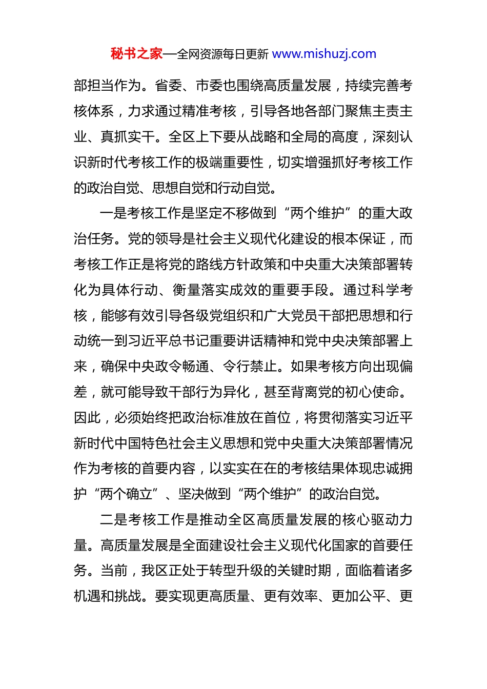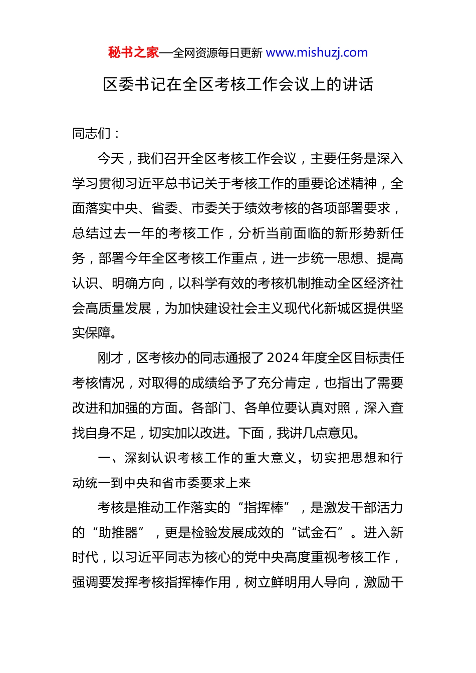 秘书之家—全网资源每日更新 www.mishuzj.com区委书记在全区考核工作会议上的讲话 同志们:今天,我们召开全区考核工作会议,主要任务是深入学习贯彻习近平总书记关于考核工作的重要论述精神,全面落实中央、省委、市委关于绩效考核的各项部署要求,总结过去一年的考核工作,分析当前面临的新形势新任务,部署今年全区考核工作重点,进一步统一思想、提高认识、明确方向,以科学有效的考核机制推动全区经济社会高质量发展,为加快建设社会主义现代化新城区提供坚实保障。刚才,区考核办的同志通报了 2024 年度全区目标责任考核情况,对取得的成绩给予了充分肯定,也指出了需要改进和加强的方面。各部门、各单位要认真对照,深入查找自身不足,切实加以改进。下面,我讲几点意见。一、深刻认识考核工作的重大意义,切实把思想和行动统一到中央和省市委要求上来考核是推动工作落实的“指挥棒”,是激发干部活力的“助推器”,更是检验发展成效的“试金石”。进入新时代,以习近平同志为核心的党中央高度重视考核工作,强调要发挥考核指挥棒作用,树立鲜明用人导向,激励干秘书之家—全网资源每日更新 www.mishuzj.com部担当作为。省委、市委也围绕高质量发展,持续完善考核体系,力求通过精准考核,引导各地各部门聚焦主责主业、真抓实干。全区上下要从战略和全局的高度,深刻认识新时代考核工作的极端重要性,切实增强抓好考核工作的政治自觉、思想自觉和行动自觉。一是考核工作是坚定不移做到“两个维护”的重大政治任务。党的领导是社会主义现代化建设的根本保证,而考核工作正是将党的路线方针政策和中央重大决策部署转化为具体行动、衡量落实成效的重要手段。通过科学考核,能够有效引导各级党组织和广大党员干部把思想和行动统一到习近平总书记重要讲话精神和党中央决策部署上来,确保中央政令畅通、令行禁止。如果考核方向出现偏差,就可能导致干部行为异化,甚至背离党的初心使命。因此,必须始终把政治标准放在首位,将贯彻落实习近平新时代中国特色社会主义思想和党中央重大决策部署情况作为考核的首要内容,以实实在在的考核结果体现忠诚拥护“两个确立”、坚决做到“两个维护”的政治自觉。二是考核工作是推动全区高质量发展的核心驱动力量。高质量发展是全面建设社会主义现代化国家的首要任务。当前,我区正处于转型升级的关键时期,面临着诸多机遇和挑战。要实现更高质量、更有效率、更加公平、更秘书之家—全网资源每日更新 www.mishuzj.com可持续、更为安全的发展,就必须有一套科学有效的考核机制来牵引和推动。过去一年,全区上下在考核的引导和激励下,经济运行稳中有进,创新动能持续增强,民生福祉不断改善,城市品质显著提升,这些都离不开考核这根“指挥棒”的精准发力。实践证明,哪里考核抓得紧、抓得实,哪里发展就快、效果就好。因此,我们要继续深化考核改革,用高质量考核体系引领各部门、各领域、各环节聚焦高质量发展,以硬指标、硬杠杆推动硬任务、硬落实,确保全区各项事业始终沿着高质量发展的正确轨道前进。三是考核工作是激励干部担当作为、提升治理效能的重要抓手。干部是事业发展的决定性因素。没有一支忠诚干净担当、奋发有为的干部队伍,再好的蓝图也难以变为现实。考核工作的本质是选人用人、管人促事,目的是要通过科学的评价,把优秀干部识别出来、使用起来,把懒政怠政者警醒起来、鞭策起来,真正形成能者上、优者奖、庸者下、劣者汰的鲜明导向。这既是对干部政治素质、业务能力、工作作风的全面检验,更是对干部担当精神、创新意识、实干成效的精准画像。通过强化考核结果运用,能够有效传导压力、激发动力、释放活力,让想干事、能干事、干成事的干部有舞台、有奔头,让混日子、秘书之家—全网资源每日更新 www.mishuzj.com不作为的干部坐不住、站不稳,从而全面提升我区的治理体系和治理能力现代化水平。二、准确把握考核工作导向,确保全区各项事业沿着正确方向前进考核工作的生命力在于导向的科学性和正确性。只有导向鲜明、精准有力,才能真正考出精气神、考出高质量、考出新作为。全区各级党组织和广大干部要牢固树立正确...