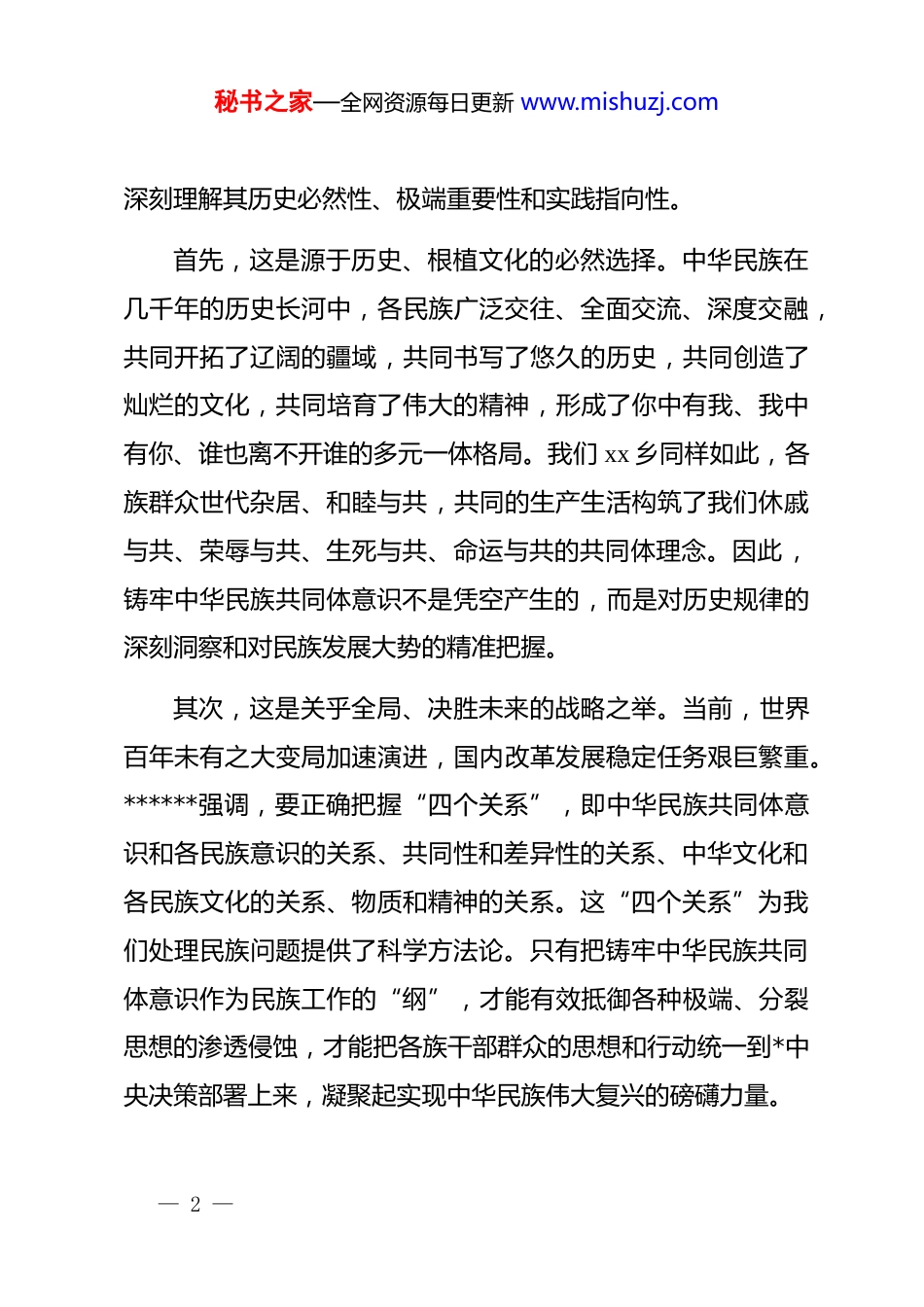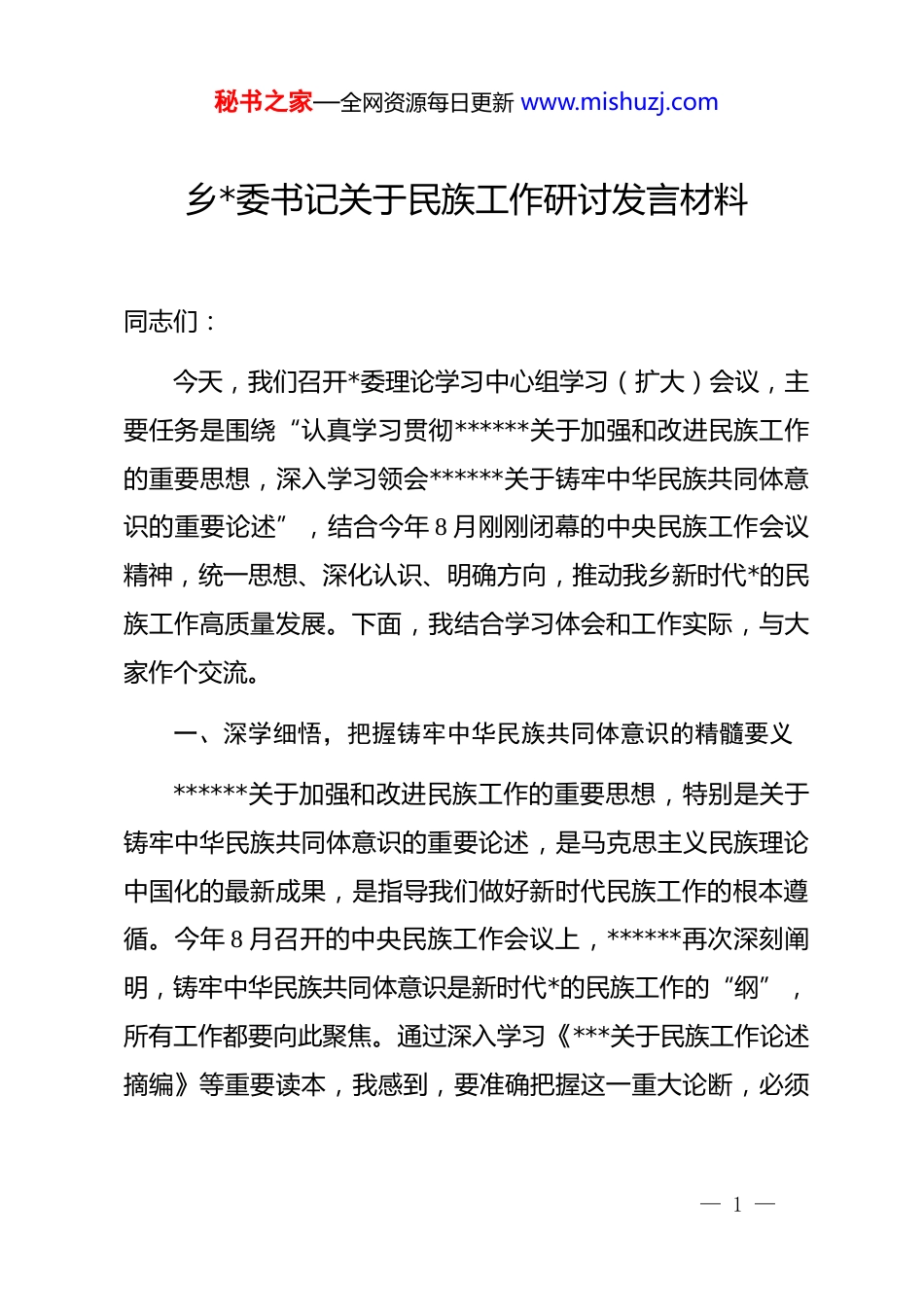 秘书之家—全网资源每日更新 www.mishuzj.com乡*委书记关于民族工作研讨发言材料同志们:今天,我们召开*委理论学习中心组学习(扩大)会议,主要任务是围绕“认真学习贯彻******关于加强和改进民族工作的重要思想,深入学习领会******关于铸牢中华民族共同体意识的重要论述”,结合今年 8 月刚刚闭幕的中央民族工作会议精神,统一思想、深化认识、明确方向,推动我乡新时代*的民族工作高质量发展。下面,我结合学习体会和工作实际,与大家作个交流。一、深学细悟,把握铸牢中华民族共同体意识的精髓要义******关于加强和改进民族工作的重要思想,特别是关于铸牢中华民族共同体意识的重要论述,是马克思主义民族理论中国化的最新成果,是指导我们做好新时代民族工作的根本遵循。今年 8 月召开的中央民族工作会议上,******再次深刻阐明,铸牢中华民族共同体意识是新时代*的民族工作的“纲”,所有工作都要向此聚焦。通过深入学习《***关于民族工作论述摘编》等重要读本,我感到,要准确把握这一重大论断,必须— 1 —秘书之家—全网资源每日更新 www.mishuzj.com深刻理解其历史必然性、极端重要性和实践指向性。首先,这是源于历史、根植文化的必然选择。中华民族在几千年的历史长河中,各民族广泛交往、全面交流、深度交融,共同开拓了辽阔的疆域,共同书写了悠久的历史,共同创造了灿烂的文化,共同培育了伟大的精神,形成了你中有我、我中有你、谁也离不开谁的多元一体格局。我们 xx 乡同样如此,各族群众世代杂居、和睦与共,共同的生产生活构筑了我们休戚与共、荣辱与共、生死与共、命运与共的共同体理念。因此,铸牢中华民族共同体意识不是凭空产生的,而是对历史规律的深刻洞察和对民族发展大势的精准把握。其次,这是关乎全局、决胜未来的战略之举。当前,世界百年未有之大变局加速演进,国内改革发展稳定任务艰巨繁重。******强调,要正确把握“四个关系”,即中华民族共同体意识和各民族意识的关系、共同性和差异性的关系、中华文化和各民族文化的关系、物质和精神的关系。这“四个关系”为我们处理民族问题提供了科学方法论。只有把铸牢中华民族共同体意识作为民族工作的“纲”,才能有效抵御各种极端、分裂思想的渗透侵蚀,才能把各族干部群众的思想和行动统一到*中央决策部署上来,凝聚起实现中华民族伟大复兴的磅礴力量。— 2 —秘书之家—全网资源每日更新 www.mishuzj.com最后,这是指导实践、推动发展的行动指南。铸牢中华民族共同体意识,最终要落到行动上、体现在效果上。它要求我们不仅要算经济账、发展账,更要算民族团结的政治账、长远账。推动民族地区发展,不能简单地就经济抓经济,而是要着眼于加强中华民族的向心力、凝聚力。无论是推动产业发展、促进就业,还是提升教育医疗水平,都必须有利于增进各族群众对伟大祖国、中华民族、中华文化、中国共产*、中国特色社会主义的认同,让大家在共同走向社会主义现代化的进程中,心手相牵、团结奋进。二、对标对表,审视 xx 乡民族工作存在的短板与不足近年来,我乡*委坚持以 dj 为“红色引擎”,将铸牢中华民族共同体意识贯穿于基层工作的方方面面,取得了一定成效。我们建强组织堡垒,在全乡 13 个村设立“民族工作联络点”;我们激活*员队伍,组建“双语宣讲队”“*员帮扶队”,开展宣讲 15 场,覆盖群众 3600 余人次,120 名*员与困难家庭结对,帮助 108 名群众增收;我们办好惠民实事,开展技能培训 10 期,帮助 261 名群众就近就业,并组织医疗队下到 xx 村、xx 村等偏远村寨义诊;我们深化基层治理,通过“dj+网格”模式,化解各类矛盾纠纷苗头 20 余件。— 3 —秘书之家—全网资源每日更新 www.mishuzj.com成绩值得肯定,但我们更要清醒地看到,对标中央最新要求和群众期盼,工作中还存在一些差距和短板,主要体现在“三度”不够上。一是理论宣传的“深度”有待挖掘。我们的“双语宣讲”更多时候还停留在政策条文的“翻译”和解读层面,对于“为什么铸牢、铸牢什么、怎么铸牢”等深层次问题,讲得还不够透彻、不够生动。如何用群众喜闻乐见的方式,将中华民族共...