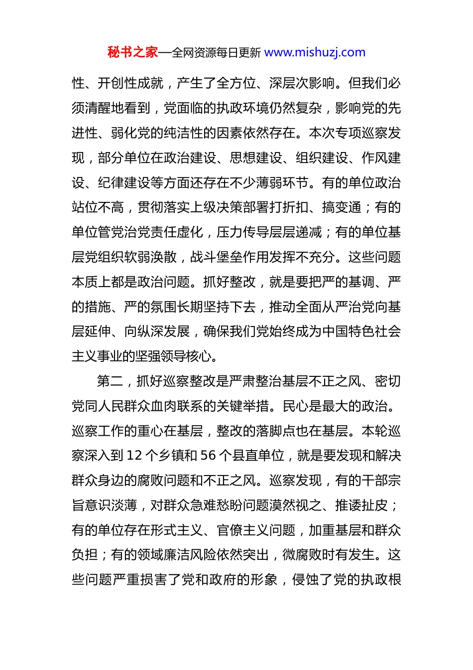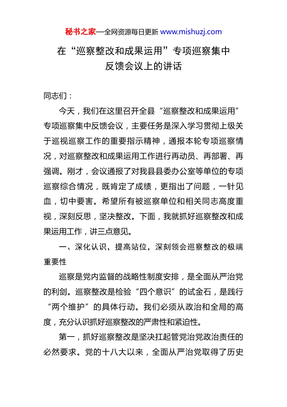 秘书之家—全网资源每日更新 www.mishuzj.com在“巡察整改和成果运用”专项巡察集中反馈会议上的讲话 同志们:今天,我们在这里召开全县“巡察整改和成果运用”专项巡察集中反馈会议,主要任务是深入学习贯彻上级关于巡视巡察工作的重要指示精神,通报本轮专项巡察情况,对巡察整改和成果运用工作进行再动员、再部署、再强调。刚才,会议通报了对我县县委办公室等单位的专项巡察综合情况,既肯定了成绩,更指出了问题,一针见血,切中要害。希望所有被巡察单位和相关同志高度重视,深刻反思,坚决整改。下面,我就抓好巡察整改和成果运用工作,讲三点意见。一、深化认识,提高站位,深刻领会巡察整改的极端重要性巡察是党内监督的战略性制度安排,是全面从严治党的利剑。巡察整改是检验“四个意识”的试金石,是践行“两个维护”的具体行动。我们必须从政治和全局的高度,充分认识抓好巡察整改的严肃性和紧迫性。第一,抓好巡察整改是坚决扛起管党治党政治责任的必然要求。党的十八大以来,全面从严治党取得了历史秘书之家—全网资源每日更新 www.mishuzj.com性、开创性成就,产生了全方位、深层次影响。但我们必须清醒地看到,党面临的执政环境仍然复杂,影响党的先进性、弱化党的纯洁性的因素依然存在。本次专项巡察发现,部分单位在政治建设、思想建设、组织建设、作风建设、纪律建设等方面还存在不少薄弱环节。有的单位政治站位不高,贯彻落实上级决策部署打折扣、搞变通;有的单位管党治党责任虚化,压力传导层层递减;有的单位基层党组织软弱涣散,战斗堡垒作用发挥不充分。这些问题本质上都是政治问题。抓好整改,就是要把严的基调、严的措施、严的氛围长期坚持下去,推动全面从严治党向基层延伸、向纵深发展,确保我们党始终成为中国特色社会主义事业的坚强领导核心。第二,抓好巡察整改是严肃整治基层不正之风、密切党同人民群众血肉联系的关键举措。民心是最大的政治。巡察工作的重心在基层,整改的落脚点也在基层。本轮巡察深入到 12 个乡镇和 56 个县直单位,就是要发现和解决群众身边的腐败问题和不正之风。巡察发现,有的干部宗旨意识淡薄,对群众急难愁盼问题漠然视之、推诿扯皮;有的单位存在形式主义、官僚主义问题,加重基层和群众负担;有的领域廉洁风险依然突出,微腐败时有发生。这些问题严重损害了党和政府的形象,侵蚀了党的执政根秘书之家—全网资源每日更新 www.mishuzj.com基。我们必须以对人民高度负责的态度,通过扎扎实实的整改,解决一批群众反映强烈的突出问题,查处一批违纪违法的典型案件,完善一批管长远、治根本的制度机制,让人民群众真切感受到全面从严治党就在身边、正风肃纪反腐就在眼前,不断厚植我们党执政的群众基础。第三,抓好巡察整改是推动县域经济社会高质量发展的重要保障。当前,我县正处于转型升级、爬坡过坎的关键时期,改革发展稳定任务艰巨繁重。一个地方的发展环境,首先是政治生态。政治生态好,人心就顺、正气就足,发展就有保障。巡察发现的问题,很多是制约发展的堵点、痛点、难点。有的单位在优化营商环境方面政策不落地、服务不到位;有的单位在项目资金管理上不规范、使用效益不高;有的单位在防范化解重大风险方面存在短板和漏洞。这些问题不解决,高质量发展的蓝图就难以变为现实。我们必须把巡察整改与推动中心工作紧密结合起来,以整改为契机,破除体制机制障碍,激发干部干事创业活力,营造风清气正的政治生态和公平公正的发展环境,为全县经济社会高质量发展提供坚强政治保证。二、聚焦问题,精准施策,以钉钉子精神推动整改落实落细巡察发现问题的目的是解决问题。如果整改不到位,秘书之家—全网资源每日更新 www.mishuzj.com巡察效果就会大打折扣。各被巡察单位要坚持问题导向,发扬钉钉子精神,做到条条要整改、件件有着落。第一,要建立“三张清单”,实行台账管理。整改工作不能大而化之,必须具体化、清单化、责任化。各被巡察单位要对照巡察反馈意见,逐项梳理研究,制定详细的整改方案。核心是要建立“问题清单、任务清单、责任清单”这“三张清单”。问题清单要见人见事,把巡察反馈的问题...