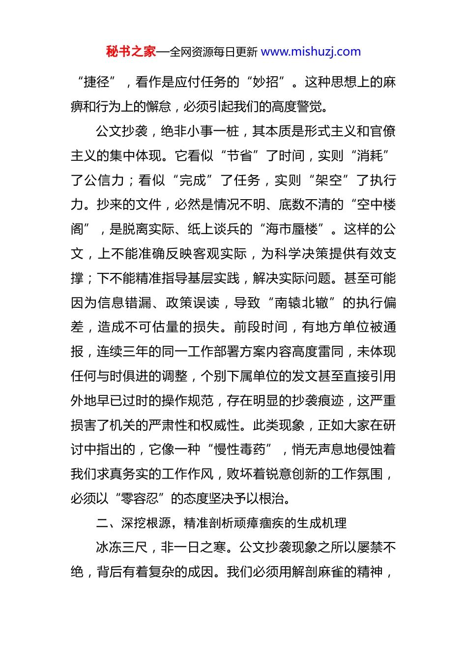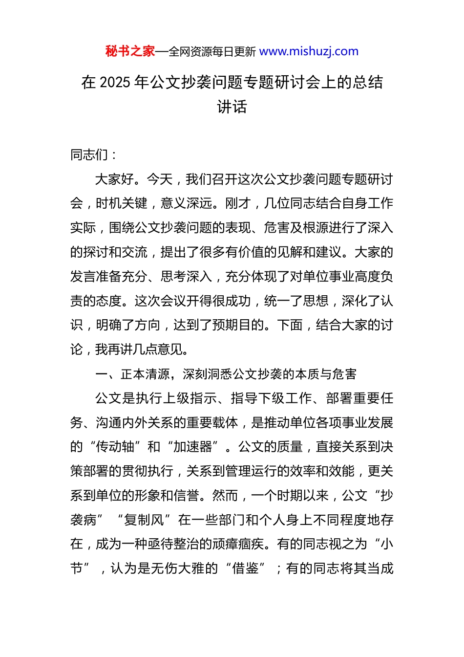 秘书之家—全网资源每日更新 www.mishuzj.com在 2025 年公文抄袭问题专题研讨会上的总结讲话 同志们:大家好。今天,我们召开这次公文抄袭问题专题研讨会,时机关键,意义深远。刚才,几位同志结合自身工作实际,围绕公文抄袭问题的表现、危害及根源进行了深入的探讨和交流,提出了很多有价值的见解和建议。大家的发言准备充分、思考深入,充分体现了对单位事业高度负责的态度。这次会议开得很成功,统一了思想,深化了认识,明确了方向,达到了预期目的。下面,结合大家的讨论,我再讲几点意见。一、正本清源,深刻洞悉公文抄袭的本质与危害公文是执行上级指示、指导下级工作、部署重要任务、沟通内外关系的重要载体,是推动单位各项事业发展的“传动轴”和“加速器”。公文的质量,直接关系到决策部署的贯彻执行,关系到管理运行的效率和效能,更关系到单位的形象和信誉。然而,一个时期以来,公文“抄袭病”“复制风”在一些部门和个人身上不同程度地存在,成为一种亟待整治的顽瘴痼疾。有的同志视之为“小节”,认为是无伤大雅的“借鉴”;有的同志将其当成秘书之家—全网资源每日更新 www.mishuzj.com“捷径”,看作是应付任务的“妙招”。这种思想上的麻痹和行为上的懈怠,必须引起我们的高度警觉。公文抄袭,绝非小事一桩,其本质是形式主义和官僚主义的集中体现。它看似“节省”了时间,实则“消耗”了公信力;看似“完成”了任务,实则“架空”了执行力。抄来的文件,必然是情况不明、底数不清的“空中楼阁”,是脱离实际、纸上谈兵的“海市蜃楼”。这样的公文,上不能准确反映客观实际,为科学决策提供有效支撑;下不能精准指导基层实践,解决实际问题。甚至可能因为信息错漏、政策误读,导致“南辕北辙”的执行偏差,造成不可估量的损失。前段时间,有地方单位被通报,连续三年的同一工作部署方案内容高度雷同,未体现任何与时俱进的调整,个别下属单位的发文甚至直接引用外地早已过时的操作规范,存在明显的抄袭痕迹,这严重损害了机关的严肃性和权威性。此类现象,正如大家在研讨中指出的,它像一种“慢性毒药”,悄无声息地侵蚀着我们求真务实的工作作风,败坏着锐意创新的工作氛围,必须以“零容忍”的态度坚决予以根治。二、深挖根源,精准剖析顽瘴痼疾的生成机理冰冻三尺,非一日之寒。公文抄袭现象之所以屡禁不绝,背后有着复杂的成因。我们必须用解剖麻雀的精神,秘书之家—全网资源每日更新 www.mishuzj.com把病灶找准、把病根挖深。其一,思想认识存在偏差,责任意识淡薄。这是问题的总根源。部分干部未能从政治高度和全局角度认识公文写作的严肃性,将其简单等同于“写材料”的事务性工作。缺乏“文以载道”“文责自负”的敬畏之心,对待工作抱着“交差了事”“蒙混过关”的心态。满足于当“二传手”和“文字搬运工”,不愿下真功夫、苦功夫去调查研究、分析思考,导致写出的公文言之无物、千篇一律。四川某地曾有 18 名领导干部因年终总结照抄照搬、抄袭拼凑而被严肃处理,这正是责任心缺失的典型反证。其二,制度机制存在漏洞,监管约束乏力。这是问题的催化剂。在一些部门,公文起草、审核、签发的全链条管理存在短板。审核把关环节流于形式,满足于审格式、审文字,对内容是否贴合实际、是否具有可操作性、是否存在抄袭套用等实质性问题缺乏严格审查。问责机制不健全,对于发现的抄袭问题,或高高举起、轻轻放下,多以谈话提醒了事,或根本没有形成有效的追责问责闭环,导致抄袭行为的“违规成本”过低,难以形成强有力的震慑。一些单位在被指出“文书抄袭套用”问题后,才着手制定审核规定、明确责任追究,这说明我们的制度建设存在滞后性。秘书之家—全网资源每日更新 www.mishuzj.com其三,考核导向存在偏差,催生“速成”心态。这是问题的指挥棒。一些不科学的考核评价体系,过于强调“留痕管理”,将发文数量、材料厚度作为评判工作成效的依据,甚至搞“千分制”考核。这种导向迫使基层干部将大量精力耗费在“造材料”“补痕迹”上,为了在短时间内拿出“像样”的成果,不得不寻求“东拼西凑”“照搬照抄”的捷径。中央近年来反复强调,要...