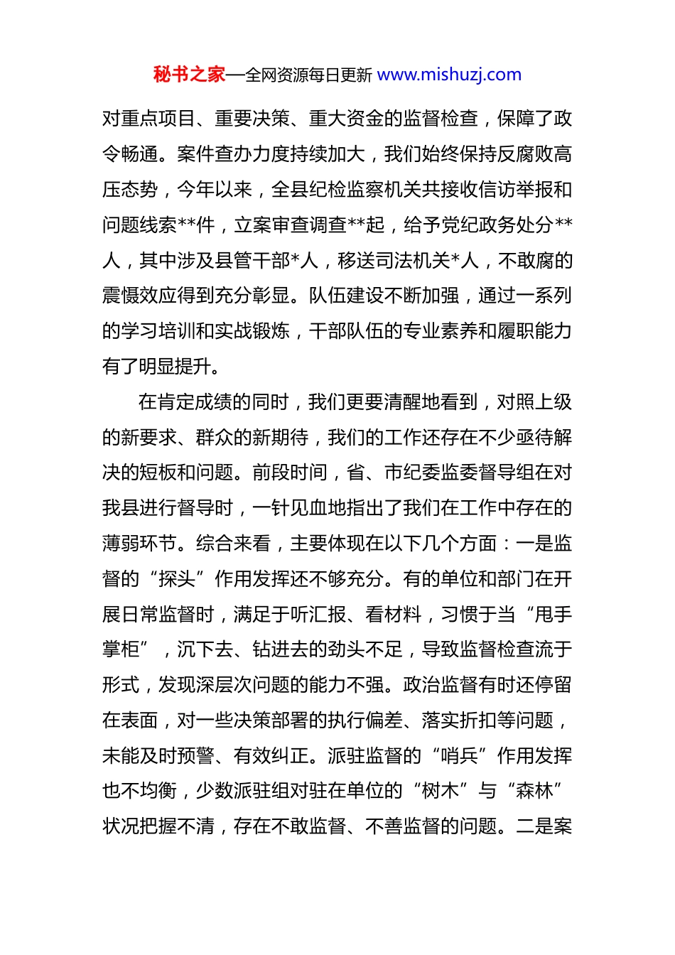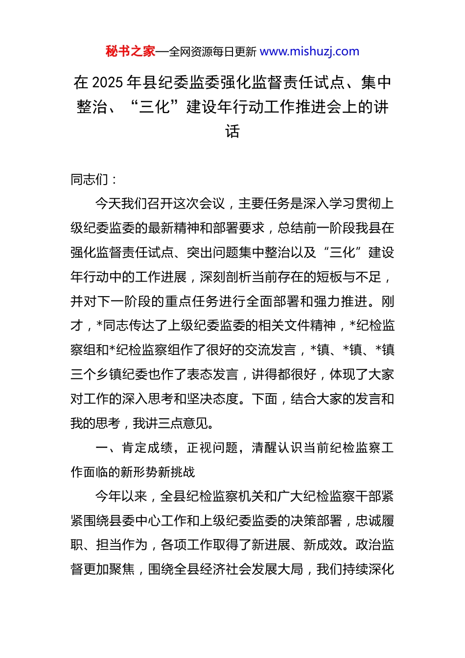 秘书之家—全网资源每日更新 www.mishuzj.com在 2025 年县纪委监委强化监督责任试点、集中整治、“三化”建设年行动工作推进会上的讲话 同志们:今天我们召开这次会议,主要任务是深入学习贯彻上级纪委监委的最新精神和部署要求,总结前一阶段我县在强化监督责任试点、突出问题集中整治以及“三化”建设年行动中的工作进展,深刻剖析当前存在的短板与不足,并对下一阶段的重点任务进行全面部署和强力推进。刚才,*同志传达了上级纪委监委的相关文件精神,*纪检监察组和*纪检监察组作了很好的交流发言,*镇、*镇、*镇三个乡镇纪委也作了表态发言,讲得都很好,体现了大家对工作的深入思考和坚决态度。下面,结合大家的发言和我的思考,我讲三点意见。一、肯定成绩,正视问题,清醒认识当前纪检监察工作面临的新形势新挑战今年以来,全县纪检监察机关和广大纪检监察干部紧紧围绕县委中心工作和上级纪委监委的决策部署,忠诚履职、担当作为,各项工作取得了新进展、新成效。政治监督更加聚焦,围绕全县经济社会发展大局,我们持续深化秘书之家—全网资源每日更新 www.mishuzj.com对重点项目、重要决策、重大资金的监督检查,保障了政令畅通。案件查办力度持续加大,我们始终保持反腐败高压态势,今年以来,全县纪检监察机关共接收信访举报和问题线索**件,立案审查调查**起,给予党纪政务处分**人,其中涉及县管干部*人,移送司法机关*人,不敢腐的震慑效应得到充分彰显。队伍建设不断加强,通过一系列的学习培训和实战锻炼,干部队伍的专业素养和履职能力有了明显提升。在肯定成绩的同时,我们更要清醒地看到,对照上级的新要求、群众的新期待,我们的工作还存在不少亟待解决的短板和问题。前段时间,省、市纪委监委督导组在对我县进行督导时,一针见血地指出了我们在工作中存在的薄弱环节。综合来看,主要体现在以下几个方面:一是监督的“探头”作用发挥还不够充分。有的单位和部门在开展日常监督时,满足于听汇报、看材料,习惯于当“甩手掌柜”,沉下去、钻进去的劲头不足,导致监督检查流于形式,发现深层次问题的能力不强。政治监督有时还停留在表面,对一些决策部署的执行偏差、落实折扣等问题,未能及时预警、有效纠正。派驻监督的“哨兵”作用发挥也不均衡,少数派驻组对驻在单位的“树木”与“森林”状况把握不清,存在不敢监督、不善监督的问题。二是案秘书之家—全网资源每日更新 www.mishuzj.com件查办的“后半篇文章”做得还不够扎实。一些案件查办存在重查处、轻剖析、弱整改的现象。案件办结后,对于案件暴露出的制度漏洞、监管缺失等共性问题,深入剖析不够,提出的纪检监察建议质量不高、针对性不强,导致同类问题在不同领域、不同单位反复发生。案件质量也需进一步提升,在程序规范、证据链完整性等方面,个别案件还存在瑕疵,距离“铁案”标准还有差距。三是队伍建设的“内功”修炼还不够到家。面对新时代纪检监察工作高质量发展的新要求,我们队伍的专业化水平还需进一步提升。部分干部对纪法知识的学习不够系统深入,运用法治思维和法治方式开展工作的能力有待加强。干部队伍结构有待优化,特别是熟悉经济、金融、法律、审计等专业知识的复合型人才储备不足,年轻干部的培养选拔力度也需要进一步加大。片区协作机制虽然已经建立,但在信息互通、力量统筹、成果共享等方面的深度融合还做得不够,协同作战的整体效能尚未完全发挥。这些问题,既有客观因素,但更多的是主观原因,反映出我们的思想认识、责任担当、能力水平还存在差距。我们必须以“如坐针毡、如芒在背”的紧迫感,坚持问题导向,拿出刮骨疗毒的勇气和自我革命的精神,逐项加以解决。二、聚焦重点,精准发力,全力推动三项重点工作取秘书之家—全网资源每日更新 www.mishuzj.com得突破性进展做好下一阶段的工作,关键在于聚焦核心任务,抓住主要矛盾,以重点突破带动整体提升。全县各级纪检监察组织要紧紧围绕强化监督责任试点、集中整治和“三化”建设年行动这三项重点工作,统筹推进,务求实效。(一)以强化监督责任试点为契机,在提升监督质效上实现新突破。省纪委监委部署开展推动县级...