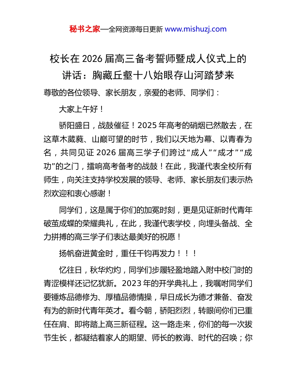 秘书之家—全网资源每日更新 www.mishuzj.com校长在 2026 届高三备考誓师暨成人仪式上的讲话:胸藏丘壑十八始眼存山河踏梦来尊敬的各位领导、家长朋友,亲爱的老师、同学们:大家上午好!骄阳盛日,战鼓催征!2025 年高考的硝烟已然散去,在这草木葳蕤、山巅可望的时节,我们以天地为幕、以青春为名,共同见证 2026“”“”“届高三学子们跨过 成人成才成”功 的之门,擂响高考备考的战鼓!在此,我谨代表全校所有师生,向关注支持学校发展的领导、老师、家长朋友们表示热烈欢迎和衷心感谢!同学们,这是属于你们的加冕时刻,更是见证新时代青年破茧成蝶的荣耀典礼,在此,我谨代表学校,向埋头备战、全力拼搏的高三学子们表达最美好的祝愿!扬帆奋进黄金时,重任千钧再发力!!!忆往日,秋华灼灼,同学们步履轻盈地踏入附中校门时的青涩模样还记忆犹新。2023 年的开学典礼上,我嘱咐同学们要锤炼品德修为、厚植品德情操,早日成长为德才兼备、奋发有为的新时代青年英才。看今朝,骄阳烈烈,转眼间你们已重任在肩、即将踏上高三新征程。这一路走来,你们的每一次拔节生长,都凝结着家人的期望、师长的教诲、时代的召唤;你秘书之家—全网资源每日更新 www.mishuzj.com们的每一道青春轨迹,都镌刻着国家的脉动、学校的发展与自我的蜕变。孩子们,一年一度的成人礼暨备考誓师,是你们走进高三“”“”的 第一课 。在汉语中, 成 字是对世间万物的褒奖,如事“”业 的 成 功 、 作 物 的 成 熟 、 器 具 的 成 型 。 但成字 唯 有“”“”与 人 组合,才是最神圣的一刻。因为 成人 ,意味着一个完整个体和健全生命破茧而出。孩子们,在这千帆竞发的关键时刻,我想送给你们三句话:第一句,立身,以感恩之心去沉淀厚重品德。高中两年一路走来,你们并不孤单,在你身边,充满着温柔的目光。这目光来自你的父母,你的每一点进步,每一点声响,对父母来说,都是和天一样大的事情!他们怜惜你在学校的辛苦,包容你、照顾你、支撑你,反反复复、折折叠叠都是为了你……。他们等在你晚自习回家的路口、他们守在你彻夜学习的门外,他们付出一切,只为你拥有更美好的人生。这目光也来自你的老师,或许他们从未说过惊天动地的豪“”言,却用最朴素的行动诠释着 师者 二字的分量,他们会在深夜的办公室亮一盏孤灯,只为批改完最后一篇作文;他们会在清晨的走廊驻足,只为给困惑的你多讲一道例题;他们会在课堂上因你的进步而舒展眉头,也会在你们懈怠时板起面孔严秘书之家—全网资源每日更新 www.mishuzj.com厉批评。这些看似寻常的细节,背后是无数个备课的深夜、是反复推敲的教学设计、是日复一日对教育初心的坚守。在这十八岁成人的庄重时刻,希望你们铭记父母的执着与付出,感恩老师的陪伴与教诲,感谢同学的彼此鼓励。未来很长,请你们永远不要忘记:一个懂得感恩的人,脚下才会有真正坚实的土地。第二句,立志,将苦辣挫折锻成坚实铠甲。高考路上,或许会有挫折与迷茫,但真正的强者,是面对失败依然厚积薄发,是历经挫折依然沉稳坚毅,是身处低谷依然仰望星空的人。当我们在备考过程中受到挫折时,请自觉给自己以信心与能量,因为每一次失败和挫折都是你走向成功的垫脚石。同学们,距高考还有 359 天,逆转乾坤就在当下,请做“”“”“自己的 孤勇者 :与手机游戏 断舍离 ,与畏难心 硬碰”“”硬 ,与拖延症 正面刚 。我想对处于迷茫甚至服输认命的同学说,敢于逼自己一把,才能知道自己究竟能走多远。同是风华正茂,怎能躺平摆烂、甘拜下风?我还想对所有的同学说,你面临的不只是考试,更是将来你选择时的自信和拒绝时的底气。没有横空出世的幸运,只有不为人知的努力。秘书之家—全网资源每日更新 www.mishuzj.com第三句,立行,以雷电行动,去风驰云走超越自我。在我们面前,自治区名校当道,各盟市的战车也呼啸而“”来, 狭路相逢,勇者胜! 。孩子们,让我们亮剑沙场,为高考而战!当下每一刻的努力,都可能改变 359 天后的际遇。与其遥想未来而忐忑,不如凝神聚力多记一个单词:与其羡慕他人而紧张不安,不如平心静气攻...