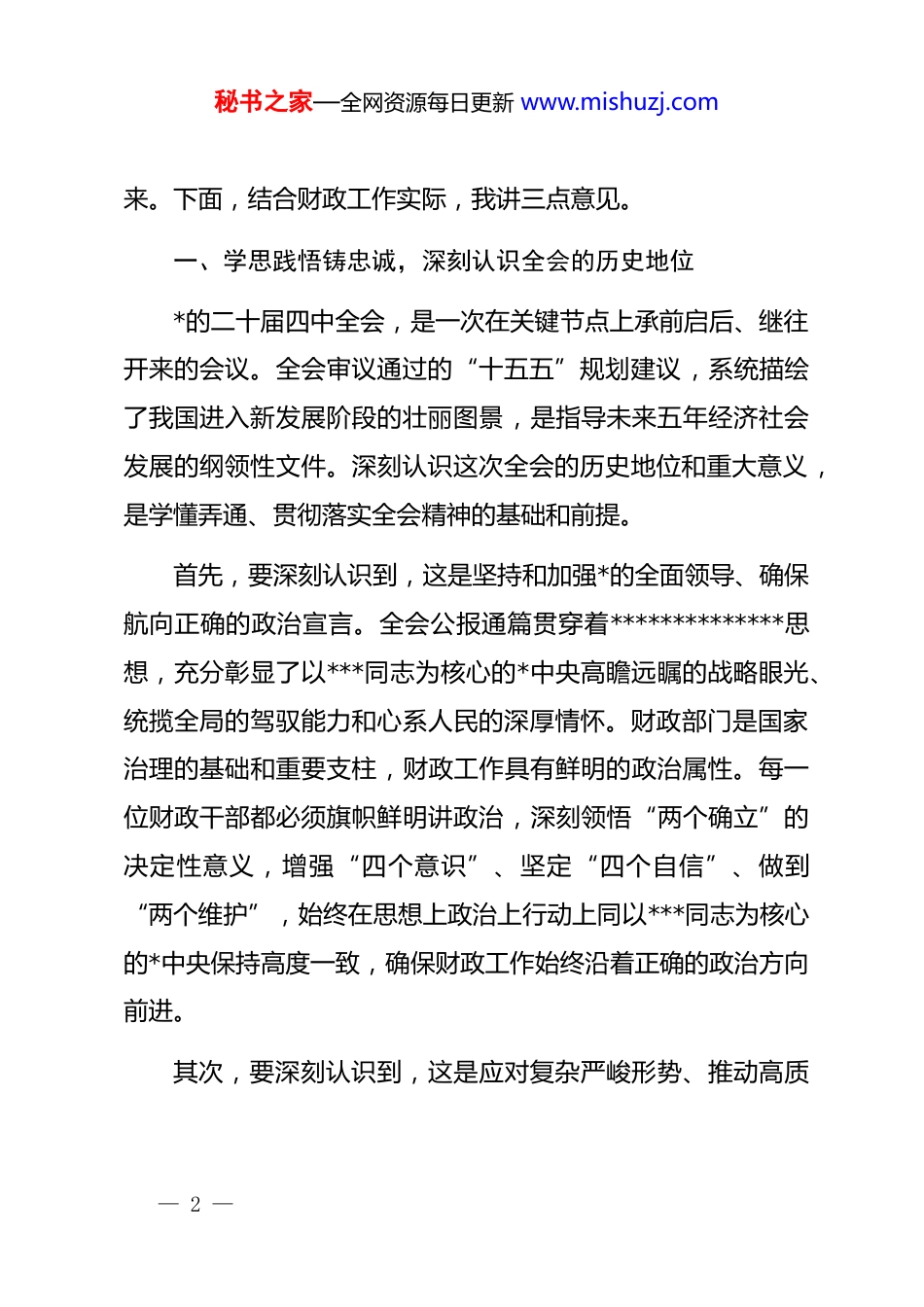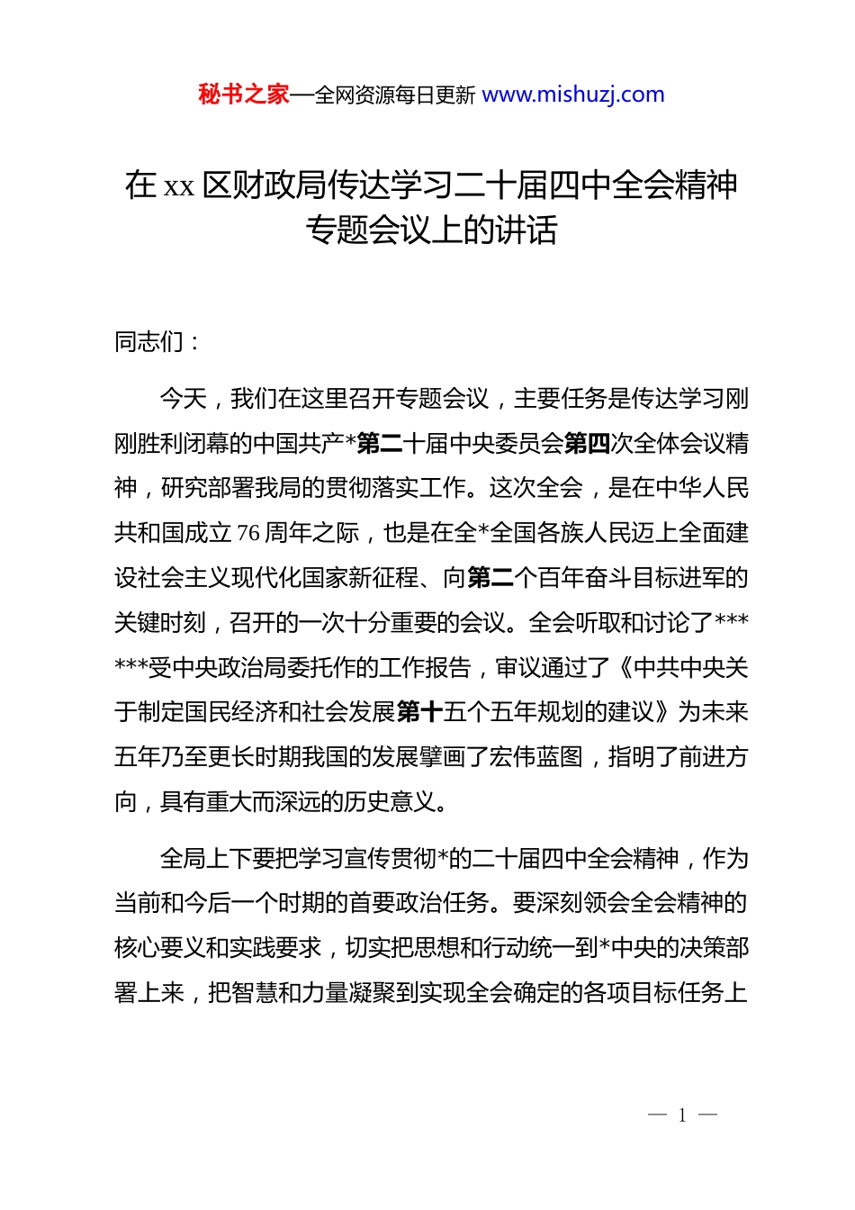 秘书之家—全网资源每日更新 www.mishuzj.com在 xx 区财政局传达学习二十届四中全会精神专题会议上的讲话同志们:今天,我们在这里召开专题会议,主要任务是传达学习刚刚胜利闭幕的中国共产*第二十届中央委员会第四次全体会议精神,研究部署我局的贯彻落实工作。这次全会,是在中华人民共和国成立 76 周年之际,也是在全*全国各族人民迈上全面建设社会主义现代化国家新征程、向第二个百年奋斗目标进军的关键时刻,召开的一次十分重要的会议。全会听取和讨论了******受中央政治局委托作的工作报告,审议通过了《中共中央关于制定国民经济和社会发展第十五个五年规划的建议》为未来五年乃至更长时期我国的发展擘画了宏伟蓝图,指明了前进方向,具有重大而深远的历史意义。全局上下要把学习宣传贯彻*的二十届四中全会精神,作为当前和今后一个时期的首要政治任务。要深刻领会全会精神的核心要义和实践要求,切实把思想和行动统一到*中央的决策部署上来,把智慧和力量凝聚到实现全会确定的各项目标任务上— 1 —秘书之家—全网资源每日更新 www.mishuzj.com来。下面,结合财政工作实际,我讲三点意见。一、学思践悟铸忠诚,深刻认识全会的历史地位*的二十届四中全会,是一次在关键节点上承前启后、继往开来的会议。全会审议通过的“十五五”规划建议,系统描绘了我国进入新发展阶段的壮丽图景,是指导未来五年经济社会发展的纲领性文件。深刻认识这次全会的历史地位和重大意义,是学懂弄通、贯彻落实全会精神的基础和前提。首先,要深刻认识到,这是坚持和加强*的全面领导、确保航向正确的政治宣言。全会公报通篇贯穿着**************思想,充分彰显了以***同志为核心的*中央高瞻远瞩的战略眼光、统揽全局的驾驭能力和心系人民的深厚情怀。财政部门是国家治理的基础和重要支柱,财政工作具有鲜明的政治属性。每一位财政干部都必须旗帜鲜明讲政治,深刻领悟“两个确立”的决定性意义,增强“四个意识”、坚定“四个自信”、做到“两个维护”,始终在思想上政治上行动上同以***同志为核心的*中央保持高度一致,确保财政工作始终沿着正确的政治方向前进。其次,要深刻认识到,这是应对复杂严峻形势、推动高质— 2 —秘书之家—全网资源每日更新 www.mishuzj.com量发展的战略擘画。当前,世界百年未有之大变局加速演进,我国发展进入战略机遇和风险挑战并存、不确定难预料因素增多的时期。全会科学分析了当前面临的经济形势,强调要坚持稳中求进工作总基调,完整、准确、全面贯彻新发展理念,加快构建新发展格局,着力推动高质量发展。全会提出的系列新思路、新战略、新举措,为我们在新征程上应对风险挑战、实现质的有效提升和量的合理增长提供了根本遵循。作为经济社会发展的“晴雨表”和调控“工具箱”,财政部门必须增强忧患意识,坚持底线思维,准确识变、科学应变、主动求变,以财政工作的确定性应对外部环境的不确定性。最后,要深刻认识到,这是践行以人民为中心思想、增进民生福祉的行动指南。全会强调要扎实做好民生保障工作,突出就业优先政策,解决好人民群众急难愁盼问题。这充分体现了我们*“江山就是人民,人民就是江山”的执政理念。财政取之于民、用之于民。保障和改善民生是财政工作的出发点和落脚点。必须始终坚持人民至上,把更多的财力向民生领域倾斜,用心用情用力解决好教育、医疗、养老、社保等群众最关心、最直接、最现实的利益问题,让发展的成果更多更公平惠及全区人民,不断提升人民群众的获得感、幸福感、安全感。— 3 —秘书之家—全网资源每日更新 www.mishuzj.com二、聚焦财政主责主业,全力保障经济社会发展资金需求学习贯彻全会精神,关键在于落实。财政部门要找准服务大局的切入点和着力点,紧紧围绕全会确定的目标任务,主动担当,积极作为,发挥好财政在国家治理中的基础和重要支柱作用。一要精准发力,支持构建现代化产业体系。高质量发展是“十五五”时期的首要任务,而现代化产业体系是高质量发展的根基。全会强调要大力发展新质生产力,这为财政支持指明了方向。我们要跳出传统思维,用好用活财政政策工具箱。要围绕我区 xx 产业...