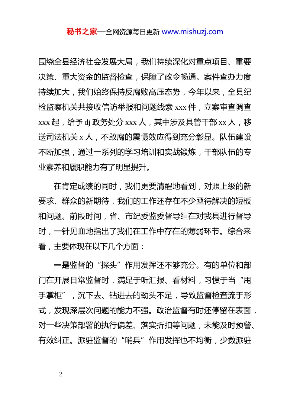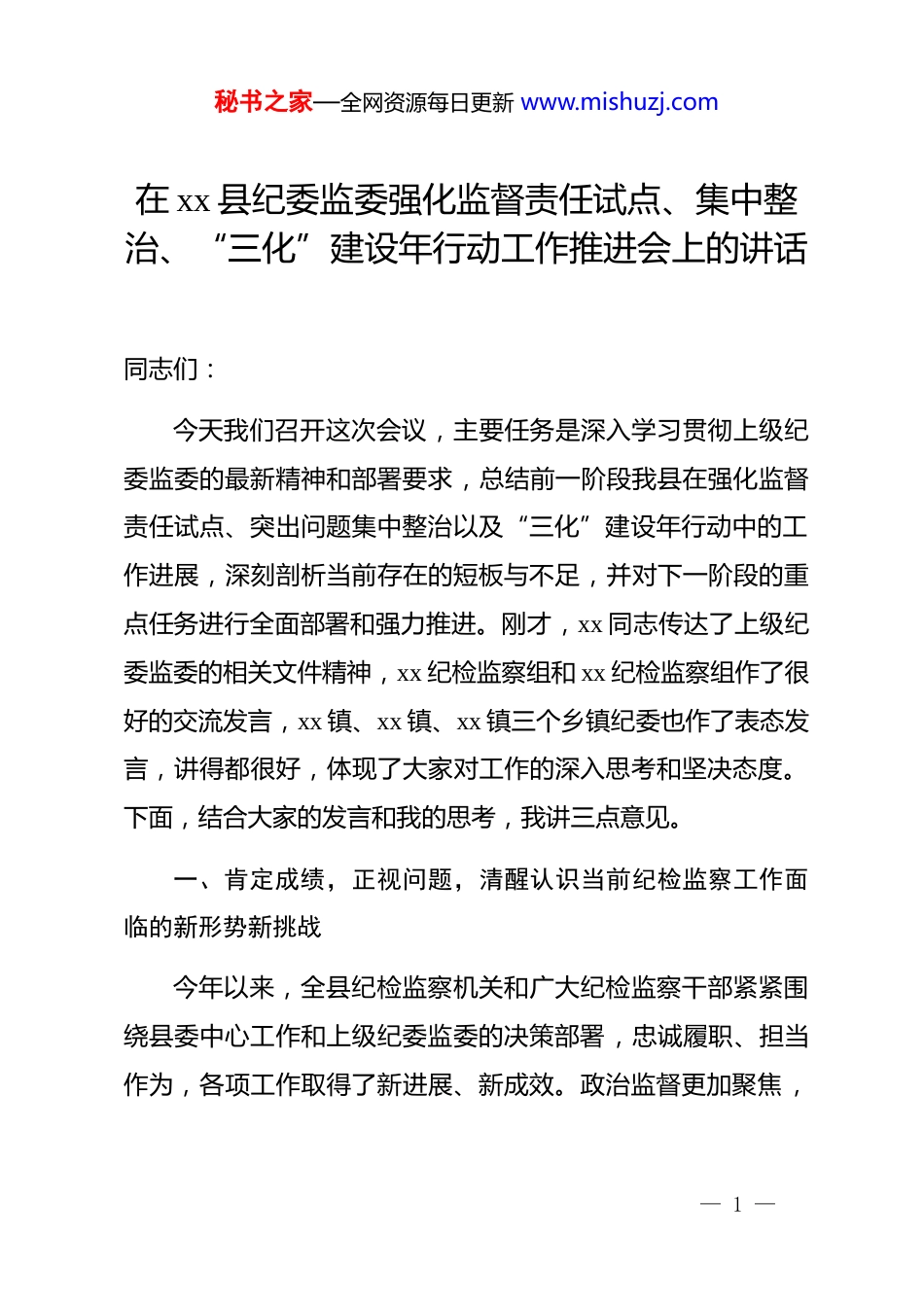 秘书之家—全网资源每日更新 www.mishuzj.com在 xx 县纪委监委强化监督责任试点、集中整治、“三化”建设年行动工作推进会上的讲话同志们:今天我们召开这次会议,主要任务是深入学习贯彻上级纪委监委的最新精神和部署要求,总结前一阶段我县在强化监督责任试点、突出问题集中整治以及“三化”建设年行动中的工作进展,深刻剖析当前存在的短板与不足,并对下一阶段的重点任务进行全面部署和强力推进。刚才,xx 同志传达了上级纪委监委的相关文件精神,xx 纪检监察组和 xx 纪检监察组作了很好的交流发言,xx 镇、xx 镇、xx 镇三个乡镇纪委也作了表态发言,讲得都很好,体现了大家对工作的深入思考和坚决态度。下面,结合大家的发言和我的思考,我讲三点意见。一、肯定成绩,正视问题,清醒认识当前纪检监察工作面临的新形势新挑战今年以来,全县纪检监察机关和广大纪检监察干部紧紧围绕县委中心工作和上级纪委监委的决策部署,忠诚履职、担当作为,各项工作取得了新进展、新成效。政治监督更加聚焦,— 1 —秘书之家—全网资源每日更新 www.mishuzj.com围绕全县经济社会发展大局,我们持续深化对重点项目、重要决策、重大资金的监督检查,保障了政令畅通。案件查办力度持续加大,我们始终保持反腐败高压态势,今年以来,全县纪检监察机关共接收信访举报和问题线索 xxx 件,立案审查调查xxx 起,给予 dj 政务处分 xxx 人,其中涉及县管干部 xx 人,移送司法机关 x 人,不敢腐的震慑效应得到充分彰显。队伍建设不断加强,通过一系列的学习培训和实战锻炼,干部队伍的专业素养和履职能力有了明显提升。在肯定成绩的同时,我们更要清醒地看到,对照上级的新要求、群众的新期待,我们的工作还存在不少亟待解决的短板和问题。前段时间,省、市纪委监委督导组在对我县进行督导时,一针见血地指出了我们在工作中存在的薄弱环节。综合来看,主要体现在以下几个方面:一是监督的“探头”作用发挥还不够充分。有的单位和部门在开展日常监督时,满足于听汇报、看材料,习惯于当“甩手掌柜”,沉下去、钻进去的劲头不足,导致监督检查流于形式,发现深层次问题的能力不强。政治监督有时还停留在表面,对一些决策部署的执行偏差、落实折扣等问题,未能及时预警、有效纠正。派驻监督的“哨兵”作用发挥也不均衡,少数派驻— 2 —秘书之家—全网资源每日更新 www.mishuzj.com组对驻在单位的“树木”与“森林”状况把握不清,存在不敢监督、不善监督的问题。二是案件查办的“后半篇文章”做得还不够扎实。一些案件查办存在重查处、轻剖析、弱整改的现象。案件办结后,对于案件暴露出的制度漏洞、监管缺失等共性问题,深入剖析不够,提出的纪检监察建议质量不高、针对性不强,导致同类问题在不同领域、不同单位反复发生。案件质量也需进一步提升,在程序规范、证据链完整性等方面,个别案件还存在瑕疵,距离“铁案”标准还有差距。三是队伍建设的“内功”修炼还不够到家。面对新时代纪检监察工作高质量发展的新要求,我们队伍的专业化水平还需进一步提升。部分干部对纪法知识的学习不够系统深入,运用法治思维和法治方式开展工作的能力有待加强。干部队伍结构有待优化,特别是熟悉经济、金融、法律、审计等专业知识的复合型人才储备不足,年轻干部的培养选拔力度也需要进一步加大。片区协作机制虽然已经建立,但在信息互通、力量统筹、成果共享等方面的深度融合还做得不够,协同作战的整体效能尚未完全发挥。这些问题,既有客观因素,但更多的是主观原因,反映出— 3 —秘书之家—全网资源每日更新 www.mishuzj.com我们的思想认识、责任担当、能力水平还存在差距。我们必须以“如坐针毡、如芒在背”的紧迫感,坚持问题导向,拿出刮骨疗毒的勇气和自我革命的精神,逐项加以解决。二、聚焦重点,精准发力,全力推动三项重点工作取得突破性进展做好下一阶段的工作,关键在于聚焦核心任务,抓住主要矛盾,以重点突破带动整体提升。全县各级纪检监察组织要紧紧围绕强化监督责任试点、集中整治和“三化”建设年行动这三项重点工作,统筹推进,务求实效。(一)以强化监督责任...