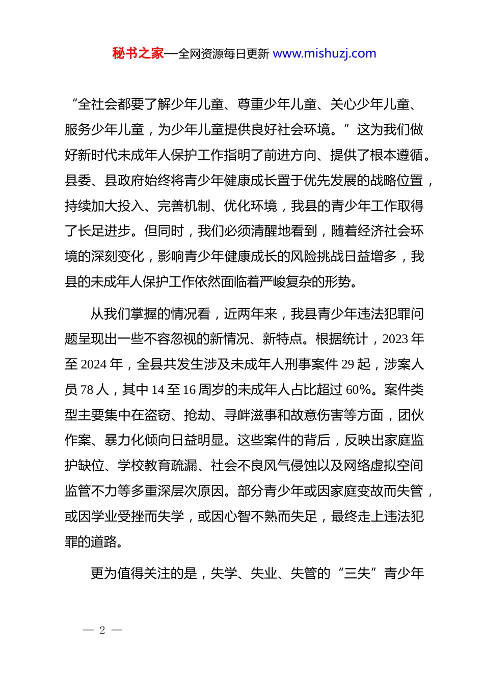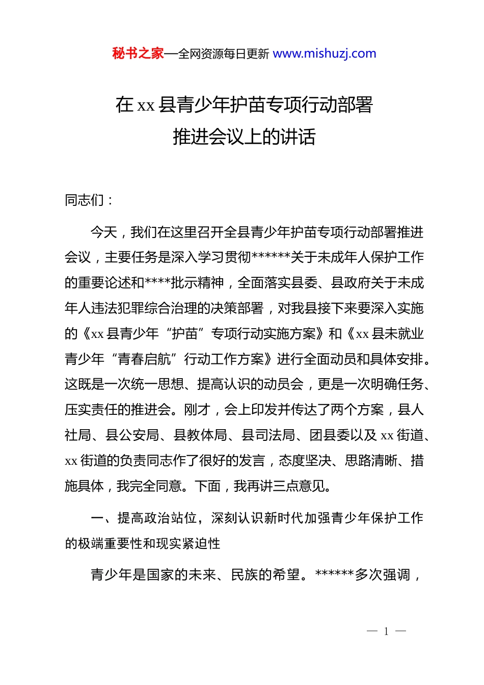 秘书之家—全网资源每日更新 www.mishuzj.com在 xx 县青少年护苗专项行动部署推进会议上的讲话同志们:今天,我们在这里召开全县青少年护苗专项行动部署推进会议,主要任务是深入学习贯彻******关于未成年人保护工作的重要论述和****批示精神,全面落实县委、县政府关于未成年人违法犯罪综合治理的决策部署,对我县接下来要深入实施的《xx 县青少年“护苗”专项行动实施方案》和《xx 县未就业青少年“青春启航”行动工作方案》进行全面动员和具体安排。这既是一次统一思想、提高认识的动员会,更是一次明确任务、压实责任的推进会。刚才,会上印发并传达了两个方案,县人社局、县公安局、县教体局、县司法局、团县委以及 xx 街道、xx 街道的负责同志作了很好的发言,态度坚决、思路清晰、措施具体,我完全同意。下面,我再讲三点意见。一、提高政治站位,深刻认识新时代加强青少年保护工作的极端重要性和现实紧迫性青少年是国家的未来、民族的希望。******多次强调,— 1 —秘书之家—全网资源每日更新 www.mishuzj.com“全社会都要了解少年儿童、尊重少年儿童、关心少年儿童、服务少年儿童,为少年儿童提供良好社会环境。”这为我们做好新时代未成年人保护工作指明了前进方向、提供了根本遵循。县委、县政府始终将青少年健康成长置于优先发展的战略位置,持续加大投入、完善机制、优化环境,我县的青少年工作取得了长足进步。但同时,我们必须清醒地看到,随着经济社会环境的深刻变化,影响青少年健康成长的风险挑战日益增多,我县的未成年人保护工作依然面临着严峻复杂的形势。从我们掌握的情况看,近两年来,我县青少年违法犯罪问题呈现出一些不容忽视的新情况、新特点。根据统计,2023 年至 2024 年,全县共发生涉及未成年人刑事案件 29 起,涉案人员 78 人,其中 14 至 16 周岁的未成年人占比超过 60%。案件类型主要集中在盗窃、抢劫、寻衅滋事和故意伤害等方面,团伙作案、暴力化倾向日益明显。这些案件的背后,反映出家庭监护缺位、学校教育疏漏、社会不良风气侵蚀以及网络虚拟空间监管不力等多重深层次原因。部分青少年或因家庭变故而失管,或因学业受挫而失学,或因心智不熟而失足,最终走上违法犯罪的道路。更为值得关注的是,失学、失业、失管的“三失”青少年— 2 —秘书之家—全网资源每日更新 www.mishuzj.com群体,已成为诱发社会治安问题的重要源头。他们精力旺盛、心智尚未成熟,长期游离于社会主流之外,既容易受到不法分子的引诱、拉拢和侵害,也极易因生活无着、精神空虚而滋生越轨念头,成为违法犯罪的“后备军”。“护苗”行动与“青春启航”行动,正是县委、县政府立足当前形势,着眼长远发展,作出的一项标本兼治的战略部署。前者聚焦于“防”,旨在为青少年健康成长撑起一把“保护伞”;后者着力于“疏”,旨在为重点青少年群体架起一座“连心桥”。全县各级各部门必须从讲政治、顾大局、保稳定、促发展的高度,深刻认识这两项行动的重大意义,切实把思想和行动统一到县委、县政府的决策部署上来,以“时时放心不下”的责任感和“事事落实到位”的执行力,坚决打赢这场事关未来的攻坚战。二、聚焦关键环节,精准落实“护苗”与“启航”两大专项行动的核心任务刚才传达的两个方案,已经对各项工作任务、时间节点和责任单位作出了详细部署。各单位要认真对照,逐项抓好落实。这里,我重点就两个方案的核心任务再作强调。(一)聚力“护苗”专项行动,构建全方位、立体化的青少年安全防护网。— 3 —秘书之家—全网资源每日更新 www.mishuzj.com“护苗”专项行动的目标,是坚持预防为主、综合治理,通过系统性干预,最大限度净化青少年成长环境,有效预防和减少青少年违法犯罪。根据方案部署,行动将从 2025 年 10 月持续到 2026 年 8 月底,分为动员部署、排查摸底、集中行动和建章立制四个阶段。我们要紧紧围绕以下五个“一批”展开工作:一要精准摸排一批重点对象。各乡镇(街道)要发挥网格化管理优势,联合公安、教体、民政等部门,对辖区内所有未成年人,特别是对留守儿童、困境儿童、单亲家庭子女、有不良行为...