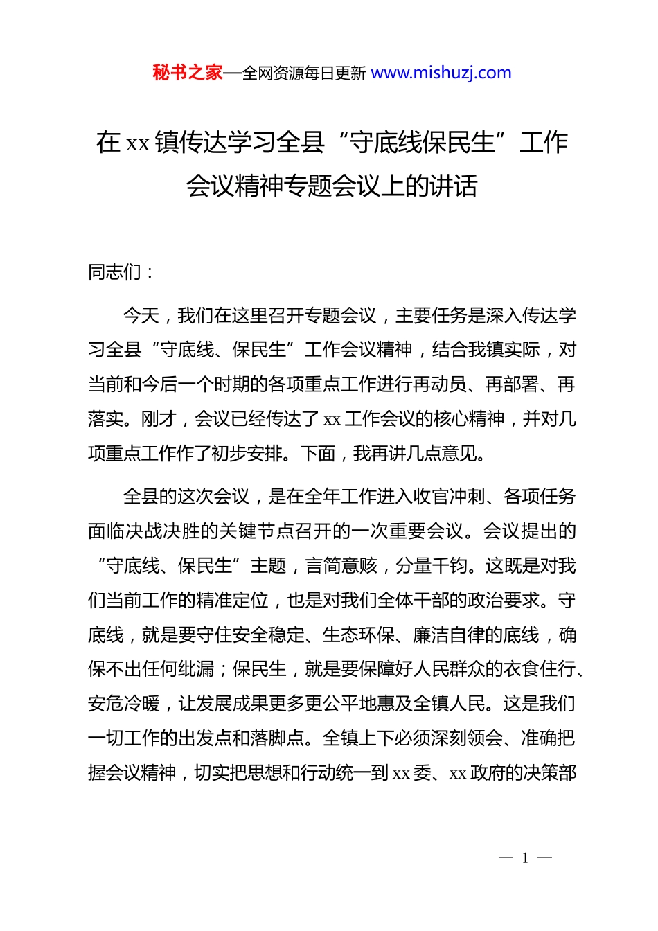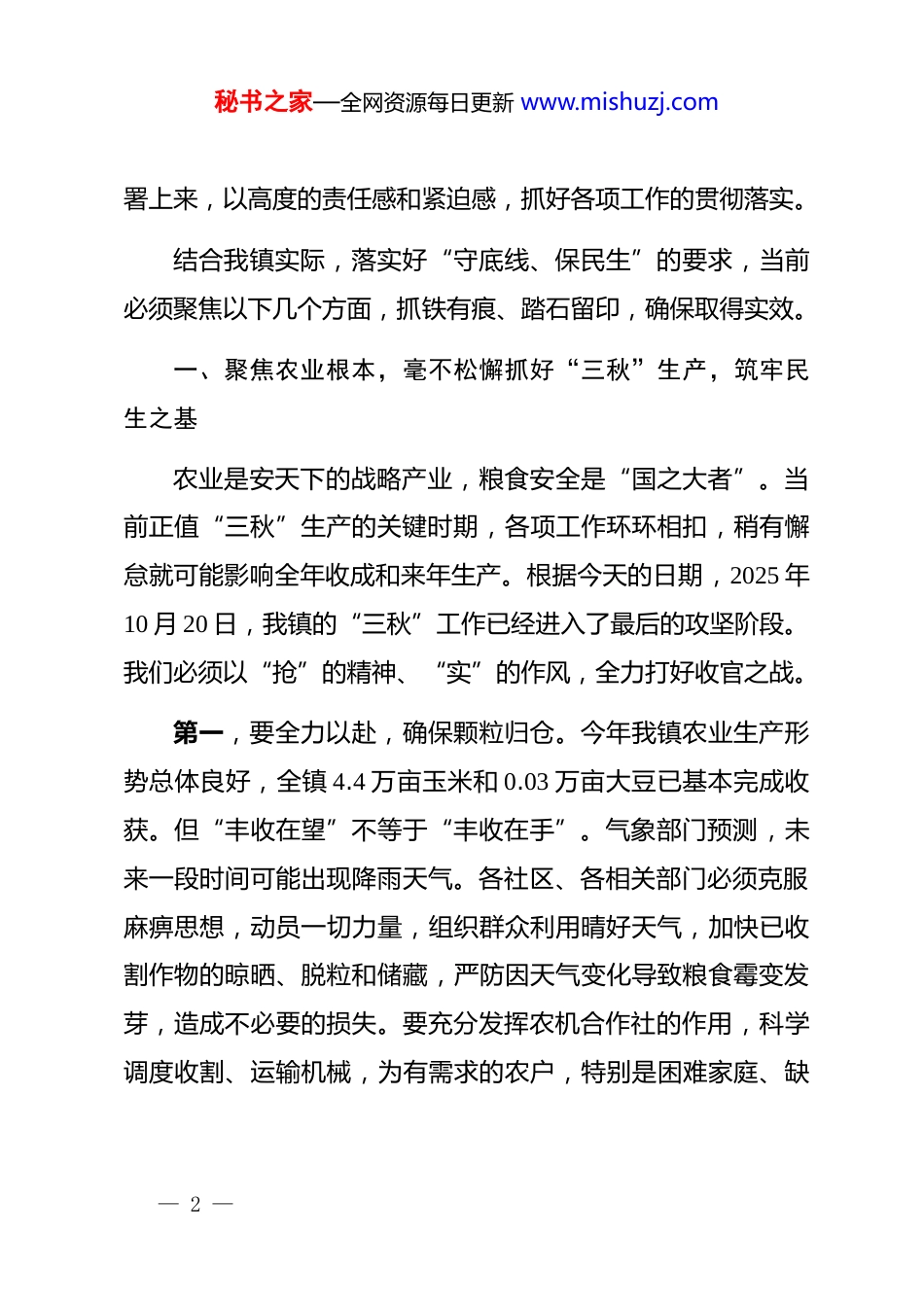秘书之家—全网资源每日更新 www.mishuzj.com在 xx 镇传达学习全县“守底线保民生”工作会议精神专题会议上的讲话同志们:今天,我们在这里召开专题会议,主要任务是深入传达学习全县“守底线、保民生”工作会议精神,结合我镇实际,对当前和今后一个时期的各项重点工作进行再动员、再部署、再落实。刚才,会议已经传达了 xx 工作会议的核心精神,并对几项重点工作作了初步安排。下面,我再讲几点意见。全县的这次会议,是在全年工作进入收官冲刺、各项任务面临决战决胜的关键节点召开的一次重要会议。会议提出的“守底线、保民生”主题,言简意赅,分量千钧。这既是对我们当前工作的精准定位,也是对我们全体干部的政治要求。守底线,就是要守住安全稳定、生态环保、廉洁自律的底线,确保不出任何纰漏;保民生,就是要保障好人民群众的衣食住行、安危冷暖,让发展成果更多更公平地惠及全镇人民。这是我们一切工作的出发点和落脚点。全镇上下必须深刻领会、准确把握会议精神,切实把思想和行动统一到 xx 委、xx 政府的决策部— 1 —秘书之家—全网资源每日更新 www.mishuzj.com署上来,以高度的责任感和紧迫感,抓好各项工作的贯彻落实。结合我镇实际,落实好“守底线、保民生”的要求,当前必须聚焦以下几个方面,抓铁有痕、踏石留印,确保取得实效。一、聚焦农业根本,毫不松懈抓好“三秋”生产,筑牢民生之基农业是安天下的战略产业,粮食安全是“国之大者”。当前正值“三秋”生产的关键时期,各项工作环环相扣,稍有懈怠就可能影响全年收成和来年生产。根据今天的日期,2025 年10 月 20 日,我镇的“三秋”工作已经进入了最后的攻坚阶段。我们必须以“抢”的精神、“实”的作风,全力打好收官之战。第一,要全力以赴,确保颗粒归仓。今年我镇农业生产形势总体良好,全镇 4.4 万亩玉米和 0.03 万亩大豆已基本完成收获。但“丰收在望”不等于“丰收在手”。气象部门预测,未来一段时间可能出现降雨天气。各社区、各相关部门必须克服麻痹思想,动员一切力量,组织群众利用晴好天气,加快已收割作物的晾晒、脱粒和储藏,严防因天气变化导致粮食霉变发芽,造成不必要的损失。要充分发挥农机合作社的作用,科学调度收割、运输机械,为有需求的农户,特别是困难家庭、缺— 2 —秘书之家—全网资源每日更新 www.mishuzj.com劳力家庭提供精准帮扶,确保每一粒粮食都安全入库。这是对农民一年辛勤付出的最好交代,也是保障民生的第一道防线。第二,要抢抓农时,高质量完成秋冬播种。秋播是来年夏粮丰收的基础。我镇 5.1 万亩的秋播任务已全面展开。农技服务中心要深入田间地头,加强技术指导,推广优良品种和先进的耕作技术,指导农民科学施肥、合理密植,为培育冬前壮苗打下坚实基础。要大力推进秸秆还田和土地深耕,提升土壤肥力,实现农业的可持续发展。时间不等人,农时不等人,必须确保在最佳播种期内完成全部播种任务,为明年夏粮丰收赢得主动。第三,要统筹兼顾,做好农业农村各项后续工作。在抓好“三秋”生产的同时,要同步推进农田水利设施的维修养护、高标准农田建设的规划申报以及秋冬季动物疫病防控等工作。要将“三秋”生产与人居环境整治相结合,严禁秸秆焚烧,做好田间地头的杂草、垃圾清理,营造干净整洁的乡村环境。这些工作看似琐碎,但都直接关系到农业生产的长远发展和农民的生活品质,必须一体谋划、一体推进。二、聚焦发展要务,坚定不移推动工业经济,夯实民生之本— 3 —秘书之家—全网资源每日更新 www.mishuzj.com发展是解决一切问题的基础和关键。没有坚实的经济基础“保民生”就是一句空话。我镇作为传统工业重镇,拥有水泥建材、高铁装备制造、纳米碳酸钙、装配式建筑四大产业集群,工业经济是我们发展的“压舱石”和“顶梁柱”。越是面临复杂形势,我们越要保持战略定力,把稳增长、促发展摆在更加突出的位置。第一,要全力服务企业,稳定经济运行基本盘。第四季度是完成全年经济目标任务的冲刺期。经济运行部门要深入一线,精准对接以 xx 水泥、xx 高速装备等为代表的龙头企业,全面掌握企业生产经营状况,实行“一企一...