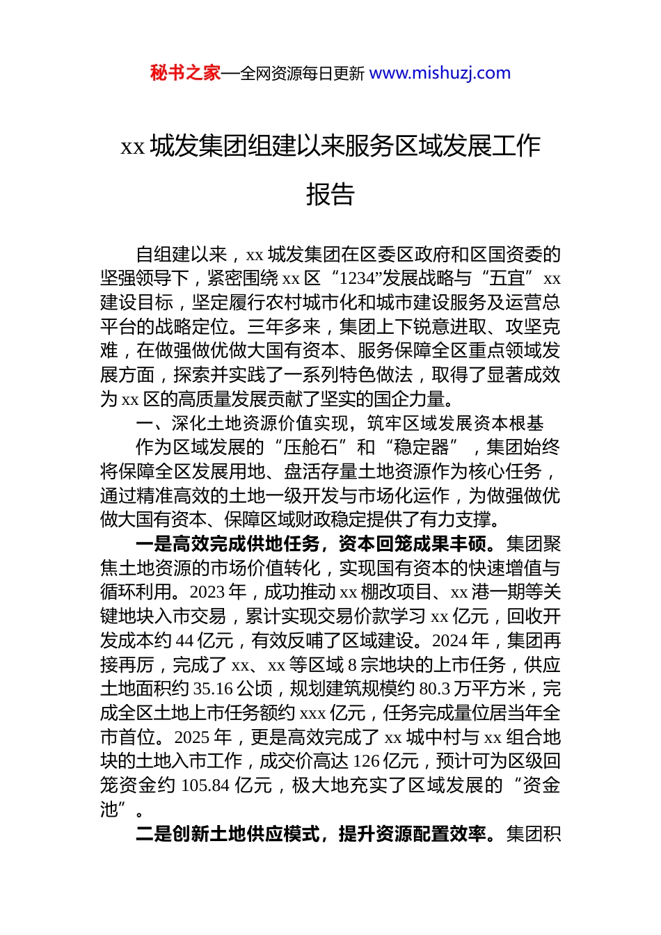 秘书之家—全网资源每日更新 www.mishuzj.comxx 城发集团组建以来服务区域发展工作报告自组建以来,xx 城发集团在区委区政府和区国资委的坚强领导下,紧密围绕 xx 区“1234”发展战略与“五宜”xx建设目标,坚定履行农村城市化和城市建设服务及运营总平台的战略定位。三年多来,集团上下锐意进取、攻坚克难,在做强做优做大国有资本、服务保障全区重点领域发展方面,探索并实践了一系列特色做法,取得了显著成效为 xx 区的高质量发展贡献了坚实的国企力量。一、深化土地资源价值实现,筑牢区域发展资本根基作为区域发展的“压舱石”和“稳定器”,集团始终将保障全区发展用地、盘活存量土地资源作为核心任务,通过精准高效的土地一级开发与市场化运作,为做强做优做大国有资本、保障区域财政稳定提供了有力支撑。一是高效完成供地任务,资本回笼成果丰硕。集团聚焦土地资源的市场价值转化,实现国有资本的快速增值与循环利用。2023 年,成功推动 xx 棚改项目、xx 港一期等关键地块入市交易,累计实现交易价款学习 xx 亿元,回收开发成本约 44 亿元,有效反哺了区域建设。2024 年,集团再接再厉,完成了 xx、xx 等区域 8 宗地块的上市任务,供应土地面积约 35.16 公顷,规划建筑规模约 80.3 万平方米,完成全区土地上市任务额约 xxx 亿元,任务完成量位居当年全市首位。2025 年,更是高效完成了 xx 城中村与 xx 组合地块的土地入市工作,成交价高达 126 亿元,预计可为区级回笼资金约 105.84 亿元,极大地充实了区域发展的“资金池”。二是创新土地供应模式,提升资源配置效率。集团积秘书之家—全网资源每日更新 www.mishuzj.com极探索土地供应新模式,以创新驱动国有资本效能提升。在 xx 园北区等地块的开发中,率先实践了全市首宗“住宅产业+配套”组合供应用地模式,将产业发展与居住配套紧密捆绑,优化了区域功能布局,提升了土地的综合价值。同时,集团深度参与 xx 区供地全生命周期管理,通过举办城市空间资源推介会等市场化手段,整合全区优质空间资源,一次性推出拟出让(合作)项目 50 宗,搭建了公开透明、高效对接的资源平台,不仅加快了土地资产的流转速度,更实现了国有资本在更大范围、更深层次上的优化配置。三是前瞻性拓展资源储备,夯实永续发展后劲。集团坚持“开发与储备并举”,为区域长远发展积蓄势能。通过解锁 xx 南区土储项目地块、协助推进 xx 部队置换工作等举措,为后续的城市建设和产业导入进一步充实了“家底”。这些前瞻性的布局,确保了区域发展的连续性和可持续性,体现了国有资本在服务城市战略中的远见和担当。二、聚焦重大民生工程建设,彰显国企社会责任担当集团坚决扛起民生保障的重任,将棚户区改造、城中村改造等群众最关心、最直接、最现实的利益问题作为工作主战场,以超常规的力度和速度,全力推进各项民生工程,切实增强人民群众的获得感、幸福感和安全感,为“五宜”xx 中的“宜居”建设贡献核心力量。一是强力攻坚棚户区改造,兑现民生改善承诺。集团将棚户区改造作为头号民生工程,集中优势资源全力推进作为国务院督办项目,xx 桥旧城区改建项目取得了决定性进展,一期实施地块已完成全部经营性用地出让,为后续建设奠定了基础;二期住宅房屋收房工作全面完成,其中 xx街坊已达到“场干地净”要求,拟于年内实现供地,其余街坊也计划于 2026 年下半年具备供地条件。此外,xx 棚改项目、xx 旧改项目、xx 棚改项目等均在稳步推进前期工作。这些项目的扎实推进,不仅改善了数以万计居民的居住条件,也为城市肌理的优化和功能提升释放了宝贵空间。秘书之家—全网资源每日更新 www.mishuzj.com二是极速推进城中村改造,刷新区域建设“xx 速度”。面对新时期城市发展的重点和难点,集团勇当 xx 区城中村改造的主力军,展现了惊人的执行力和效率。以极限速度在 151 天内同步取得 2024 年首批次 4 个城中村改造项目的立项手续,创造了项目审批的“xx 速度”。截至 2024 年上半年,xx、xx 等 4 个项目的集体住宅腾退任务已全部完成针对 2025 年新增的 xx 捆绑 xx、...