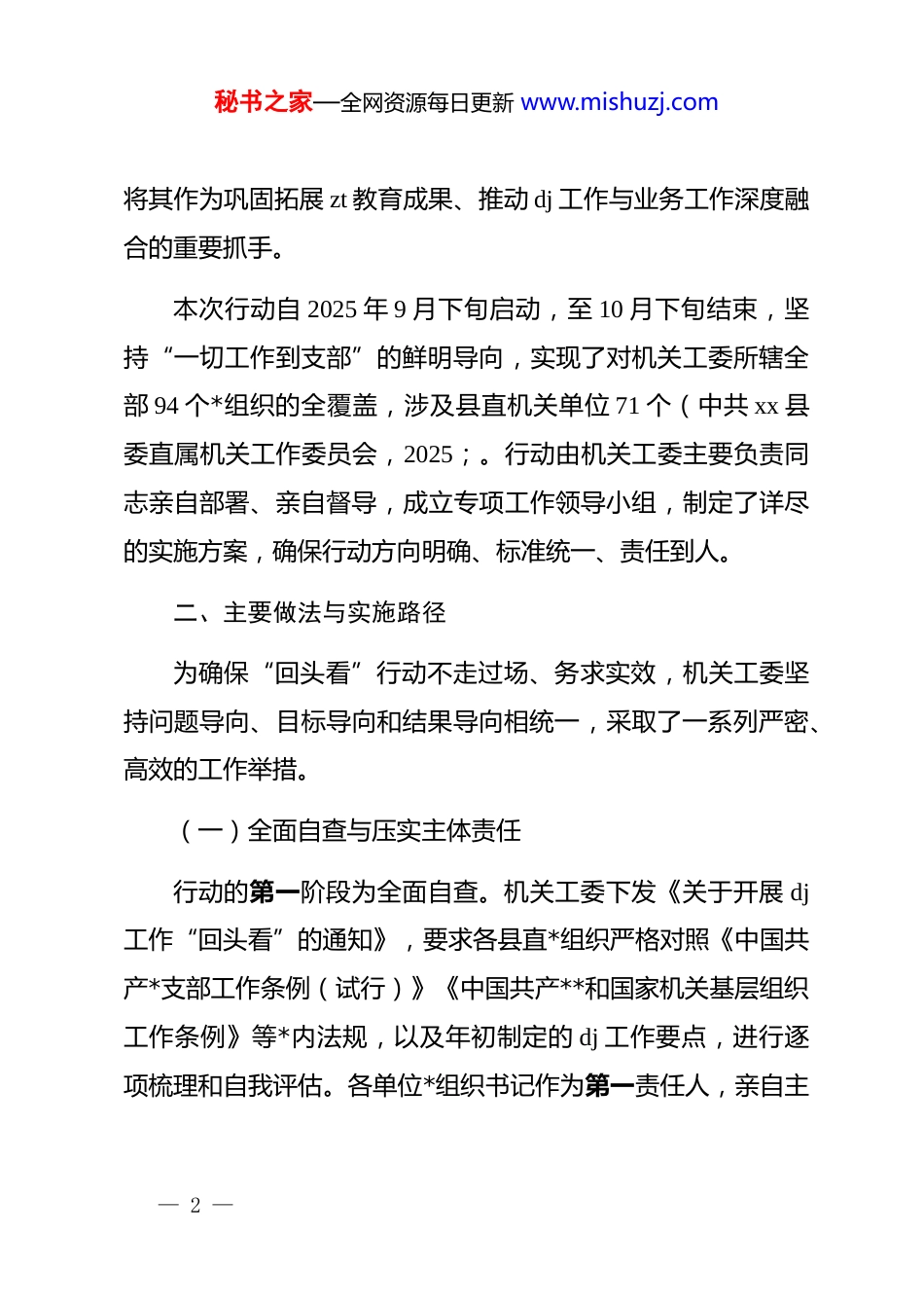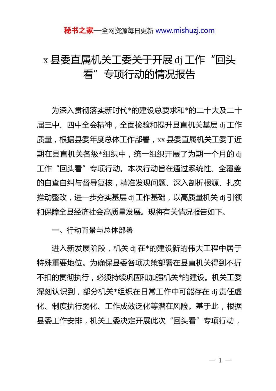 秘书之家—全网资源每日更新 www.mishuzj.comx 县委直属机关工委关于开展 dj 工作“回头看”专项行动的情况报告为深入贯彻落实新时代*的建设总要求和*的二十大及二十届三中、四中全会精神,全面检验和提升县直机关基层 dj 工作质量,根据县委年度总体工作部署,xx 县委直属机关工委于近期在县直机关各级*组织中,统一组织开展了为期一个月的 dj工作“回头看”专项行动。本次行动旨在通过系统性、全覆盖的自查自纠与督导复核,精准发现问题、深入剖析根源、扎实推动整改,进一步夯实基层 dj 工作基础,以高质量机关 dj 引领和保障全县经济社会高质量发展。现将有关情况报告如下。一、行动背景与总体部署进入新发展阶段,机关 dj 在*的建设新的伟大工程中居于特殊重要地位。为确保县委各项决策部署在县直机关得到不折不扣的贯彻执行,必须持续巩固和加强机关*的建设。机关工委深刻认识到,部分机关*组织在日常工作中可能存在 dj 责任虚化、制度执行弱化、工作成效泛化等潜在风险。基于此,根据县委工作安排,机关工委决定开展此次“回头看”专项行动,— 1 —秘书之家—全网资源每日更新 www.mishuzj.com将其作为巩固拓展 zt 教育成果、推动 dj 工作与业务工作深度融合的重要抓手。本次行动自 2025 年 9 月下旬启动,至 10 月下旬结束,坚持“一切工作到支部”的鲜明导向,实现了对机关工委所辖全部 94 个*组织的全覆盖,涉及县直机关单位 71 个(中共 xx 县委直属机关工作委员会,2025;。行动由机关工委主要负责同志亲自部署、亲自督导,成立专项工作领导小组,制定了详尽的实施方案,确保行动方向明确、标准统一、责任到人。二、主要做法与实施路径为确保“回头看”行动不走过场、务求实效,机关工委坚持问题导向、目标导向和结果导向相统一,采取了一系列严密、高效的工作举措。(一)全面自查与压实主体责任行动的第一阶段为全面自查。机关工委下发《关于开展 dj工作“回头看”的通知》,要求各县直*组织严格对照《中国共产*支部工作条例(试行)》《中国共产**和国家机关基层组织工作条例》等*内法规,以及年初制定的 dj 工作要点,进行逐项梳理和自我评估。各单位*组织书记作为第一责任人,亲自主— 2 —秘书之家—全网资源每日更新 www.mishuzj.com持召开专题会议进行动员部署,带领班子成员和*务干部,对近年来的 dj 工作台账、会议记录、活动资料等进行了系统性、拉网式排查。此举有效压实了各级*组织抓 dj 的主体责任,形成了“一级抓一级、层层抓落实”的良好工作格局。据初步统计,各单位在自查阶段普遍召开了专题部署会,*员参与自查工作的覆盖率超过 90%。(二)聚焦重点与精准靶向发力本次行动精准聚焦四大建设领域,确保“回头看”看得深、查得准。1.聚焦政治建设,检视忠诚底色。重点检查“第一议题”制度的落实情况,核查各*组织是否及时、深入学习贯彻******最新重要讲话和****批示精神;检视*员干部政治理论学习的系统性、深刻性,防止学习表面化、形式化。2.聚焦组织建设,检视支部堡垒作用。严格对照“三会一课”、组织生活会、民主评议*员、主题*日等基本制度的频次、程序和质量要求进行检查。重点关注基层*组织按期换届及补选改选情况,对任期届满未及时换届的*组织进行专项督办。同时,对“四强”*支部创建工作进展和“五大工程”的实施成效进行— 3 —秘书之家—全网资源每日更新 www.mishuzj.com评估。3.聚焦作风建设,检视纪律执行。深入检查中央八项规定及其实施细则精神的学习教育和贯彻执行情况,特别是对形式主义、官僚主义等突出问题的排查整改。同时,对*风廉政建设责任制的落实情况进行复核,确保压力传导到位。4.聚焦队伍建设,检视*员先锋模范作用。重点检视*员教育管理、发展*员工作的规范性,以及*员在中心工作、重大任务中发挥作用的情况。(三)线上线下与联动协同推进机关工委综合运用多种方式,加强对“回头看”行动的全程指导和动态监督。今年以来,先后召开工作安排部署会议 1次,工委委员专题会议 2 次,研究推进 dj 重点工作。行动期间,通过“xx 智慧 dj”app 后台数据...