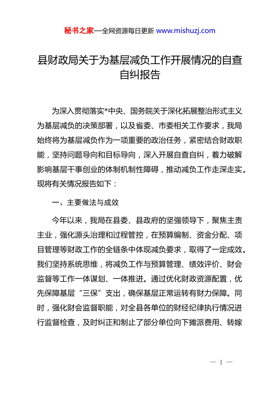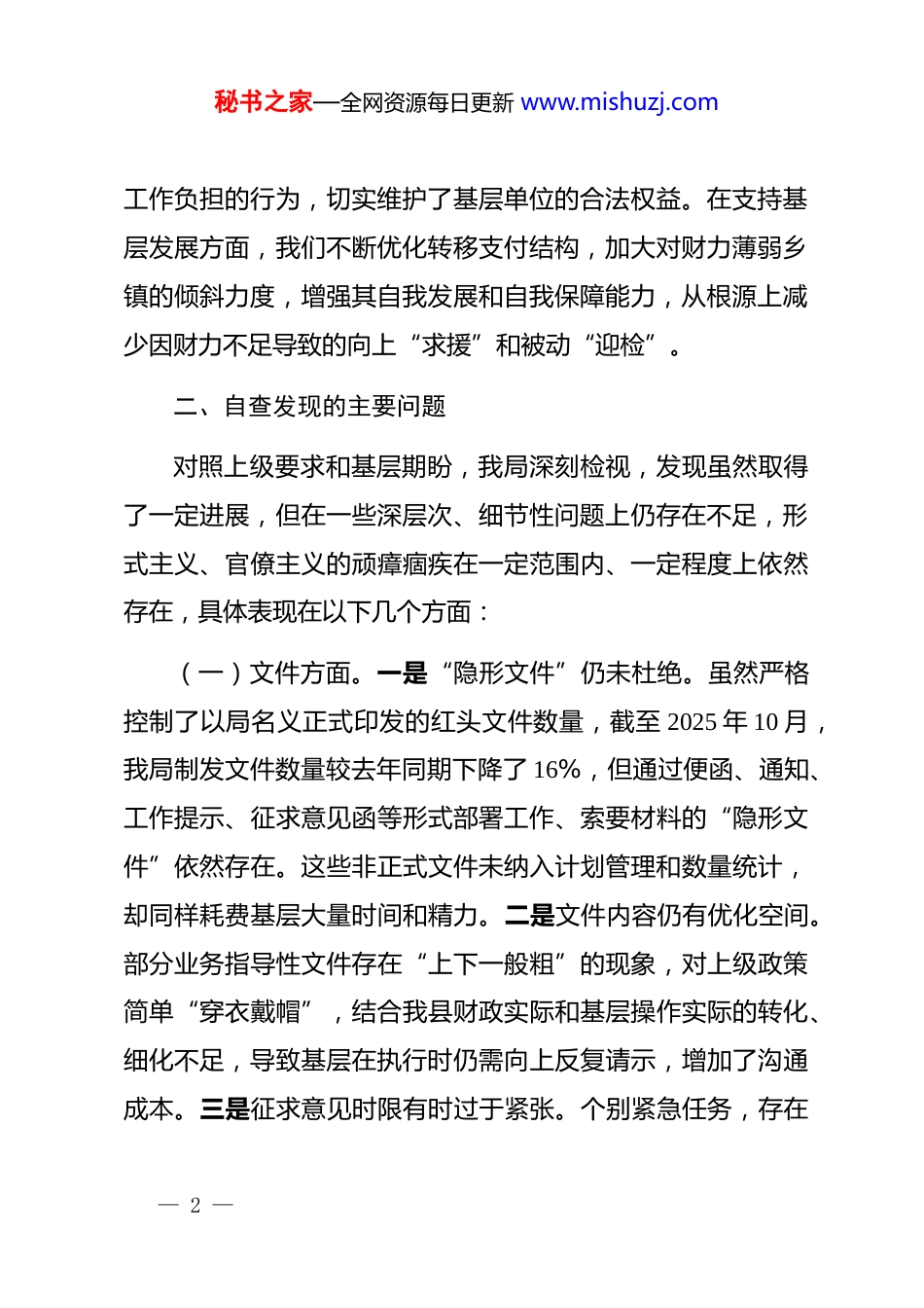 秘书之家—全网资源每日更新 www.mishuzj.com县财政局关于为基层减负工作开展情况的自查自纠报告为深入贯彻落实*中央、国务院关于深化拓展整治形式主义为基层减负的决策部署,以及省委、市委相关工作要求,我局始终将为基层减负作为一项重要的政治任务,紧密结合财政职能,坚持问题导向和目标导向,深入开展自查自纠,着力破解影响基层干事创业的体制机制性障碍,推动减负工作走深走实。现将有关情况报告如下:一、主要做法与成效今年以来,我局在县委、县政府的坚强领导下,聚焦主责主业,强化源头治理和过程管控,在预算编制、资金分配、项目管理等财政工作的全链条中体现减负要求,取得了一定成效。我们坚持系统思维,将减负工作与预算管理、绩效评价、财会监督等工作一体谋划、一体推进。通过优化财政资源配置,优先保障基层“三保”支出,确保基层正常运转有财力保障。同时,强化财会监督职能,对全县各单位的财经纪律执行情况进行监督检查,及时纠正和制止了部分单位向下摊派费用、转嫁— 1 —秘书之家—全网资源每日更新 www.mishuzj.com工作负担的行为,切实维护了基层单位的合法权益。在支持基层发展方面,我们不断优化转移支付结构,加大对财力薄弱乡镇的倾斜力度,增强其自我发展和自我保障能力,从根源上减少因财力不足导致的向上“求援”和被动“迎检”。二、自查发现的主要问题对照上级要求和基层期盼,我局深刻检视,发现虽然取得了一定进展,但在一些深层次、细节性问题上仍存在不足,形式主义、官僚主义的顽瘴痼疾在一定范围内、一定程度上依然存在,具体表现在以下几个方面:(一)文件方面。一是“隐形文件”仍未杜绝。虽然严格控制了以局名义正式印发的红头文件数量,截至 2025 年 10 月,我局制发文件数量较去年同期下降了 16%,但通过便函、通知、工作提示、征求意见函等形式部署工作、索要材料的“隐形文件”依然存在。这些非正式文件未纳入计划管理和数量统计,却同样耗费基层大量时间和精力。二是文件内容仍有优化空间。部分业务指导性文件存在“上下一般粗”的现象,对上级政策简单“穿衣戴帽”,结合我县财政实际和基层操作实际的转化、细化不足,导致基层在执行时仍需向上反复请示,增加了沟通成本。三是征求意见时限有时过于紧张。个别紧急任务,存在— 2 —秘书之家—全网资源每日更新 www.mishuzj.com周五下午发函要求下周一上午反馈的情况,未给基层留足充分研究和反馈意见的时间,导致反馈质量不高,征求意见流于形式。(二)会议方面。一是会议统筹力度有待加强。虽然我局严格执行年度会议计划,截至目前,以局名义召开的全县性会议场次同比减少 12%,但部门内部、股室层面召开的业务培训会、工作协调会、项目推进会等小型会议数量仍然偏多。部分会议存在主题相近、参会人员重叠的问题,未能有效整合,增加了基层的参会负担。二是视频会议减负效果未完全实现。视频会议在提高效率的同时,也出现了新的问题。部分视频会议层层套开,同一主题的会议,省、市、县接续召开,基层干部“刚走出这个会场,又走进那个会场”。同时,对视频会议的参会范围和人员要求有时过于宽泛,未能做到精准通知,造成不必要的陪会。(三)督检考和调研考察方面。一是检查考核的统筹性不足。尽管我局严格执行督检考年度计划和备案制度,但仍存在与其他部门对同一乡镇、同一项目开展的财务检查、绩效评价、预算执行监督等工作未能有效整合的现象,导致基层单位在一段时间内需要反复接待、提供相似材料,存在多头检查、重复— 3 —秘书之家—全网资源每日更新 www.mishuzj.com检查的问题。截至 2025 年第三季度,我局牵头或参与的各类督检考活动共计 18 次,虽较去年同期的 22 次有所下降,但基层反映的迎检压力依然较大。二是调研重“量”轻“质”偶有发生。下基层调研有时存在“走马观花”现象,满足于听取汇报、查看台账,深入一线、解剖麻雀式的“四不两直”调研开展得不够深入,对基层财政运行中遇到的真实困难和堵点问题挖掘不够透彻,提出的解决方案针对性、可操作性有待提高。(四)抽借调方面。一是“以借代调”现象依然存在。为应对阶段...