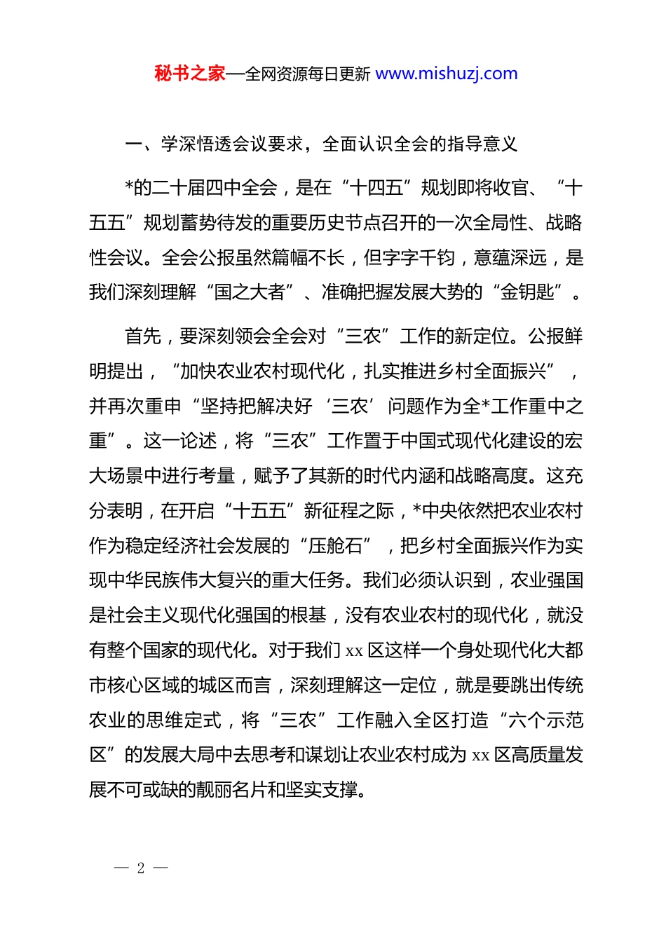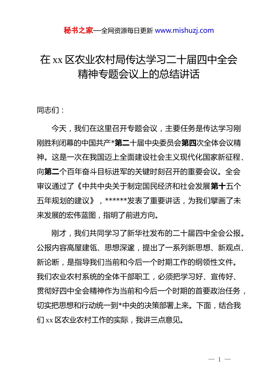 秘书之家—全网资源每日更新 www.mishuzj.com在 xx 区农业农村局传达学习二十届四中全会精神专题会议上的总结讲话同志们:今天,我们在这里召开专题会议,主要任务是传达学习刚刚胜利闭幕的中国共产*第二十届中央委员会第四次全体会议精神。这是一次在我国迈上全面建设社会主义现代化国家新征程、向第二个百年奋斗目标进军的关键时刻召开的重要会议。全会审议通过了《中共中央关于制定国民经济和社会发展第十五个五年规划的建议》,******发表了重要讲话,为我们擘画了未来发展的宏伟蓝图,指明了前进方向。刚才,我们共同学习了新华社发布的二十届四中全会公报。公报内容高屋建瓴、思想深邃,提出了一系列新思想、新观点、新论断,是指导我们当前和今后一个时期工作的纲领性文件。我们农业农村系统的全体干部职工,必须把学习好、宣传好、贯彻好四中全会精神作为当前和今后一个时期的首要政治任务,切实把思想和行动统一到*中央的决策部署上来。下面,结合我们 xx 区农业农村工作的实际,我讲三点意见。— 1 —秘书之家—全网资源每日更新 www.mishuzj.com一、学深悟透会议要求,全面认识全会的指导意义*的二十届四中全会,是在“十四五”规划即将收官、“十五五”规划蓄势待发的重要历史节点召开的一次全局性、战略性会议。全会公报虽然篇幅不长,但字字千钧,意蕴深远,是我们深刻理解“国之大者”、准确把握发展大势的“金钥匙”。首先,要深刻领会全会对“三农”工作的新定位。公报鲜明提出,“加快农业农村现代化,扎实推进乡村全面振兴”,并再次重申“坚持把解决好‘三农’问题作为全*工作重中之重”。这一论述,将“三农”工作置于中国式现代化建设的宏大场景中进行考量,赋予了其新的时代内涵和战略高度。这充分表明,在开启“十五五”新征程之际,*中央依然把农业农村作为稳定经济社会发展的“压舱石”,把乡村全面振兴作为实现中华民族伟大复兴的重大任务。我们必须认识到,农业强国是社会主义现代化强国的根基,没有农业农村的现代化,就没有整个国家的现代化。对于我们 xx 区这样一个身处现代化大都市核心区域的城区而言,深刻理解这一定位,就是要跳出传统农业的思维定式,将“三农”工作融入全区打造“六个示范区”的发展大局中去思考和谋划让农业农村成为 xx 区高质量发展不可或缺的靓丽名片和坚实支撑。— 2 —秘书之家—全网资源每日更新 www.mishuzj.com其次,要准确把握全会对农业农村现代化的新部署。公报明确要求,“提升农业综合生产能力和质量效益,推进宜居宜业和美乡村建设,提高强农惠农富农政策效能”。这“三个提升”相互关联、层层递进,构成了一个有机的整体。“提升农业综合生产能力和质量效益”是基础,强调的不仅是量的保障,更是质的飞跃,要求我们从传统要素驱动转向科技创新驱动。“推进宜居宜业和美乡村建设”是目标,描绘了未来乡村的美好图景,既要有优美的生态环境,也要有兴旺的产业基础和和谐的社会氛围。“提高强农惠农富农政策效能”是保障,要求我们的政策供给更加精准、高效,真正让广大农民群众得到实惠。这为我们今后五年的“三农”工作划定了重点、明确了路径。最后,要清醒认识全会对我们提出的新挑战。“十五五”时期是基本实现社会主义现代化的关键五年。全会提出的各项任务艰巨繁重,对我们农业农村干部的能力和作风提出了更高要求。身处 xx 市的核心城区,我们 xx 区的农业农村发展面临着资源空间有限、要素成本高昂、发展模式亟待转型等现实挑战。全会精神如同一面镜子,让我们看到了差距和不足。例如,我们的农业科技进步贡献率虽然在稳步提升,但距离 2025 年全— 3 —秘书之家—全网资源每日更新 www.mishuzj.com国 64%的目标仍需加力;我们的农产品加工业产值与农业总产值之比,与发达地区相比还有不小的提升空间。我们必须增强忧患意识,正视这些挑战,将压力转化为推动工作的强大动力,以“时时放心不下”的责任感,切实把全会精神转化为破解难题、推动发展的具体行动。二、聚焦乡村振兴主线,奋力推进农业农村现代化进程学习贯彻四中全会精神,关键在于落实。我们要紧紧围绕“加快农业...