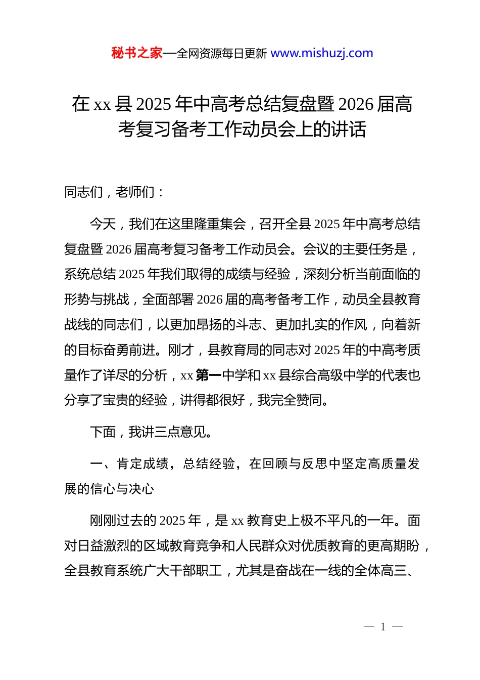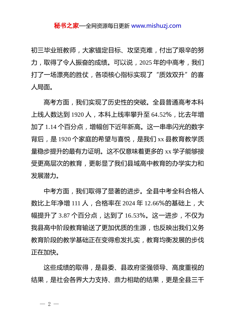 秘书之家—全网资源每日更新 www.mishuzj.com在 xx 县 2025 年中高考总结复盘暨 2026 届高考复习备考工作动员会上的讲话同志们,老师们:今天,我们在这里隆重集会,召开全县 2025 年中高考总结复盘暨 2026 届高考复习备考工作动员会。会议的主要任务是,系统总结 2025 年我们取得的成绩与经验,深刻分析当前面临的形势与挑战,全面部署 2026 届的高考备考工作,动员全县教育战线的同志们,以更加昂扬的斗志、更加扎实的作风,向着新的目标奋勇前进。刚才,县教育局的同志对 2025 年的中高考质量作了详尽的分析,xx 第一中学和 xx 县综合高级中学的代表也分享了宝贵的经验,讲得都很好,我完全赞同。下面,我讲三点意见。一、肯定成绩,总结经验,在回顾与反思中坚定高质量发展的信心与决心刚刚过去的 2025 年,是 xx 教育史上极不平凡的一年。面对日益激烈的区域教育竞争和人民群众对优质教育的更高期盼,全县教育系统广大干部职工,尤其是奋战在一线的全体高三、— 1 —秘书之家—全网资源每日更新 www.mishuzj.com初三毕业班教师,大家锚定目标、攻坚克难,付出了艰辛的努力,取得了令人振奋的成绩。可以说,2025 年的中高考,我们打了一场漂亮的胜仗,各项核心指标实现了“质效双升”的喜人局面。高考方面,我们实现了历史性的突破。全县普通高考本科上线人数达到 1920 人,本科上线率攀升至 64.52%,比去年增加了 1.14 个百分点,增幅创下近年新高。这一串串闪光的数字背后,是 1920 个家庭的希望与喜悦,是我们 xx 县教育教学质量稳步提升的最有力证明。这不仅意味着更多的 xx 学子能够接受更高层次的教育,更彰显了我们县域高中教育的办学实力和发展潜力。中考方面,我们取得了显著的进步。全县中考全科合格人数比上年净增 111 人,合格率在 2024 年 12.66%的基础上,大幅提升了 3.87 个百分点,达到了 16.53%。这一进步,不仅为我县高中阶段教育输送了更加优质的生源,也反映出我们义务教育阶段的教学基础正在变得愈发扎实,教育均衡发展的步伐正在加快。这些成绩的取得,是县委、县政府坚强领导、高度重视的结果,是社会各界大力支持、鼎力相助的结果,更是全县三千— 2 —秘书之家—全网资源每日更新 www.mishuzj.com多名教育工作者,特别是毕业班全体师生,同心同德、奋力拼搏的结果。在此,我代表县委、县政府,向在 2025 年中高考备考工作中取得优异成绩的各个学校、各位老师和同学们,表示热烈的祝贺!向长期以来辛勤耕耘、默默奉献在教育战线上的全体教职员工,致以崇高的敬意和衷心的感谢!回顾过去一年的备考历程,我们不仅收获了成绩,更积累了宝贵的经验。一是目标引领的导向作用更加凸显。我们从一开始就确立了清晰、具体、催人奋进的目标,并将目标层层分解,落实到每个学校、每个年级、每个班级乃至每个学生,形成了“人人有指标、千斤重担大家挑”的强大合力。二是精细管理的支撑作用更加有力。各学校普遍加强了对备考工作的全过程管理,从教学计划的制定、集体备课的深化,到模拟考试的组织、考后分析的跟进,每一个环节都力求精细、精准、精致,有效提升了备考工作的科学性和针对性。三是团队协作的攻坚作用更加彰明。无论是学校管理层、年级管委会,还是学科教研组、班主任团队,大家心往一处想,劲往一处使,形成了强大的战斗集体。特别是 xx 第一中学 2025 届高三年级管委会和 xx 县综合高中高三班主任团队,他们分享的经验充分说明,一个团结协作、富有战斗力的团队,是克敌制胜的法宝。四是— 3 —秘书之家—全网资源每日更新 www.mishuzj.com教师队伍的奉献精神更加可贵。广大毕业班教师以校为家,舍小家、顾大家,把全部心血倾注在学生身上,用专业的素养、无私的奉献和深沉的爱,托举起学生的成才梦想。你们的付出,县委、县政府看在眼里,全县人民记在心里。这些经验,是我们在实践中探索出的成功路径,是 xx 教育的宝贵财富,我们必须在今后的工作中长期坚持,并不断发扬光大。二、认清形势,科学谋划,在对标与赶超中明确新一轮备考的思路与目标在肯定成绩的同时,我们更要清醒...