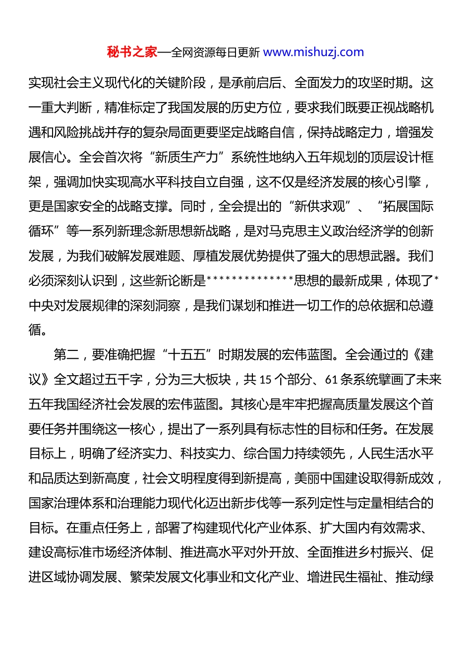 秘书之家—全网资源每日更新 www.mishuzj.com在某局中心组学习贯彻四中全会精神上的总结讲话同志们:今天,我们召开局中心组学习(扩大)会议,主要任务是专题学习领会刚刚胜利闭幕的*的二十届四中全会精神。刚才,几位同志结合思想和工作实际,交流了学习体会,讲得都很好,听后很受启发。这充分说明,大家对这次全会的重大意义、精神实质和核心要义有了初步的、深刻的认识。*的二十届四中全会,是在中华人民共和国成立 76 周年之际,在全面建设社会主义现代化国家、向第二个百年奋斗目标进军的关键时刻,召开的一次具有全局性、历史性意义的重要会议。全会审议通过的《中共中央关于制定国民经济和社会发展第十五个五年规划的建议》,是指导我国未来五年乃至更长时期发展的纲领性文件为我们在新征程上推进中国式现代化指明了前进方向、提供了根本遵循。学习好、宣传好、贯彻好*的二十届四中全会精神,是当前和今后一个时期全区司法行政系统的首要政治任务。下面,我结合大家的发言和自己的学习思考,讲三点意见,与同志们共勉。一、深刻领悟,准确把握*的二十届四中全会精神学之愈深,知之愈明,行之愈笃。*的二十届四中全会精神内涵丰富、思想深邃、博大精深,我们必须原原本本学、融会贯通悟,才能真正把握其精髓要义,切实把思想和行动统一到*中央的决策部署上来。第一,要深刻领悟全会作出的一系列重大新论断。全会科学分析了当前和今后一个时期我国发展面临的内外环境,指出“十五五”时期是基本秘书之家—全网资源每日更新 www.mishuzj.com实现社会主义现代化的关键阶段,是承前启后、全面发力的攻坚时期。这一重大判断,精准标定了我国发展的历史方位,要求我们既要正视战略机遇和风险挑战并存的复杂局面更要坚定战略自信,保持战略定力,增强发展信心。全会首次将“新质生产力”系统性地纳入五年规划的顶层设计框架,强调加快实现高水平科技自立自强,这不仅是经济发展的核心引擎,更是国家安全的战略支撑。同时,全会提出的“新供求观”、“拓展国际循环”等一系列新理念新思想新战略,是对马克思主义政治经济学的创新发展,为我们破解发展难题、厚植发展优势提供了强大的思想武器。我们必须深刻认识到,这些新论断是**************思想的最新成果,体现了*中央对发展规律的深刻洞察,是我们谋划和推进一切工作的总依据和总遵循。第二,要准确把握“十五五”时期发展的宏伟蓝图。全会通过的《建议》全文超过五千字,分为三大板块,共 15 个部分、61 条系统擘画了未来五年我国经济社会发展的宏伟蓝图。其核心是牢牢把握高质量发展这个首要任务并围绕这一核心,提出了一系列具有标志性的目标和任务。在发展目标上,明确了经济实力、科技实力、综合国力持续领先,人民生活水平和品质达到新高度,社会文明程度得到新提高,美丽中国建设取得新成效,国家治理体系和治理能力现代化迈出新步伐等一系列定性与定量相结合的目标。在重点任务上,部署了构建现代化产业体系、扩大国内有效需求、建设高标准市场经济体制、推进高水平对外开放、全面推进乡村振兴、促进区域协调发展、繁荣发展文化事业和文化产业、增进民生福祉、推动绿秘书之家—全网资源每日更新 www.mishuzj.com色低碳发展、统筹发展和安全等十二个方面的重大任务。这一蓝图,目标清晰、路径明确、措施有力,充分体现了坚持*的全面领导、坚持以人民为中心、坚持新发展理念、坚持深化改革开放、坚持系统观念的“六个必须”原则是动员全*全国各族人民奋力谱写中国式现代化新篇章的行动纲领。第三,要牢牢坚守全会强调的根本政治保证。办好中国的事情,关键在*。全会公报旗帜鲜明地强调,实现“十五五”规划和 2035 年远景目标,必须坚持和加强*的全面领导。这是我们在任何时候、任何情况下都必须坚守的最高政治原则。全会要求,要坚定不移推进全面从严治*,深入推进新时代*的建设新的伟大工程,以*的自我革命引领社会革命。这对我们司法行政机关提出了更高要求。作为政治机关、法治部门,我们必须把*的绝对领导贯穿到司法行政工作的全过程、各方面,深刻领悟“两个确立”的决定性意义,坚决做到“两个维护”,...