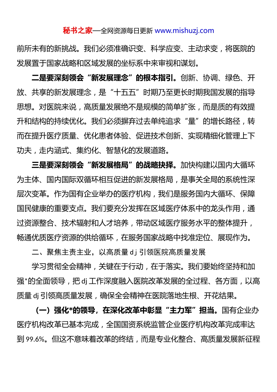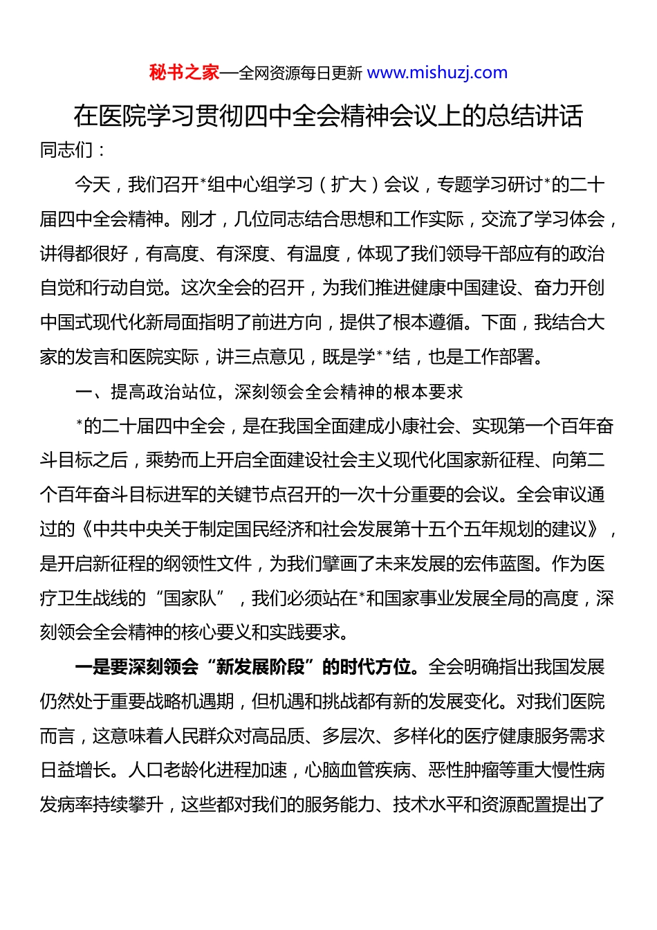 秘书之家—全网资源每日更新 www.mishuzj.com在医院学习贯彻四中全会精神会议上的总结讲话同志们:今天,我们召开*组中心组学习(扩大)会议,专题学习研讨*的二十届四中全会精神。刚才,几位同志结合思想和工作实际,交流了学习体会,讲得都很好,有高度、有深度、有温度,体现了我们领导干部应有的政治自觉和行动自觉。这次全会的召开,为我们推进健康中国建设、奋力开创中国式现代化新局面指明了前进方向,提供了根本遵循。下面,我结合大家的发言和医院实际,讲三点意见,既是学**结,也是工作部署。一、提高政治站位,深刻领会全会精神的根本要求*的二十届四中全会,是在我国全面建成小康社会、实现第一个百年奋斗目标之后,乘势而上开启全面建设社会主义现代化国家新征程、向第二个百年奋斗目标进军的关键节点召开的一次十分重要的会议。全会审议通过的《中共中央关于制定国民经济和社会发展第十五个五年规划的建议》,是开启新征程的纲领性文件,为我们擘画了未来发展的宏伟蓝图。作为医疗卫生战线的“国家队”,我们必须站在*和国家事业发展全局的高度,深刻领会全会精神的核心要义和实践要求。一是要深刻领会“新发展阶段”的时代方位。全会明确指出我国发展仍然处于重要战略机遇期,但机遇和挑战都有新的发展变化。对我们医院而言,这意味着人民群众对高品质、多层次、多样化的医疗健康服务需求日益增长。人口老龄化进程加速,心脑血管疾病、恶性肿瘤等重大慢性病发病率持续攀升,这些都对我们的服务能力、技术水平和资源配置提出了秘书之家—全网资源每日更新 www.mishuzj.com前所未有的新挑战。我们必须准确识变、科学应变、主动求变,将医院的发展置于国家战略和区域发展的坐标系中来审视和谋划。二是要深刻领会“新发展理念”的根本指引。创新、协调、绿色、开放、共享的新发展理念,是“十五五”时期乃至更长时期我国发展的指导思想。对医院来说,高质量发展绝不是规模的简单扩张,而是质的有效提升和结构的持续优化。我们必须摒弃过去单纯追求“量”的增长路径,转而在提升医疗质量、优化患者体验、促进技术创新、实现精细化管理上下功夫,走内涵式、集约化、智慧化的发展道路。三是要深刻领会“新发展格局”的战略抉择。加快构建以国内大循环为主体、国内国际双循环相互促进的新发展格局,是事关全局的系统性深层次变革。作为国有企业举办的医疗机构,我们是服务国内大循环、保障国民健康的重要支点。我们要充分发挥在区域医疗体系中的龙头作用,通过资源整合、技术辐射和人才培养,带动区域医疗服务水平的整体提升,畅通优质医疗资源的供给循环,在服务国家战略中找准定位、展现作为。二、聚焦主责主业,以高质量 dj 引领医院高质量发展学习贯彻全会精神,关键在于行动,在于落实。我们要始终坚持和加强*的全面领导,把 dj 工作深度融入医院改革发展的全过程、各方面,以高质量 dj 引领高质量发展,确保全会精神在医院落地生根、开花结果。(一)强化*的领导,在深化改革中彰显“主力军”担当。国有企业办医疗机构改革已基本完成,全国国资系统监管企业医疗机构改革完成率达到 99.6%。但这不意味着改革的终结,而是专业化整合、高质量发展新征程秘书之家—全网资源每日更新 www.mishuzj.com的开始。作为**集团医疗健康板块的核心力量,我们要在新一轮国企改革深化提升行动中继续当先锋、作表率。*组要切实发挥“把方向、管大局、保落实”的领导作用,坚持公立医院的公益性导向,确保改革不偏向、发展不走样。我们要主动融入区域医疗一体化发展,牵头构建紧密型医联体,将我们的优质资源、先进技术和管理经验下沉到基层,提升区域医疗服务的同质化、均质化水平,在破解群众“看病难”问题上发挥关键作用。这既是我们的社会责任,也是我们作为国有医疗机构“主力军”的核心价值所在。(二)紧扣年度目标,在精细化管理中提升发展“含金量”。发展是硬道理,数据是试金石。面对即将到来的 2025 年收官之战,我们必须紧盯年度目标不放松,以钉钉子精神抓好各项任务落实。根据院务会研究的方案,我们 2025 年的核心发展目标是:实现门急诊人次同比增长...