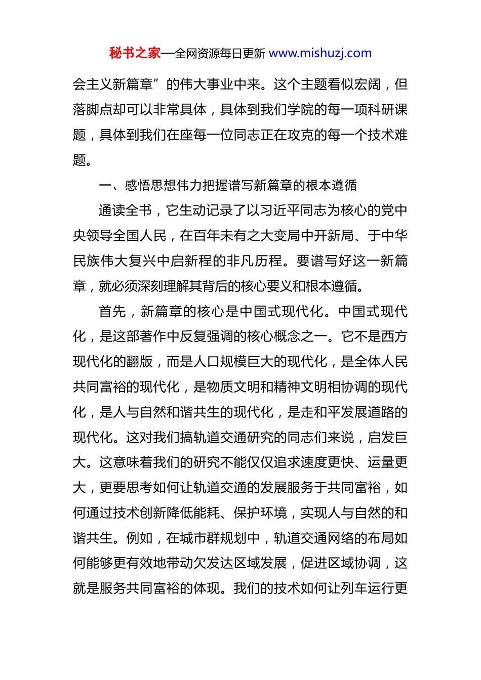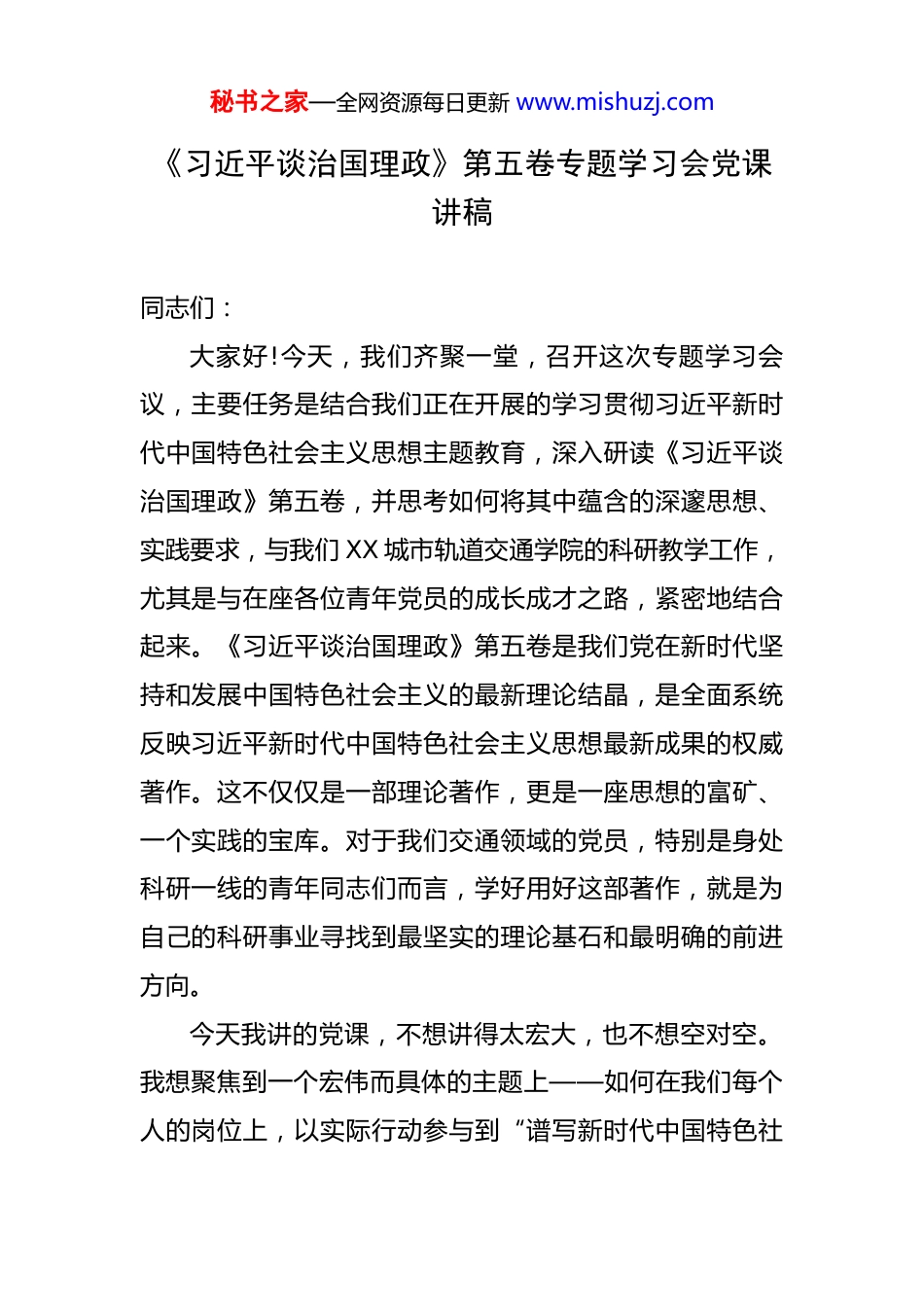 秘书之家—全网资源每日更新 www.mishuzj.com《习近平谈治国理政》第五卷专题学习会党课讲稿 同志们:大家好!今天,我们齐聚一堂,召开这次专题学习会议,主要任务是结合我们正在开展的学习贯彻习近平新时代中国特色社会主义思想主题教育,深入研读《习近平谈治国理政》第五卷,并思考如何将其中蕴含的深邃思想、实践要求,与我们 XX 城市轨道交通学院的科研教学工作,尤其是与在座各位青年党员的成长成才之路,紧密地结合起来。《习近平谈治国理政》第五卷是我们党在新时代坚持和发展中国特色社会主义的最新理论结晶,是全面系统反映习近平新时代中国特色社会主义思想最新成果的权威著作。这不仅仅是一部理论著作,更是一座思想的富矿、一个实践的宝库。对于我们交通领域的党员,特别是身处科研一线的青年同志们而言,学好用好这部著作,就是为自己的科研事业寻找到最坚实的理论基石和最明确的前进方向。今天我讲的党课,不想讲得太宏大,也不想空对空。我想聚焦到一个宏伟而具体的主题上——如何在我们每个人的岗位上,以实际行动参与到“谱写新时代中国特色社秘书之家—全网资源每日更新 www.mishuzj.com会主义新篇章”的伟大事业中来。这个主题看似宏阔,但落脚点却可以非常具体,具体到我们学院的每一项科研课题,具体到我们在座每一位同志正在攻克的每一个技术难题。一、感悟思想伟力把握谱写新篇章的根本遵循通读全书,它生动记录了以习近平同志为核心的党中央领导全国人民,在百年未有之大变局中开新局、于中华民族伟大复兴中启新程的非凡历程。要谱写好这一新篇章,就必须深刻理解其背后的核心要义和根本遵循。首先,新篇章的核心是中国式现代化。中国式现代化,是这部著作中反复强调的核心概念之一。它不是西方现代化的翻版,而是人口规模巨大的现代化,是全体人民共同富裕的现代化,是物质文明和精神文明相协调的现代化,是人与自然和谐共生的现代化,是走和平发展道路的现代化。这对我们搞轨道交通研究的同志们来说,启发巨大。这意味着我们的研究不能仅仅追求速度更快、运量更大,更要思考如何让轨道交通的发展服务于共同富裕,如何通过技术创新降低能耗、保护环境,实现人与自然的和谐共生。例如,在城市群规划中,轨道交通网络的布局如何能够更有效地带动欠发达区域发展,促进区域协调,这就是服务共同富裕的体现。我们的技术如何让列车运行更秘书之家—全网资源每日更新 www.mishuzj.com安静、振动更小,减少对沿线居民的干扰,这就是精神文明与和谐社会的考量。其次,新篇章的底色是高质量发展。书中深刻指出,高质量发展是全面建设社会主义现代化国家的首要任务。对于交通运输行业而言,这意味着发展方式要从过去的要素驱动、投资驱动,真正转向创新驱动。我们正处在这样一个历史性的转折点上。交通强国建设,强在哪?不仅仅是规模,核心是“强”在质量和效益。这要求我们必须把科技创新摆在核心位置。目前,我国交通运输行业正加速推进智慧化、绿色化转型。对于我们**城市轨道交通学院的研究生党员来说,你们的科研方向,无论是新材料、智能控制系统,还是大数据运维,都应该是瞄准高质量发展的靶心,致力于解决那些提升交通运输质量和效率的关键问题。再次,新篇章的立场是始终坚持人民至上。“江山就是人民,人民就是江山”。这是《习近平谈治国理政》贯穿全书的鲜明立场。交通发展为了谁?答案不言而喻,是为了人民。交通建设的成果要由人民共享。这听起来似乎是原则性的要求,但完全可以落实到具体的科研工作中。我们设计的换乘方案,是否能让步履蹒跚的老人少走几步路?我们研发的售检票系统,是否能让行色匆匆的上班族节约秘书之家—全网资源每日更新 www.mishuzj.com几分钟时间?我们优化的列车运行图,是否能让深夜回家的市民减少一份等待的焦虑?这些看似细微之处,恰恰是“人民至上”理念最生动的体现。把科研论文写在祖国大地上,更要写在人民群众的心坎里。最后,新篇章的保障是坚持和加强党的全面领导。办好中国的事情,关键在党。这是被历史和实践反复证明的真理。在建设交通强国的征程中,同样需要党的坚强领导来统揽全局、协调各方。对于我们...
