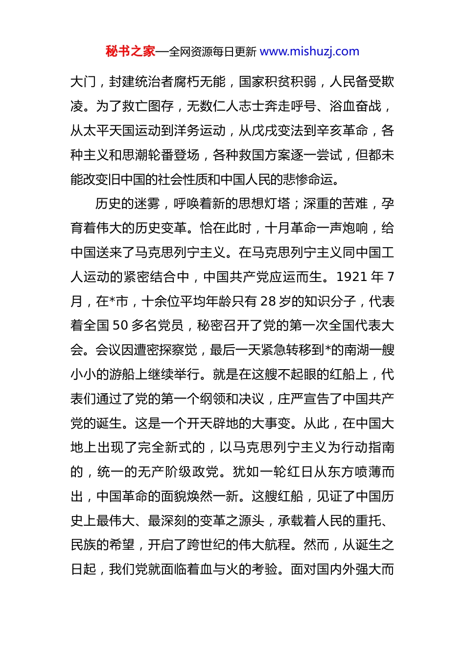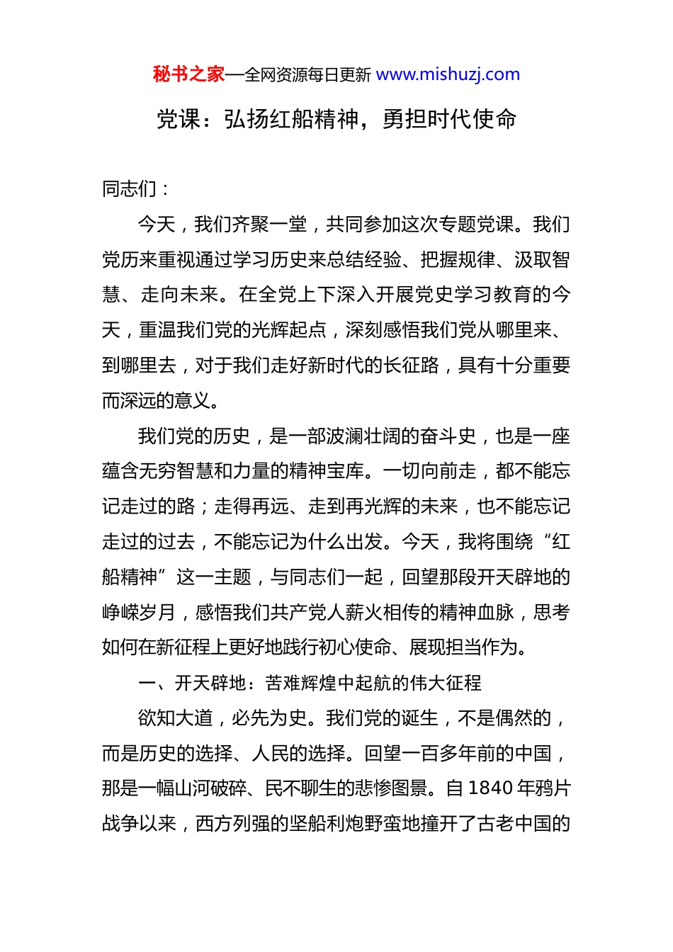 秘书之家—全网资源每日更新 www.mishuzj.com党课:弘扬红船精神,勇担时代使命 同志们:今天,我们齐聚一堂,共同参加这次专题党课。我们党历来重视通过学习历史来总结经验、把握规律、汲取智慧、走向未来。在全党上下深入开展党史学习教育的今天,重温我们党的光辉起点,深刻感悟我们党从哪里来、到哪里去,对于我们走好新时代的长征路,具有十分重要而深远的意义。我们党的历史,是一部波澜壮阔的奋斗史,也是一座蕴含无穷智慧和力量的精神宝库。一切向前走,都不能忘记走过的路;走得再远、走到再光辉的未来,也不能忘记走过的过去,不能忘记为什么出发。今天,我将围绕“红船精神”这一主题,与同志们一起,回望那段开天辟地的峥嵘岁月,感悟我们共产党人薪火相传的精神血脉,思考如何在新征程上更好地践行初心使命、展现担当作为。一、开天辟地:苦难辉煌中起航的伟大征程欲知大道,必先为史。我们党的诞生,不是偶然的,而是历史的选择、人民的选择。回望一百多年前的中国,那是一幅山河破碎、民不聊生的悲惨图景。自 1840 年鸦片战争以来,西方列强的坚船利炮野蛮地撞开了古老中国的秘书之家—全网资源每日更新 www.mishuzj.com大门,封建统治者腐朽无能,国家积贫积弱,人民备受欺凌。为了救亡图存,无数仁人志士奔走呼号、浴血奋战,从太平天国运动到洋务运动,从戊戌变法到辛亥革命,各种主义和思潮轮番登场,各种救国方案逐一尝试,但都未能改变旧中国的社会性质和中国人民的悲惨命运。历史的迷雾,呼唤着新的思想灯塔;深重的苦难,孕育着伟大的历史变革。恰在此时,十月革命一声炮响,给中国送来了马克思列宁主义。在马克思列宁主义同中国工人运动的紧密结合中,中国共产党应运而生。1921 年 7月,在*市,十余位平均年龄只有 28 岁的知识分子,代表着全国 50 多名党员,秘密召开了党的第一次全国代表大会。会议因遭密探察觉,最后一天紧急转移到*的南湖一艘小小的游船上继续举行。就是在这艘不起眼的红船上,代表们通过了党的第一个纲领和决议,庄严宣告了中国共产党的诞生。这是一个开天辟地的大事变。从此,在中国大地上出现了完全新式的,以马克思列宁主义为行动指南的,统一的无产阶级政党。犹如一轮红日从东方喷薄而出,中国革命的面貌焕然一新。这艘红船,见证了中国历史上最伟大、最深刻的变革之源头,承载着人民的重托、民族的希望,开启了跨世纪的伟大航程。然而,从诞生之日起,我们党就面临着血与火的考验。面对国内外强大而秘书之家—全网资源每日更新 www.mishuzj.com残暴的敌人,我们党团结带领人民,进行了艰苦卓绝的斗争。从南昌城头的第一声枪响,到井冈山的星星之火;从二万五千里长征的浴血奋战,到遵义会议的伟大转折。一位伟大的*同志曾深刻指出:“枪杆子里面出政权。”正是认识到这一点,我们党创建了人民的军队,走上了武装夺取政权的唯一正确道路。在漫漫长夜里,无数革命先辈坚信,“星星之火,可以燎原”,用生命和鲜血探索着中国革命的道路。在艰苦卓绝的抗日战争中,我们党高举抗日民族统一战线的旗帜,成为全民族抗战的中流砥柱。在决定中国命运的解放战争中,我们党以摧枯拉朽之势,推翻了压在中国人民头上的三座大山,建立了人民当家作主的新中国。一位伟大的*同志曾豪迈地写下诗句:“为有牺牲多壮志,敢教日月换新天。”这正是对那段艰苦卓绝、气壮山河的革命岁月的生动写照。从南湖上的一叶扁舟,到领航中国行稳致远的巍巍巨轮,我们党之所以能够历经百年而风华正茂、饱经磨难而生生不息,最根本的,就是因为我们党从诞生之日起,就铸就了一种伟大精神——红船精神。它犹如一颗红色的种子,在我们党的奋斗历程中,生根发芽,茁壮成长,形成了包括井冈山精神、长征精神、延安精神、西柏坡精神等在内的,一脉相承而又与时俱进的伟大精神谱系。秘书之家—全网资源每日更新 www.mishuzj.com二、精神之源:红船精神的深刻内涵与时代价值红船精神,是我们党的精神之源,是我们共产党人初心和使命的集中体现。它博大精深,内涵丰富,集中体现为“开天辟地、敢为人先的首创精神,坚定理想、百折不挠的奋斗精神,立党为公、...