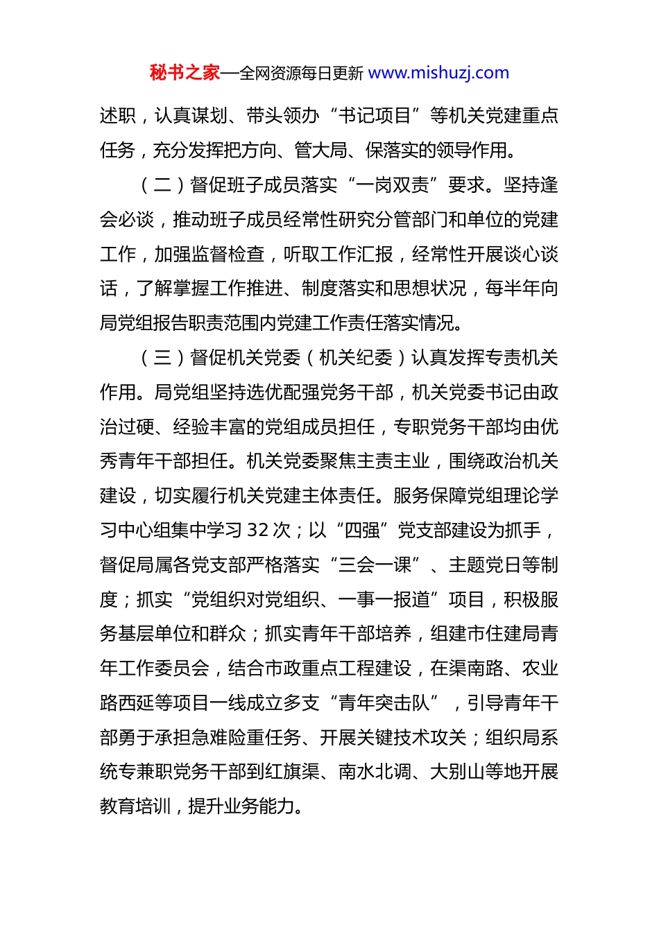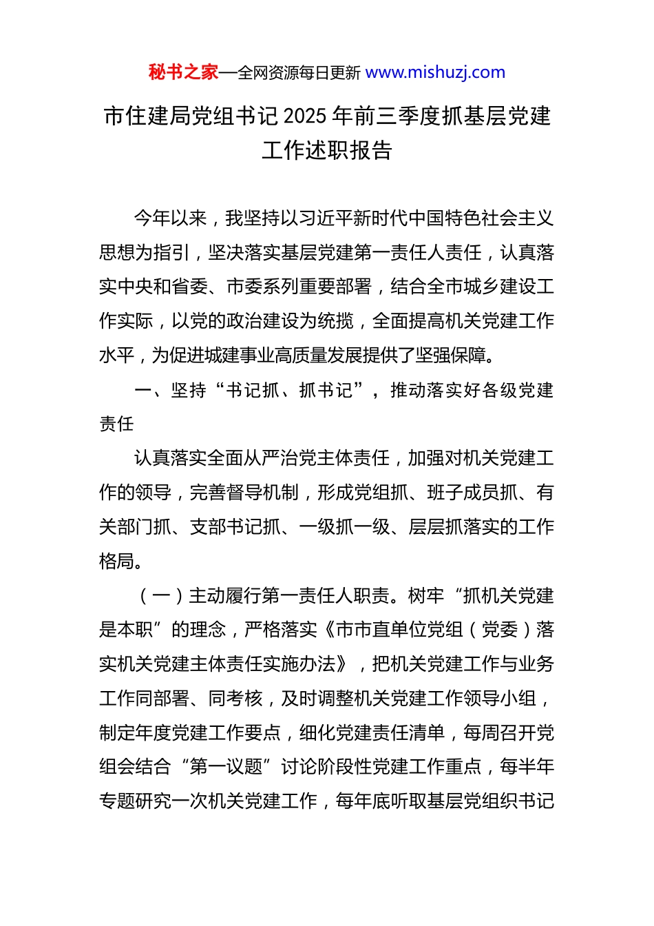 秘书之家—全网资源每日更新 www.mishuzj.com市住建局党组书记 2025 年前三季度抓基层党建工作述职报告 今年以来,我坚持以习近平新时代中国特色社会主义思想为指引,坚决落实基层党建第一责任人责任,认真落实中央和省委、市委系列重要部署,结合全市城乡建设工作实际,以党的政治建设为统揽,全面提高机关党建工作水平,为促进城建事业高质量发展提供了坚强保障。一、坚持“书记抓、抓书记”,推动落实好各级党建责任认真落实全面从严治党主体责任,加强对机关党建工作的领导,完善督导机制,形成党组抓、班子成员抓、有关部门抓、支部书记抓、一级抓一级、层层抓落实的工作格局。(一)主动履行第一责任人职责。树牢“抓机关党建是本职”的理念,严格落实《市市直单位党组(党委)落实机关党建主体责任实施办法》,把机关党建工作与业务工作同部署、同考核,及时调整机关党建工作领导小组,制定年度党建工作要点,细化党建责任清单,每周召开党组会结合“第一议题”讨论阶段性党建工作重点,每半年专题研究一次机关党建工作,每年底听取基层党组织书记秘书之家—全网资源每日更新 www.mishuzj.com述职,认真谋划、带头领办“书记项目”等机关党建重点任务,充分发挥把方向、管大局、保落实的领导作用。(二)督促班子成员落实“一岗双责”要求。坚持逢会必谈,推动班子成员经常性研究分管部门和单位的党建工作,加强监督检查,听取工作汇报,经常性开展谈心谈话,了解掌握工作推进、制度落实和思想状况,每半年向局党组报告职责范围内党建工作责任落实情况。(三)督促机关党委(机关纪委)认真发挥专责机关作用。局党组坚持选优配强党务干部,机关党委书记由政治过硬、经验丰富的党组成员担任,专职党务干部均由优秀青年干部担任。机关党委聚焦主责主业,围绕政治机关建设,切实履行机关党建主体责任。服务保障党组理论学习中心组集中学习 32 次;以“四强”党支部建设为抓手,督促局属各党支部严格落实“三会一课”、主题党日等制度;抓实“党组织对党组织、一事一报道”项目,积极服务基层单位和群众;抓实青年干部培养,组建市住建局青年工作委员会,结合市政重点工程建设,在渠南路、农业路西延等项目一线成立多支“青年突击队”,引导青年干部勇于承担急难险重任务、开展关键技术攻关;组织局系统专兼职党务干部到红旗渠、南水北调、大别山等地开展教育培训,提升业务能力。秘书之家—全网资源每日更新 www.mishuzj.com(四)督促局属各党组织书记履行好抓党建工作责任。将基层党组织书记履行党建责任情况作为年度述职评议的重要内容,并作为确定年度考核等次的重要依据,党建考核垫底的不得评为“优秀”等次。督促基层党组织书记抓好班子、带好队伍,持续提升基层党组织组织力、凝聚力、战斗力。二、坚持抓基层、打基础,推动锻造强有力战斗堡垒以强化政治功能为重点,督促各基层党组织落实制度规定提升组织能力,找准职能定位,充分发挥“顶梁柱”“压舱石”作用,切实把党的政治优势和组织优势转化为制胜优势。(一)持续强化理论武装,深化政治机关建设。通过“第一议题”、中心组学习、“三会一课”、专题讲座、脱产培训等形式,带领局系统全体党员干部认真学习贯彻习近平新时代中国特色社会主义思想、党的二十大及二十届三中全会精神、习近平总书记在考察时重要讲话精神和关于工作的重要论述,聚焦“两高四着力”等重大要求,坚持读原著学原文悟原理,做到深学笃信、精思细悟、知行合一,持续强化理论武装,不断提升“政治三力”,努力在政治机关建设上“走在前、作表率”,以实际行动拥护“两个确立”、做到“两个维护”。秘书之家—全网资源每日更新 www.mishuzj.com(二)严格落实组织生活制度,打造更多“四强”党支部。抓实“三会一课”等各项制度,班子成员带头以普通党员身份参加所在支部活动,带头给分管处室和单位讲党课。到市政工程一线、廉政教育基地、庭审现场等,开展多样式、“沉浸式”主题党日活动,提升党建活动吸引力实效性。突出抓好“四强”党支部建设,充分发挥典型示范作用,带动各级基层党组织奋勇争先、担当作为,目前共创建“四强...