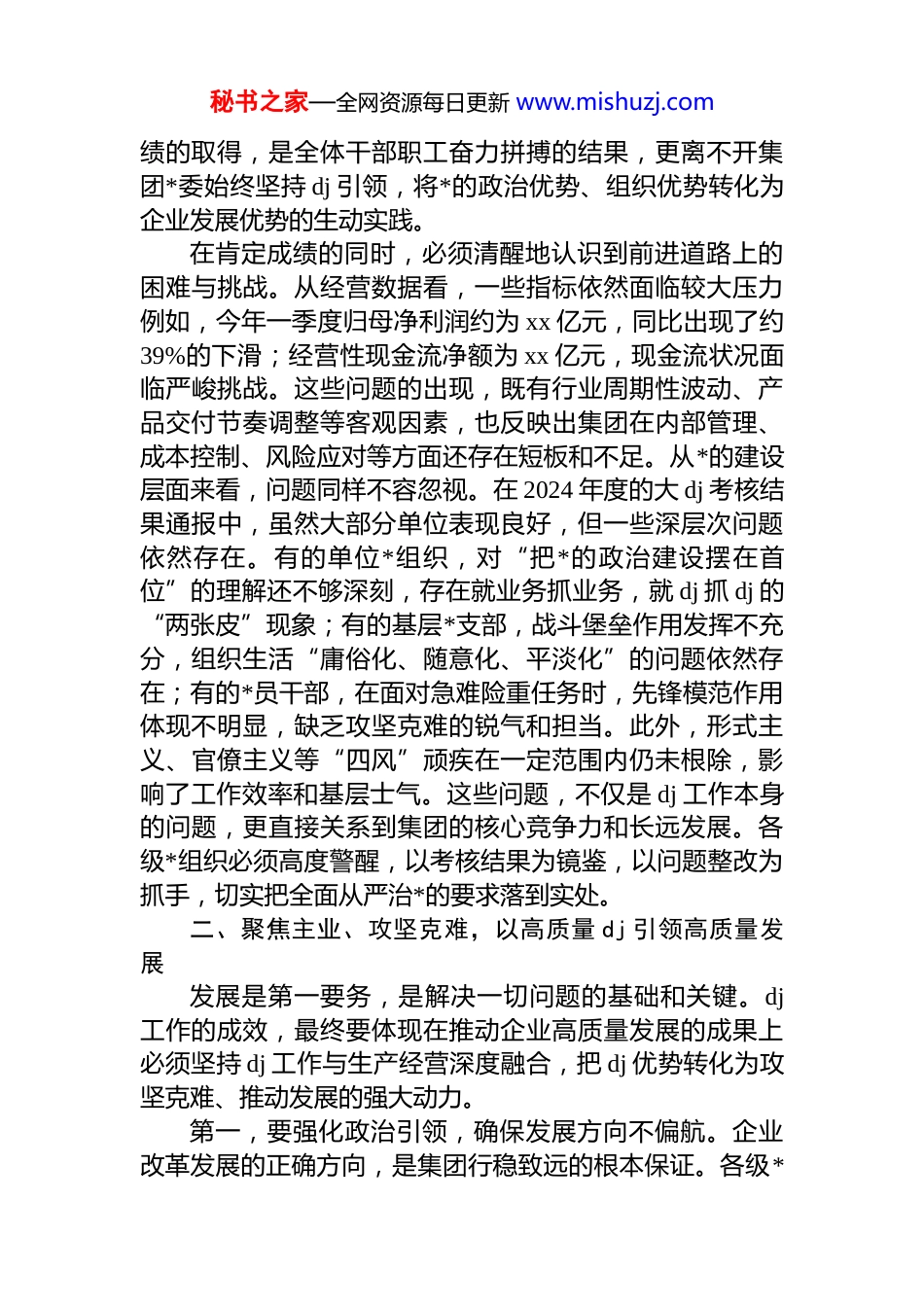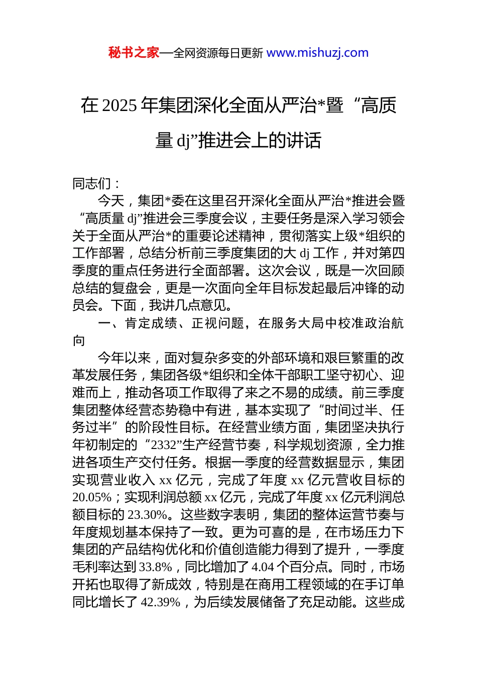 秘书之家—全网资源每日更新 www.mishuzj.com在 2025 年集团深化全面从严治*暨“高质量 dj”推进会上的讲话同志们:今天,集团*委在这里召开深化全面从严治*推进会暨“高质量 dj”推进会三季度会议,主要任务是深入学习领会关于全面从严治*的重要论述精神,贯彻落实上级*组织的工作部署,总结分析前三季度集团的大 dj 工作,并对第四季度的重点任务进行全面部署。这次会议,既是一次回顾总结的复盘会,更是一次面向全年目标发起最后冲锋的动员会。下面,我讲几点意见。一、肯定成绩、正视问题,在服务大局中校准政治航向今年以来,面对复杂多变的外部环境和艰巨繁重的改革发展任务,集团各级*组织和全体干部职工坚守初心、迎难而上,推动各项工作取得了来之不易的成绩。前三季度集团整体经营态势稳中有进,基本实现了“时间过半、任务过半”的阶段性目标。在经营业绩方面,集团坚决执行年初制定的“2332”生产经营节奏,科学规划资源,全力推进各项生产交付任务。根据一季度的经营数据显示,集团实现营业收入 xx 亿元,完成了年度 xx 亿元营收目标的20.05%;实现利润总额 xx 亿元,完成了年度 xx 亿元利润总额目标的 23.30%。这些数字表明,集团的整体运营节奏与年度规划基本保持了一致。更为可喜的是,在市场压力下集团的产品结构优化和价值创造能力得到了提升,一季度毛利率达到 33.8%,同比增加了 4.04 个百分点。同时,市场开拓也取得了新成效,特别是在商用工程领域的在手订单同比增长了 42.39%,为后续发展储备了充足动能。这些成秘书之家—全网资源每日更新 www.mishuzj.com绩的取得,是全体干部职工奋力拼搏的结果,更离不开集团*委始终坚持 dj 引领,将*的政治优势、组织优势转化为企业发展优势的生动实践。在肯定成绩的同时,必须清醒地认识到前进道路上的困难与挑战。从经营数据看,一些指标依然面临较大压力例如,今年一季度归母净利润约为 xx 亿元,同比出现了约39%的下滑;经营性现金流净额为 xx 亿元,现金流状况面临严峻挑战。这些问题的出现,既有行业周期性波动、产品交付节奏调整等客观因素,也反映出集团在内部管理、成本控制、风险应对等方面还存在短板和不足。从*的建设层面来看,问题同样不容忽视。在 2024 年度的大 dj 考核结果通报中,虽然大部分单位表现良好,但一些深层次问题依然存在。有的单位*组织,对“把*的政治建设摆在首位”的理解还不够深刻,存在就业务抓业务,就 dj 抓 dj 的“两张皮”现象;有的基层*支部,战斗堡垒作用发挥不充分,组织生活“庸俗化、随意化、平淡化”的问题依然存在;有的*员干部,在面对急难险重任务时,先锋模范作用体现不明显,缺乏攻坚克难的锐气和担当。此外,形式主义、官僚主义等“四风”顽疾在一定范围内仍未根除,影响了工作效率和基层士气。这些问题,不仅是 dj 工作本身的问题,更直接关系到集团的核心竞争力和长远发展。各级*组织必须高度警醒,以考核结果为镜鉴,以问题整改为抓手,切实把全面从严治*的要求落到实处。二、聚焦主业、攻坚克难,以高质量 dj 引领高质量发展发展是第一要务,是解决一切问题的基础和关键。dj工作的成效,最终要体现在推动企业高质量发展的成果上必须坚持 dj 工作与生产经营深度融合,把 dj 优势转化为攻坚克难、推动发展的强大动力。第一,要强化政治引领,确保发展方向不偏航。企业改革发展的正确方向,是集团行稳致远的根本保证。各级*秘书之家—全网资源每日更新 www.mishuzj.com组织要始终将政治建设放在首位,坚持用*的创新理论武装头脑、指导实践。今年以来,集团*委坚持“第一议题”制度,累计集中学习 15 次,召开*委会 23 次,审议重大议题142 项,确保上级*组织的各项决策部署在集团得到不折不扣地贯彻执行。下一步,各所属单位*组织要进一步健全完善“第一议题”学习和贯彻落实机制,不仅要学深悟透,更要紧密结合本单位实际,研究制定具体的转化措施和行动方案,确保上级精神能够真正转化为推动本单位科技创新、管理变革和市场开拓的实际成效。要把讲政治体现在每一项决策、每一个项目、每一个环节中,确保集团...