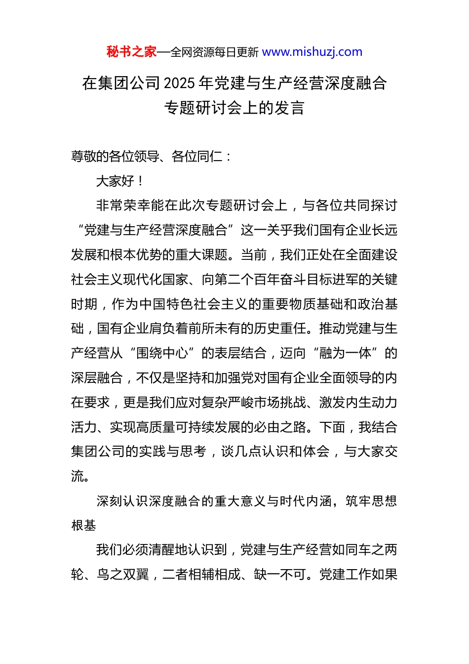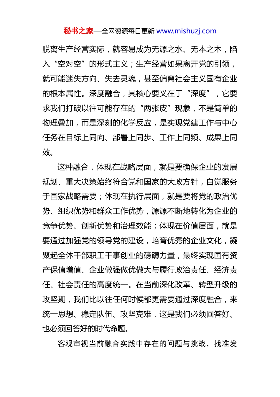 秘书之家—全网资源每日更新 www.mishuzj.com在集团公司 2025 年党建与生产经营深度融合专题研讨会上的发言 尊敬的各位领导、各位同仁:大家好!非常荣幸能在此次专题研讨会上,与各位共同探讨“党建与生产经营深度融合”这一关乎我们国有企业长远发展和根本优势的重大课题。当前,我们正处在全面建设社会主义现代化国家、向第二个百年奋斗目标进军的关键时期,作为中国特色社会主义的重要物质基础和政治基础,国有企业肩负着前所未有的历史重任。推动党建与生产经营从“围绕中心”的表层结合,迈向“融为一体”的深层融合,不仅是坚持和加强党对国有企业全面领导的内在要求,更是我们应对复杂严峻市场挑战、激发内生动力活力、实现高质量可持续发展的必由之路。下面,我结合集团公司的实践与思考,谈几点认识和体会,与大家交流。深刻认识深度融合的重大意义与时代内涵,筑牢思想根基我们必须清醒地认识到,党建与生产经营如同车之两轮、鸟之双翼,二者相辅相成、缺一不可。党建工作如果秘书之家—全网资源每日更新 www.mishuzj.com脱离生产经营实际,就容易成为无源之水、无本之木,陷入“空对空”的形式主义;生产经营如果离开党的引领,就可能迷失方向、失去灵魂,甚至偏离社会主义国有企业的根本属性。深度融合,其核心要义在于“深度”,它要求我们打破以往可能存在的“两张皮”现象,不是简单的物理叠加,而是深刻的化学反应,是实现党建工作与中心任务在目标上同向、部署上同步、工作上同频、成果上同效。这种融合,体现在战略层面,就是要确保企业的发展规划、重大决策始终符合党和国家的大政方针,自觉服务于国家战略需要;体现在执行层面,就是要将党的政治优势、组织优势和群众工作优势,源源不断地转化为企业的竞争优势、创新优势和治理效能;体现在价值层面,就是要通过加强党的领导党的建设,培育优秀的企业文化,凝聚起全体干部职工干事创业的磅礴力量,最终实现国有资产保值增值、企业做强做优做大与履行政治责任、经济责任、社会责任的高度统一。在当前深化改革、转型升级的攻坚期,我们比以往任何时候都更需要通过深度融合,来统一思想、稳定队伍、攻坚克难,这是我们必须回答好、也必须回答好的时代命题。客观审视当前融合实践中存在的问题与挑战,找准发秘书之家—全网资源每日更新 www.mishuzj.com力方向在肯定我们过去在结合方面取得成绩的同时,我们也要有勇气直面存在的问题和深层次的挑战。坦率地说,在一些领域、一些层面,“两张皮”的现象依然不同程度地存在。比如,有时党建工作与业务工作在工作计划、部署落实上还是“各定各的调、各吹各的号”,缺乏系统性的统筹谋划;有的基层党组织活动方式方法陈旧,与项目攻坚、技术研发、市场开拓等中心任务结合不够紧密,吸引力、感染力不足,难以引起业务骨干和一线员工的共鸣;部分党员干部对“一岗双责”的理解还停留在表面,认为党建工作是书记、是党务部门的事,未能将分管领域的党建责任与业务责任有机统一起来;在考核评价上,党建工作与经营业绩考核有时未能实现有效联动,导致“重业务、轻党建”或“党建好等于业务好”的简单化倾向依然存在。这些问题,究其根源,既有思想认识不到位的因素,也有体制机制不健全的原因,更有能力方法不适应的制约。正是这些堵点、难点,构成了我们推动深度融合必须着力破解的关键环节。明确深度融合的总体思路与基本原则,把稳行动之舵面向未来,推动党建与生产经营深度融合,我们必须坚持系统思维,把握内在规律,确立清晰的行动指南。我秘书之家—全网资源每日更新 www.mishuzj.com们的总体思路是:以提升企业核心竞争力和实现高质量发展为根本目标,以完善公司治理中加强党的领导为根本保障,以强化基层党组织战斗堡垒作用和党员先锋模范作用为基本路径,将党的建设贯穿于企业决策、执行、监督各环节,融入改革发展、生产经营、创新驱动、风险防控各方面,努力构建目标一致、协同联动、价值共创的党建与业务发展新格局。在这一过程中,需要牢牢把握几个基本原则。一是坚持政治引领原则。始终将党的政治建设摆在首位,确保企业发展的正确方向,深刻领悟“...