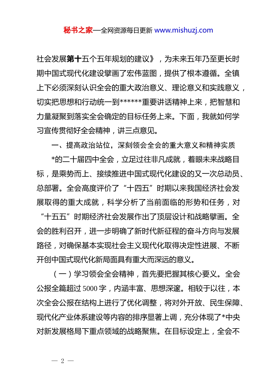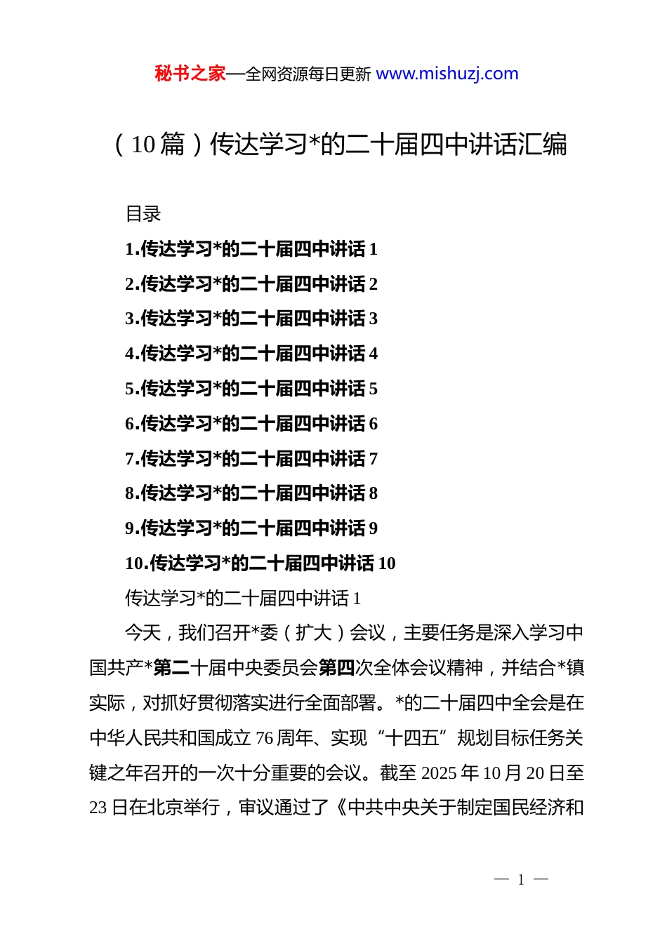秘书之家—全网资源每日更新 www.mishuzj.com(10 篇)传达学习*的二十届四中讲话汇编目录1.传达学习*的二十届四中讲话 12.传达学习*的二十届四中讲话 23.传达学习*的二十届四中讲话 34.传达学习*的二十届四中讲话 45.传达学习*的二十届四中讲话 56.传达学习*的二十届四中讲话 67.传达学习*的二十届四中讲话 78.传达学习*的二十届四中讲话 89.传达学习*的二十届四中讲话 910.传达学习*的二十届四中讲话 10传达学习*的二十届四中讲话 1今天,我们召开*委(扩大)会议,主要任务是深入学习中国共产*第二十届中央委员会第四次全体会议精神,并结合*镇实际,对抓好贯彻落实进行全面部署。*的二十届四中全会是在中华人民共和国成立 76 周年、实现“十四五”规划目标任务关键之年召开的一次十分重要的会议。截至 2025 年 10 月 20 日至23 日在北京举行,审议通过了《中共中央关于制定国民经济和— 1 —秘书之家—全网资源每日更新 www.mishuzj.com社会发展第十五个五年规划的建议》,为未来五年乃至更长时期中国式现代化建设擘画了宏伟蓝图,提供了根本遵循。全镇上下必须深刻认识全会的重大政治意义、理论意义和实践意义,切实把思想和行动统一到******重要讲话精神上来,把智慧和力量凝聚到落实全会确定的目标任务上来。下面,我就如何学习宣传贯彻好全会精神,讲三点意见。一、提高政治站位,深刻领会全会的重大意义和精神实质*的二十届四中全会,立足过往非凡成就,着眼未来战略目标,是乘势而上、接续推进中国式现代化建设的又一次总动员、总部署。全会高度评价了“十四五”时期以来我国经济社会发展取得的重大成就,科学分析了当前面临的形势和任务,对“十五五”时期经济社会发展作出了顶层设计和战略擘画。全会的胜利召开,进一步明确了新时代新征程的奋斗方向与发展路径,对确保基本实现社会主义现代化取得决定性进展、不断开创中国式现代化新局面具有重大而深远的意义。(一)学习领会全会精神,首先要把握其核心要义。全会公报全篇超过 5000 字,内涵丰富、思想深邃。相较于以往,本次全会公报在结构上进行了优化调整,将对外开放、民生保障、现代化产业体系建设等内容的排序显著上调,充分体现了*中央对新发展格局下重点领域的战略聚焦。在目标设定上,全会不— 2 —秘书之家—全网资源每日更新 www.mishuzj.com仅保留了“人均国内生产总值达到中等发达国家水平”的既有目标,更在远景目标中新增了“国防实力”和“国际影响力”两大跃升目标,彰显了统筹发展和安全的深邃考量。在核心战略层面,全会首次将“航天强国”和“农业强国”建设提升至国家战略高度,为我们抢占未来科技制高点、筑牢国家粮食安全根基指明了方向。在发展路径上,全会提出“坚持惠民生和促消费、投资于物和投资于人紧密结合”,并对建设“统一大市场”的措辞更加坚决,同时再度强调“海洋开发”,这些新论述、新要求,为我们破解发展难题、激发内生动力提供了行动指南。(二)学习领会全会精神,关键要结合我们*镇的发展实际。全会精神不是悬在空中的理论,而是指导我们实践的强大思想武器。我们要深刻认识到,*镇的发展是全国、全省、全市发展的一个缩影,全会所作出的每一项战略部署,都与我们息息相关。我们要把学习全会精神与学习贯彻**************思想紧密结合起来,与我们正在推进的“四镇四城”建设紧密结合起来,与我们面临的机遇和挑战紧密结合起来,真正做到学深悟透、融会贯通。全镇*员干部要带着问题学、带着责任学,全面把握全会的实践要求,将学习成果转化为对工作方向的清晰认知、对职责使命的深刻认同,转化为推动*镇高质量发展的强大— 3 —秘书之家—全网资源每日更新 www.mishuzj.com动力和实际成效。(三)学习领会全会精神,还要注重方式方法创新。学习不能仅仅停留在表面,满足于一般性的理解和掌握,而要深入进去,力求学深学透、入脑入心。一方面,要充分利用现代信息技术手段,通过线上学习平台、多媒体资料等,丰富学习形式,增强学习的吸引力和感染力。另一方面,要开展多样化的学习活动,如专题讲座、研讨交流、实地调研等,让*员干部...