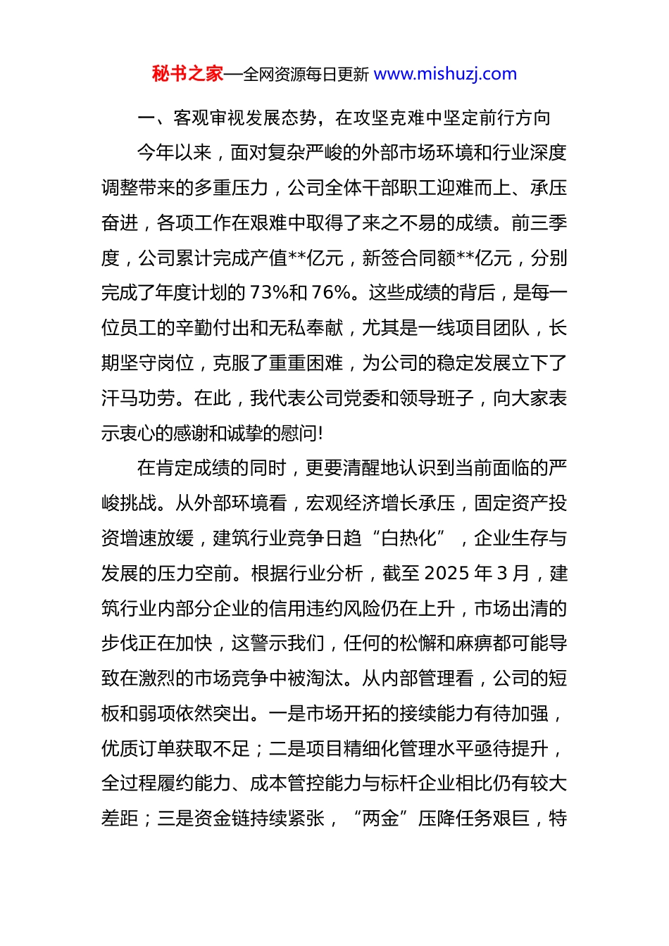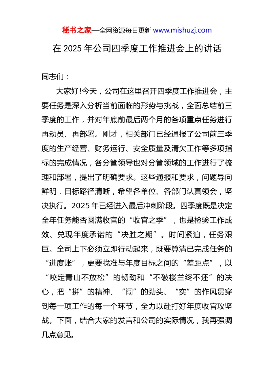 秘书之家—全网资源每日更新 www.mishuzj.com在 2025 年公司四季度工作推进会上的讲话 同志们:大家好!今天,公司在这里召开四季度工作推进会,主要任务是深入分析当前面临的形势与挑战,全面总结前三季度的工作,并对年底前最后两个月的各项重点任务进行再动员、再部署。刚才,相关部门已经通报了公司前三季度的生产经营、财务运行、安全质量及清欠工作等多项指标的完成情况,各分管领导也对分管领域的工作进行了梳理和部署,提出了明确要求。这些通报和要求,问题导向鲜明,目标路径清晰,希望各单位、各部门认真领会,坚决执行。2025 年已经进入最后冲刺阶段。四季度既是决定全年任务能否圆满收官的“收官之季”,也是检验工作成效、兑现年度承诺的“决胜之期”。时间紧迫,任务艰巨。全司上下必须立即行动起来,既要算清已完成任务的“进度账”,更要找准与年度目标之间的“差距点”,以“咬定青山不放松”的韧劲和“不破楼兰终不还”的决心,把“拼”的精神、“闯”的劲头、“实”的作风贯穿到每一项工作的每一个环节,全力以赴打好年度收官攻坚战。下面,结合大家的发言和公司的实际情况,我再强调几点意见。秘书之家—全网资源每日更新 www.mishuzj.com一、客观审视发展态势,在攻坚克难中坚定前行方向今年以来,面对复杂严峻的外部市场环境和行业深度调整带来的多重压力,公司全体干部职工迎难而上、承压奋进,各项工作在艰难中取得了来之不易的成绩。前三季度,公司累计完成产值**亿元,新签合同额**亿元,分别完成了年度计划的 73%和 76%。这些成绩的背后,是每一位员工的辛勤付出和无私奉献,尤其是一线项目团队,长期坚守岗位,克服了重重困难,为公司的稳定发展立下了汗马功劳。在此,我代表公司党委和领导班子,向大家表示衷心的感谢和诚挚的慰问!在肯定成绩的同时,更要清醒地认识到当前面临的严峻挑战。从外部环境看,宏观经济增长承压,固定资产投资增速放缓,建筑行业竞争日趋“白热化”,企业生存与发展的压力空前。根据行业分析,截至 2025 年 3 月,建筑行业内部分企业的信用违约风险仍在上升,市场出清的步伐正在加快,这警示我们,任何的松懈和麻痹都可能导致在激烈的市场竞争中被淘汰。从内部管理看,公司的短板和弱项依然突出。一是市场开拓的接续能力有待加强,优质订单获取不足;二是项目精细化管理水平亟待提升,全过程履约能力、成本管控能力与标杆企业相比仍有较大差距;三是资金链持续紧张,“两金”压降任务艰巨,特秘书之家—全网资源每日更新 www.mishuzj.com别是清欠工作压力巨大,已成为制约公司健康发展的最大瓶颈;四是部分干部的责任担当意识和攻坚能力不足,存在“等、靠、要”思想,工作落实效率不高。问题是时代的声音,也是前进的动力。面对困难,是畏缩不前还是迎难而上,考验着我们的智慧、勇气和担当。越是困难时刻,越要坚定信心。公司的发展底蕴和专业实力是我们最大的底气,遍布各地的在建项目是我们最宝贵的阵地,全体干部职工的向心力和战斗力是我们最可靠的依靠。全司上下必须将思想和行动高度统一到公司的决策部署上来,正视差距、直面问题,以非凡的意志和超常的举措,全力以赴渡难关,担当作为谋发展,奋力开创公司持续稳健发展的新局面。二、聚焦核心市场开拓,在抢抓机遇中夯实发展根基市场是企业的生命线,没有高质量的市场订单,一切发展都无从谈起。第四季度,经营工作的核心任务就是要“提振信心跑项目,全面发力拓市场”。首先,要精准研判政策与市场,提升市场开拓的靶向性。要紧密跟踪国家及地方的宏观政策导向,特别是围绕新型城镇化、区域协调发展、基础设施补短板等领域的投资热点,找准公司的业务切入点和发力点。要继续深耕省内核心市场和重点县域市场,发挥地缘优势和人脉资源,秘书之家—全网资源每日更新 www.mishuzj.com巩固基本盘。同时,要有序拓展战略性新兴市场,积极探索与政策红利高度相关的业务领域,如绿色低碳建筑、城市更新、保障性住房建设等。要强化与各级政府部门的对接沟通,拓宽信息来源渠道,抢占市场先机。其次,要全力维护和拓展合作网络,提升协同经营的层次。要树立...