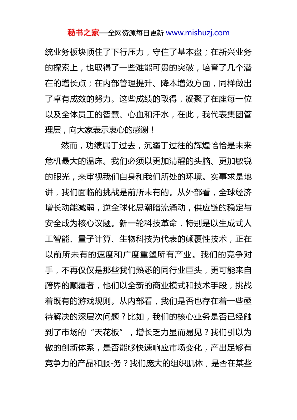 秘书之家—全网资源每日更新 www.mishuzj.com在 2025 年集团公司年度战略规划研讨会上的讲话 同志们,同事们:大家上午好!今天,我们齐聚一堂,召开集团公司 2025 年度战略规划研讨会。每年的这个时刻,都不仅仅是一次常规的会议,更是我们共同为集团这艘航船校准航向、规划航程的关键节点。我们在这里,不仅要回顾来路的风雨与彩虹,更要远眺前路的机遇与挑战,共同擘画我们未来发展的崭新蓝图。当前,我们正身处一个波澜壮阔又充满不确定性的时代,技术革命的浪潮奔涌不息,全球产业格局深度重构,市场竞争的范式正在发生根本性的转变。在这样的历史关口,我们的战略选择,将决定我们是勇立潮头,还是被时代洪流所淹没。因此,本次研讨会的意义非同寻常,它关乎未来三到五年,乃至更长时期内,我们集团的发展命运与事业根基。回望刚刚过去的几年,我们在风雨兼程中走过了一段极不平凡的历程。面对复杂严峻的宏观经济环境和日趋白热化的行业竞争,全体同仁迎难而上、砥砺前行,集团整体保持了“稳中有进、稳中提质”的发展态势。我们在传秘书之家—全网资源每日更新 www.mishuzj.com统业务板块顶住了下行压力,守住了基本盘;在新兴业务的探索上,也取得了一些难能可贵的突破,培育了几个潜在的增长点;在内部管理提升、降本增效方面,同样做出了卓有成效的努力。这些成绩的取得,凝聚了在座每一位以及全体员工的智慧、心血和汗水,在此,我代表集团管理层,向大家表示衷心的感谢!然而,功绩属于过去,沉溺于过往的辉煌恰恰是未来危机最大的温床。我们必须以更加清醒的头脑、更加敏锐的眼光,来审视我们自身和我们所处的环境。实事求是地讲,我们面临的挑战是前所未有的。从外部看,全球经济增长动能减弱,逆全球化思潮暗流涌动,供应链的稳定与安全成为核心议题。新一轮科技革命,特别是以生成式人工智能、量子计算、生物科技为代表的颠覆性技术,正在以前所未有的速度和广度重塑所有产业。我们的竞争对手,不再仅仅是那些我们熟悉的同行业巨头,更可能来自跨界的颠覆者,他们以全新的商业模式和技术手段,挑战着既有的游戏规则。从内部看,我们是否也存在着一些亟待解决的深层次问题?比如,我们的核心业务是否已经触到了市场的“天花板”,增长乏力显而易见?我们引以为傲的创新体系,是否能够快速响应市场变化,产出足够有竞争力的产品和服-务?我们庞大的组织肌体,是否在某些秘书之家—全网资源每日更新 www.mishuzj.com环节已经显现出“大企业病”的征兆,决策链条过长、部门墙林立、创新活力不足?我们的人才结构,是否与未来战略方向相匹配,能否支撑起我们向更高价值领域进军?这些问题,像一面面镜子,照出了我们的短板与不足,容不得我们有半点回避和侥幸。今天的战略研讨会,我们更要敢于直面这些尖锐的问题,把它们摆在桌面上,进行透彻的剖析。那么,面向充满不确定性的 2025 年及以后,我们的路究竟在何方?集团的未来,应该构建在怎样的战略基石之上?我认为,核心在于我们必须完成一次根本性的战略思维转变——从过去的“追赶者”、“跟随者”,坚决地向“引领者”、“定义者”转型。我们不能再满足于在已有的赛道里进行内卷式的竞争,而必须勇于开辟属于自己的新赛道,定义属于自己的新规则。这要求我们的战略,必须具备更强的前瞻性、更大的魄力和更坚定的执行力。具体而言,我们的战略重心应当聚焦于以下几个相互关联、相互促进的维度。首先,我们要以科技创新为引擎,重塑集团发展的核心驱动力。 未来的竞争,本质上是技术制高点的争夺。我们必须将研发创新提升到集团生存与发展的生命线高度。这意味着,我们不能仅仅在应用技术层面进行改良,更要秘书之家—全网资源每日更新 www.mishuzj.com敢于在基础研究和前沿技术领域进行长期主义的投入。要紧密跟踪并布局人工智能、大数据、工业互联网、绿色能源等与集团业务紧密相关的战略性新兴技术。要下决心改革现有的研发体制机制,打破论资排辈,赋予一线科研人员更大的自主权和人财物支配权。要积极探索建立“前沿技术探索实验室”、“跨界创新中心”等新型研发载体,鼓励高风险、高回报的探索...