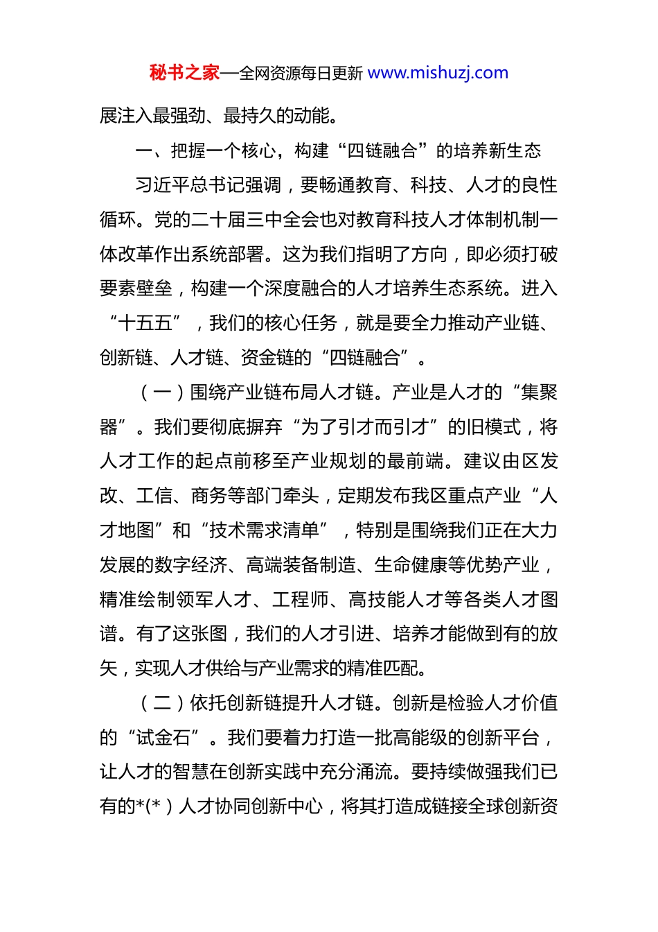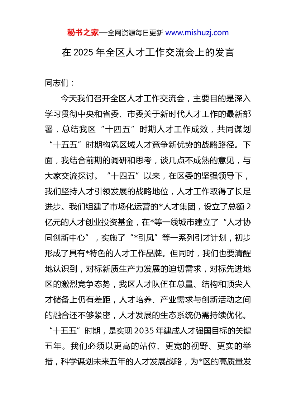 秘书之家—全网资源每日更新 www.mishuzj.com在 2025 年全区人才工作交流会上的发言 同志们:今天我们召开全区人才工作交流会,主要目的是深入学习贯彻中央和省委、市委关于新时代人才工作的最新部署,总结我区“十四五”时期人才工作成效,共同谋划“十五五”时期构筑区域人才竞争新优势的战略路径。下面,我结合前期的调研和思考,谈几点不成熟的意见,与大家交流探讨。“十四五”以来,在区委的坚强领导下,我们坚持人才引领发展的战略地位,人才工作取得了长足进步。我们组建了市场化运营的*人才集团,设立了总额 2亿元的人才创业投资基金,在*等一线城市建立了“人才协同创新中心”,实施了“*引凤”等一系列引才计划,初步形成了具有*特色的人才工作品牌。但同时,我们也要清醒地认识到,对标新质生产力发展的迫切需求,对标先进地区的激烈竞争态势,我区人才队伍在总量、结构和顶尖人才储备上仍有差距,人才培养、产业需求与创新活动之间的融合还不够紧密,人才发展的生态系统仍需持续优化。“十五五”时期,是实现 2035 年建成人才强国目标的关键五年。我们必须以更高的站位、更宽的视野、更实的举措,科学谋划未来五年的人才发展战略,为*区的高质量发秘书之家—全网资源每日更新 www.mishuzj.com展注入最强劲、最持久的动能。一、把握一个核心,构建“四链融合”的培养新生态习近平总书记强调,要畅通教育、科技、人才的良性循环。党的二十届三中全会也对教育科技人才体制机制一体改革作出系统部署。这为我们指明了方向,即必须打破要素壁垒,构建一个深度融合的人才培养生态系统。进入“十五五”,我们的核心任务,就是要全力推动产业链、创新链、人才链、资金链的“四链融合”。(一)围绕产业链布局人才链。产业是人才的“集聚器”。我们要彻底摒弃“为了引才而引才”的旧模式,将人才工作的起点前移至产业规划的最前端。建议由区发改、工信、商务等部门牵头,定期发布我区重点产业“人才地图”和“技术需求清单”,特别是围绕我们正在大力发展的数字经济、高端装备制造、生命健康等优势产业,精准绘制领军人才、工程师、高技能人才等各类人才图谱。有了这张图,我们的人才引进、培养才能做到有的放矢,实现人才供给与产业需求的精准匹配。(二)依托创新链提升人才链。创新是检验人才价值的“试金石”。我们要着力打造一批高能级的创新平台,让人才的智慧在创新实践中充分涌流。要持续做强我们已有的*(*)人才协同创新中心,将其打造成链接全球创新资秘书之家—全网资源每日更新 www.mishuzj.com源的“桥头堡”。同时,要鼓励区内龙头企业与*大学等国内外知名高校、科研院所共建重点实验室、企业技术中心和产教融合实训基地。对成功创建国家级、省级创新平台的,区财政应给予重奖。通过平台集聚,让人才在“家门口”就能接触到科研最前沿,参与到重大创新活动中。(三)激活资金链赋能人才链。资金是人才创新创业的“助推器”。我们要进一步发挥好*人才集团的市场化优势,用好 2 亿元的人才创业投资基金,探索“拨改投”“人才投”等新模式,为处于不同发展阶段的人才项目提供覆盖全周期的金融支持。要敢于为创新“试错”买单,建立尽职免责机制,鼓励创投机构投早、投小、投科技。我们的目标是,在*区形成一种“技术+资本”高效转化的良好生态,让有真才实学的创新创业者不为钱发愁。二、聚焦两类群体,锻造支撑区域发展的骨干力量人才是分层分类的,抓人才工作必须纲举目张,牵住“牛鼻子”。“十五五”期间,我们要重点聚焦“高精尖缺”人才和青年人才这两大群体,实施非对称式、精细化的引育策略。(一)实施顶尖人才“引航计划”。一个顶尖人才,足以引领一个产业、成就一个企业。我们要瞄准国内外行业领军人物、掌握关键核心技术的特殊人才及其团队,建秘书之家—全网资源每日更新 www.mishuzj.com立“一人一策”的引进机制。区委人才办要牵头成立引才专班,由区领导挂帅,主动出击,“三顾茅庐”式地拜访对接。对于顶尖人才,要在科研经费、团队配备、生活待遇上给予“上不封顶”的特殊支持。去年我区人民医院成功引进 29 名高层次专业人才,就...