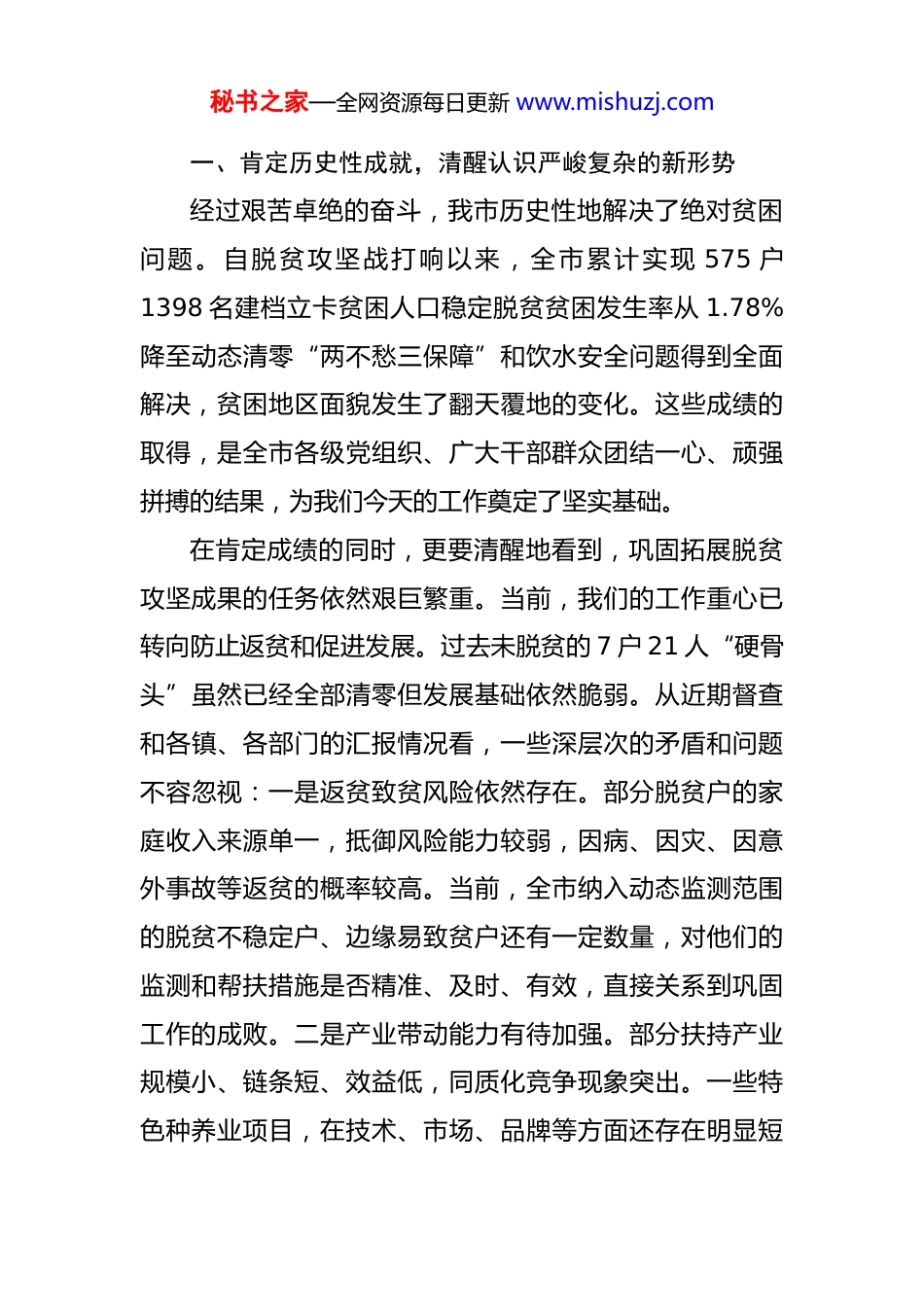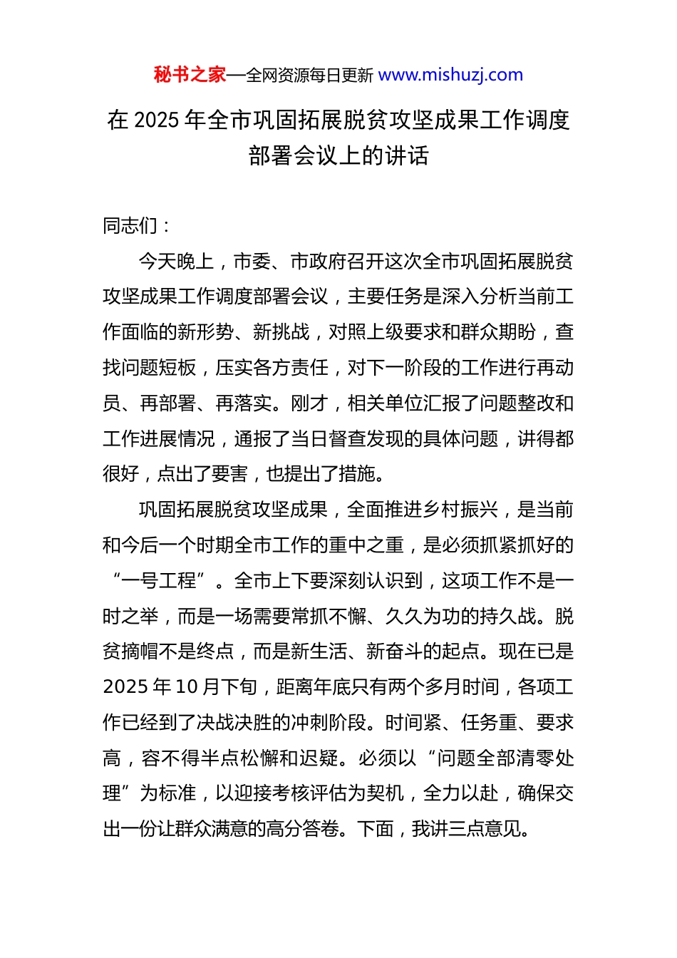 秘书之家—全网资源每日更新 www.mishuzj.com在 2025 年全市巩固拓展脱贫攻坚成果工作调度部署会议上的讲话 同志们:今天晚上,市委、市政府召开这次全市巩固拓展脱贫攻坚成果工作调度部署会议,主要任务是深入分析当前工作面临的新形势、新挑战,对照上级要求和群众期盼,查找问题短板,压实各方责任,对下一阶段的工作进行再动员、再部署、再落实。刚才,相关单位汇报了问题整改和工作进展情况,通报了当日督查发现的具体问题,讲得都很好,点出了要害,也提出了措施。巩固拓展脱贫攻坚成果,全面推进乡村振兴,是当前和今后一个时期全市工作的重中之重,是必须抓紧抓好的“一号工程”。全市上下要深刻认识到,这项工作不是一时之举,而是一场需要常抓不懈、久久为功的持久战。脱贫摘帽不是终点,而是新生活、新奋斗的起点。现在已是2025 年 10 月下旬,距离年底只有两个多月时间,各项工作已经到了决战决胜的冲刺阶段。时间紧、任务重、要求高,容不得半点松懈和迟疑。必须以“问题全部清零处理”为标准,以迎接考核评估为契机,全力以赴,确保交出一份让群众满意的高分答卷。下面,我讲三点意见。秘书之家—全网资源每日更新 www.mishuzj.com一、肯定历史性成就,清醒认识严峻复杂的新形势经过艰苦卓绝的奋斗,我市历史性地解决了绝对贫困问题。自脱贫攻坚战打响以来,全市累计实现 575 户1398 名建档立卡贫困人口稳定脱贫贫困发生率从 1.78%降至动态清零“两不愁三保障”和饮水安全问题得到全面解决,贫困地区面貌发生了翻天覆地的变化。这些成绩的取得,是全市各级党组织、广大干部群众团结一心、顽强拼搏的结果,为我们今天的工作奠定了坚实基础。在肯定成绩的同时,更要清醒地看到,巩固拓展脱贫攻坚成果的任务依然艰巨繁重。当前,我们的工作重心已转向防止返贫和促进发展。过去未脱贫的 7 户 21 人“硬骨头”虽然已经全部清零但发展基础依然脆弱。从近期督查和各镇、各部门的汇报情况看,一些深层次的矛盾和问题不容忽视:一是返贫致贫风险依然存在。部分脱贫户的家庭收入来源单一,抵御风险能力较弱,因病、因灾、因意外事故等返贫的概率较高。当前,全市纳入动态监测范围的脱贫不稳定户、边缘易致贫户还有一定数量,对他们的监测和帮扶措施是否精准、及时、有效,直接关系到巩固工作的成败。二是产业带动能力有待加强。部分扶持产业规模小、链条短、效益低,同质化竞争现象突出。一些特色种养业项目,在技术、市场、品牌等方面还存在明显短秘书之家—全网资源每日更新 www.mishuzj.com板,“旅游+特色经济”的融合深度不够龙头企业带动作用不强,与脱贫户的利益联结机制不够紧密,稳定增收的长效机制尚未完全形成。三是政策落实存在“温差”。一些惠民政策在传达和执行过程中存在衰减现象,个别干部存在松劲歇脚、麻痹厌战的思想,工作标准有所降低。比如,在人居环境整治、档案资料完善、项目资金管理等方面,还存在一些细节不实、不精、不细的问题。这些问题,看似小事,却直接影响工作成色和群众的获得感。四是内生动力激发不足。少数脱贫群众“等靠要”思想还未彻底根除,主动发展的意愿和能力不足。扶贫与扶志、扶智相结合的力度还需加大,如何有效激发群众依靠自己双手创造美好生活的主动性,是我们必须持续破解的课题。这些问题,既有客观因素,更有主观原因,反映出我们的工作还有差距。全市上下必须保持如履薄冰的谨慎、见叶知秋的敏锐,把困难估计得更充分一些,把应对措施准备得更周全一些,牢牢掌握工作主动权。二、聚焦核心关键任务,精准发力提升巩固拓展的质量成色打好巩固拓展脱贫攻坚成果这场硬仗,必须坚持问题导向、目标导向、结果导向,抓住关键环节,集中力量攻坚。下一步,要重点在以下三个方面下足功夫、务求实秘书之家—全网资源每日更新 www.mishuzj.com效。第一,织密织牢动态监测帮扶网,坚决守住不发生规模性返贫的底线。防止返贫是巩固脱贫攻坚成果的首要任务。必须把动态监测和精准帮扶作为一道“防火墙”,做到早发现、早干预、早帮扶。一要提升监测的精准度。要依托防止返贫监测和帮扶机制,综合运用农户自主申报、...