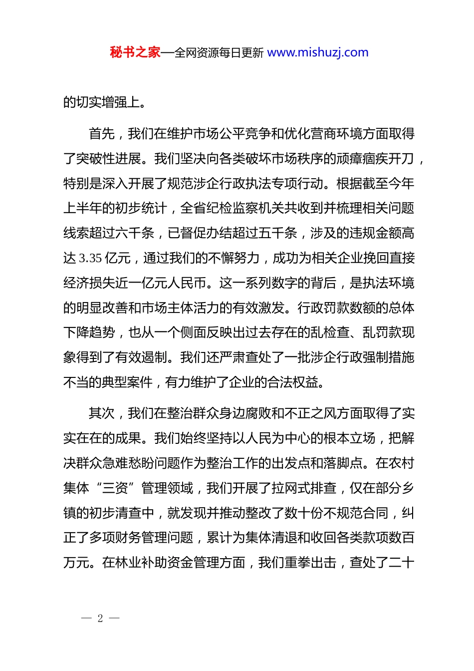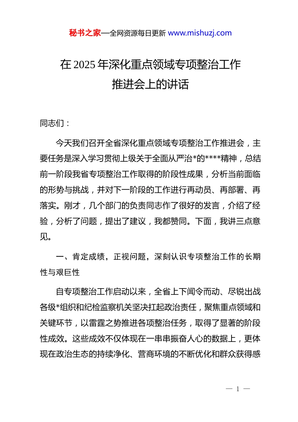 秘书之家—全网资源每日更新 www.mishuzj.com在 2025 年深化重点领域专项整治工作推进会上的讲话同志们:今天我们召开全省深化重点领域专项整治工作推进会,主要任务是深入学习贯彻上级关于全面从严治*的****精神,总结前一阶段我省专项整治工作取得的阶段性成果,分析当前面临的形势与挑战,并对下一阶段的工作进行再动员、再部署、再落实。刚才,几个部门的负责同志作了很好的发言,介绍了经验,分析了问题,提出了建议,我都赞同。下面,我讲三点意见。一、肯定成绩,正视问题,深刻认识专项整治工作的长期性与艰巨性自专项整治工作启动以来,全省上下闻令而动、尽锐出战各级*组织和纪检监察机关坚决扛起政治责任,聚焦重点领域和关键环节,以雷霆之势推进各项整治任务,取得了显著的阶段性成效。这些成效不仅体现在一串串振奋人心的数据上,更体现在政治生态的持续净化、营商环境的不断优化和群众获得感— 1 —秘书之家—全网资源每日更新 www.mishuzj.com的切实增强上。首先,我们在维护市场公平竞争和优化营商环境方面取得了突破性进展。我们坚决向各类破坏市场秩序的顽瘴痼疾开刀,特别是深入开展了规范涉企行政执法专项行动。根据截至今年上半年的初步统计,全省纪检监察机关共收到并梳理相关问题线索超过六千条,已督促办结超过五千条,涉及的违规金额高达 3.35 亿元,通过我们的不懈努力,成功为相关企业挽回直接经济损失近一亿元人民币。这一系列数字的背后,是执法环境的明显改善和市场主体活力的有效激发。行政罚款数额的总体下降趋势,也从一个侧面反映出过去存在的乱检查、乱罚款现象得到了有效遏制。我们还严肃查处了一批涉企行政强制措施不当的典型案件,有力维护了企业的合法权益。其次,我们在整治群众身边腐败和不正之风方面取得了实实在在的成果。我们始终坚持以人民为中心的根本立场,把解决群众急难愁盼问题作为整治工作的出发点和落脚点。在农村集体“三资”管理领域,我们开展了拉网式排查,仅在部分乡镇的初步清查中,就发现并推动整改了数十份不规范合同,纠正了多项财务管理问题,累计为集体清退和收回各类款项数百万元。在林业补助资金管理方面,我们重拳出击,查处了二十— 2 —秘书之家—全网资源每日更新 www.mishuzj.com余起案件,涉案人员均受到严肃处理,为国家挽回经济损失超过四百万元,直接惠及了数千户林区群众。在医保基金监管领域,我们持续保持高压态势,通过专项检查和数据筛查,严肃查处了一批欺诈骗保的典型案件,守护好了人民群众的“看病钱”和“救命钱”。同时,我们还针对社会高度关注的养老诈骗问题开展了专项打击,依法惩处了一批犯罪分子,最大限度追赃挽损,维护了老年群体的合法权益。再次,我们在提升社会治理能力和城市管理水平方面展现了新的作为。我们积极回应社会关切,针对城市管理中的难点痛点问题,开展了一系列集中整治行动。从建筑垃圾的规范化处理,到市容环境的综合整治;从道路运输行业的安全隐患排查,到老年代步车的专项治理;从餐饮油烟的达标排放监管,到对“黑民宿”等非法经营场所的清理取缔,我们坚持多措并举、严格执法,推动城市面貌和人居环境持续改善。通过公布物业领域、旅游市场、网络环境等方面的典型案例我们有效发挥了警示教育和正面引导作用,推动形成了齐抓共管的良好社会氛围。在肯定成绩的同时,我们必须清醒地认识到,当前我省*风廉政建设和反腐败斗争形势依然严峻复杂,在专项整治工作中— 3 —秘书之家—全网资源每日更新 www.mishuzj.com还存在一些不容忽视的问题。一些地方和单位仍然存在思想认识不到位、责任落实有偏差、工作力度层层递减的现象;一些深层次、行业性、领域性的问题尚未得到根本解决,隐形变异的“四风”问题依然禁而未绝;部分干部在整治工作中存在畏难情绪和“过关”心态,不敢动真碰硬,导致一些问题整改不彻底、易反弹;制度建设和长效机制的建立还相对滞后,“当下改”与“长久立”的衔接还不够紧密。这些问题警示我们,专项整治工作绝非一朝一夕之功,而是一场需要常抓不懈、久久为功的攻坚战和持久战。我们必须保持战略定力,发扬斗争精神,以...