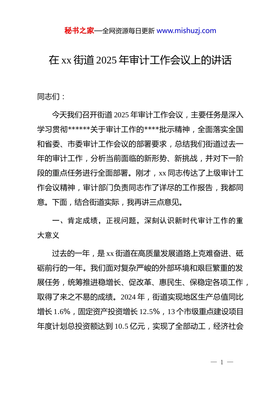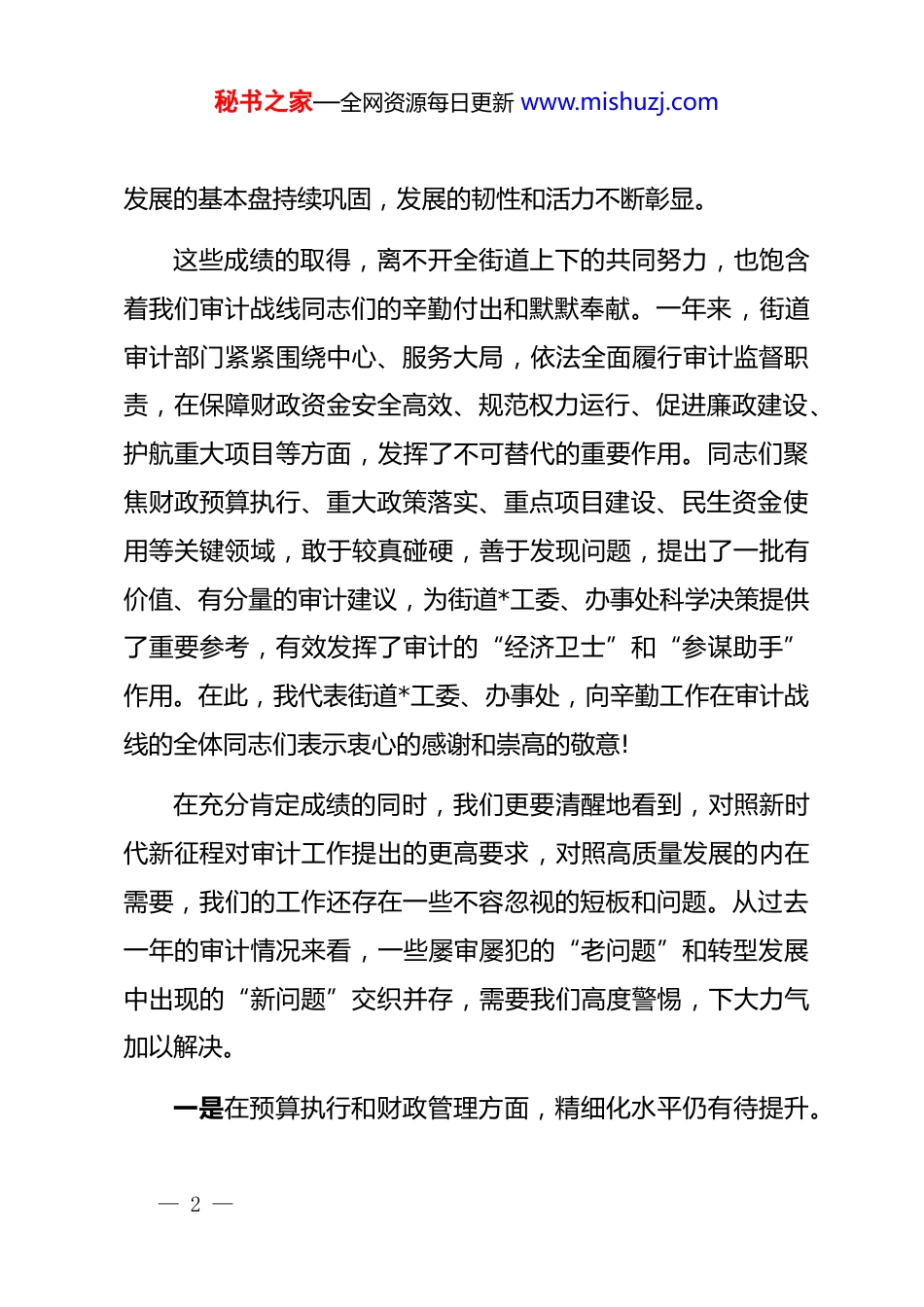 秘书之家—全网资源每日更新 www.mishuzj.com在 xx 街道 2025 年审计工作会议上的讲话同志们:今天我们召开街道 2025 年审计工作会议,主要任务是深入学习贯彻******关于审计工作的****批示精神,全面落实全国和省委、市委审计工作会议的部署要求,总结我们街道过去一年的审计工作,分析当前面临的新形势、新挑战,并对下一阶段的重点任务进行全面部署。刚才,xx 同志传达了上级审计工作会议精神,审计部门负责同志作了详尽的工作报告,我都同意。下面,结合街道实际,我再讲三点意见。一、肯定成绩,正视问题,深刻认识新时代审计工作的重大意义过去的一年,是 xx 街道在高质量发展道路上克难奋进、砥砺前行的一年。我们面对复杂严峻的外部环境和艰巨繁重的发展任务,统筹推进稳增长、促改革、惠民生、保稳定各项工作,取得了来之不易的成绩。2024 年,街道实现地区生产总值同比增长 1.6%,固定资产投资增长 12.5%,13 个市级重点建设项目年度计划总投资额达到 10.5 亿元,实现了全部动工,经济社会— 1 —秘书之家—全网资源每日更新 www.mishuzj.com发展的基本盘持续巩固,发展的韧性和活力不断彰显。这些成绩的取得,离不开全街道上下的共同努力,也饱含着我们审计战线同志们的辛勤付出和默默奉献。一年来,街道审计部门紧紧围绕中心、服务大局,依法全面履行审计监督职责,在保障财政资金安全高效、规范权力运行、促进廉政建设、护航重大项目等方面,发挥了不可替代的重要作用。同志们聚焦财政预算执行、重大政策落实、重点项目建设、民生资金使用等关键领域,敢于较真碰硬,善于发现问题,提出了一批有价值、有分量的审计建议,为街道*工委、办事处科学决策提供了重要参考,有效发挥了审计的“经济卫士”和“参谋助手”作用。在此,我代表街道*工委、办事处,向辛勤工作在审计战线的全体同志们表示衷心的感谢和崇高的敬意!在充分肯定成绩的同时,我们更要清醒地看到,对照新时代新征程对审计工作提出的更高要求,对照高质量发展的内在需要,我们的工作还存在一些不容忽视的短板和问题。从过去一年的审计情况来看,一些屡审屡犯的“老问题”和转型发展中出现的“新问题”交织并存,需要我们高度警惕,下大力气加以解决。一是在预算执行和财政管理方面,精细化水平仍有待提升。— 2 —秘书之家—全网资源每日更新 www.mishuzj.com审计发现,个别部门预算编制的前瞻性和科学性不足,导致预算执行率偏低,资金沉淀现象依然存在。一些专项资金的拨付和使用进度缓慢,例如某民生实事项目的配套资金,在年中审计时支付进度不足 40%,直接影响了工程的顺利推进和民生福祉的按时兑现。二是在重大项目和政府采购方面,程序规范性仍需加强。随着我们街道重点项目投资规模的持续扩大,审计监督的责任也愈发重大。审计过程中发现,个别工程项目在招投标环节存在拆分标段、规避公开招标的现象;一些政府采购项目对供应商的履约能力把关不严,合同关键条款约定不明,为后续的执行和监管埋下了风险隐患。三是在内部控制和财经纪律方面,制度的“笼子”仍需扎紧。尽管我们三令五申,但固定资产管理不规范、账实不符的问题在一些单位和社区仍有发生。部分经费开支的合规性、合理性审核不严,存在超标准、超范围支出的情况。这些问题虽然发生在局部,但反映出一些单位的内部管理制度还存在漏洞,财经纪律的红线意识树得还不够牢固。同志们,审计发现的每一个问题,背后都可能关联着资金的损失、效益的降低,甚至权力的滥用。我们必须深刻认识到,— 3 —秘书之家—全网资源每日更新 www.mishuzj.com审计是*和国家监督体系的重要组成部分,是推动国家治理体系和治理能力现代化的重要力量。******深刻指出,要“发挥审计在反腐治乱方面的重要作用”。对于我们基层街道而言,审计工作就是一面镜子,能照出我们工作中的瑕疵和不足;审计工作更是一把利剑,能斩断损害群众利益、影响发展大局的“黑手”。全街道各部门、各单位必须从政治和全局的高度,深刻理解审计工作的极端重要性,自觉地把接受审计监督作为一种政治责任、一种工作常态,切实增强做好新时代审计工作的责...