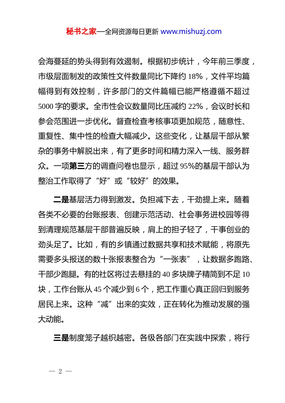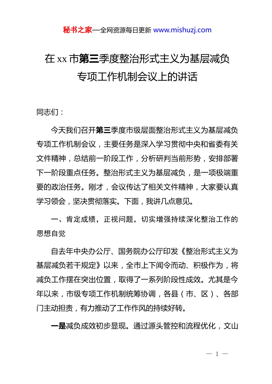 秘书之家—全网资源每日更新 www.mishuzj.com在 xx 市第三季度整治形式主义为基层减负专项工作机制会议上的讲话同志们:今天我们召开第三季度市级层面整治形式主义为基层减负专项工作机制会议,主要任务是深入学习贯彻中央和省委有关文件精神,总结前一阶段工作,分析研判当前形势,安排部署下一阶段重点任务。整治形式主义为基层减负,是一项极端重要的政治任务。刚才,会议传达了相关文件精神,大家要认真学习领会,坚决贯彻落实。下面,我讲几点意见。一、肯定成绩,正视问题,切实增强持续深化整治工作的思想自觉自去年中央办公厅、国务院办公厅印发《整治形式主义为基层减负若干规定》以来,全市上下闻令而动、积极作为,将减负工作摆在突出位置,取得了一系列阶段性成效。尤其是今年以来,市级专项工作机制统筹协调,各县(市、区)、各部门主动担责,有力推动了工作作风的持续好转。一是减负成效初步显现。通过源头管控和流程优化,文山— 1 —秘书之家—全网资源每日更新 www.mishuzj.com会海蔓延的势头得到有效遏制。根据初步统计,今年前三季度,市级层面制发的政策性文件数量同比下降约 18%,文件平均篇幅得到有效控制,许多部门的文件篇幅已能严格遵循不超过5000 字的要求。全市性会议数量同比压减约 22%,会议时长和参会范围进一步优化。督查检查考核事项更加规范,随意性、重复性、集中性的检查大幅减少。这些变化,让基层干部从繁杂的事务中解脱出来,有了更多时间和精力深入一线、服务群众。一项第三方的调查问卷也显示,超过 95%的基层干部认为整治工作取得了“好”或“较好”的效果。二是基层活力得到激发。负担减下去,干劲提上来。随着各类不必要的台账报表、创建示范活动、社会事务进校园等得到清理规范基层干部普遍反映,肩上的担子轻了,干事创业的劲头足了。比如,有的乡镇通过数据共享和技术赋能,将原先需要多头报送的数十张报表整合为“一张表”,让数据多跑路、干部少跑腿。有的社区将过去悬挂的 40 多块牌子精简到不足 10块,工作台账从 45 个减少到 6 个,把工作重心真正回归到服务居民上来。这种“减”出来的实效,正在转化为推动发展的强大动能。三是制度笼子越织越密。各级各部门在实践中探索,将行— 2 —秘书之家—全网资源每日更新 www.mishuzj.com之有效的经验做法及时固化为制度规范。市级层面已经出台了关于进一步规范会议审批、严控文件制发、统筹督查检查考核等一系列配套制度。各县(市、区)也结合实际,制定了本地的减负工作安排,初步形成了上下联动、协同发力的制度体系,为常态长效推进减负工作打下了坚实基础。在肯定成绩的同时,必须清醒地认识到,形式主义具有顽固性、反复性,稍有松懈就可能反弹回潮,甚至出现新的变种。当前,一些深层次问题仍未根除,一些新情况新问题值得高度警惕。一是“指尖上的形式主义”问题突出。部分单位开发的政务 app 和小程序实用性不强,却强制要求基层干部下载、注册、打卡、积分、排名,把抓落实变成了“秀”落实。各类工作群、通知群、打卡群层出不穷,看似沟通便捷,实则耗费了基层干部大量精力,造成了新的负担。二是“甩锅式”减负现象抬头。有的部门在落实减负要求时,只在数量上做文章,把自己部门的发文、开会指标压下来了,却通过“红头”换“白头”、正式会议改现场指导等方式,把责任和任务原封不动甚至加码转嫁给下级,导致基层实际负担“明减实增”。— 3 —秘书之家—全网资源每日更新 www.mishuzj.com三是“盆景式”调研依然存在。一些干部下基层调研,满足于“坐着车子转、隔着玻璃看”,满足于听取事先安排好的汇报、参观精心打造的“示范点”,对基层真实情况了解不深不透,对群众急难愁盼问题掌握不准不实。这种蜻蜓点水式的调研,不仅解决不了实际问题,还增加了基层接待负担。四是“材料政绩”屡禁不绝。有的单位评价工作,不看实绩看材料,热衷于让基层报送各种总结、报告、事迹、图片、视频,导致基层干部不得不把大量时间花在“抠字眼”“美图片”“做 ppt”上,陷入了“以材料论英雄”的怪圈。去年全市纠治了 49 个“政绩工程”“形象工...