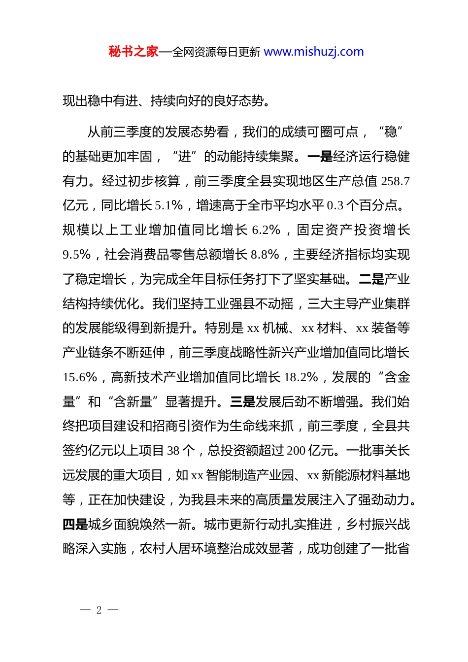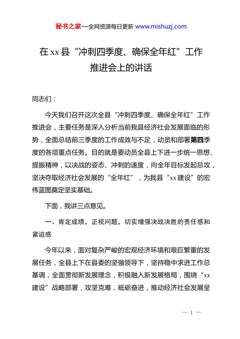 秘书之家—全网资源每日更新 www.mishuzj.com在 xx 县“冲刺四季度、确保全年红”工作推进会上的讲话同志们:今天我们召开这次全县“冲刺四季度、确保全年红”工作推进会,主要任务是深入分析当前我县经济社会发展面临的形势,全面总结前三季度的工作成效与不足,动员和部署第四季度的各项重点任务。目的就是要动员全县上下进一步统一思想、提振精神,以决战的姿态、冲刺的速度,向全年目标发起总攻,坚决夺取经济社会发展的“全年红”,为我县“xx 建设”的宏伟蓝图奠定坚实基础。下面,我讲三点意见。一、肯定成绩,正视问题,切实增强决战决胜的责任感和紧迫感今年以来,面对复杂严峻的宏观经济环境和艰巨繁重的发展任务,全县上下在县委的坚强领导下,坚持稳中求进工作总基调,全面贯彻新发展理念,积极融入新发展格局,围绕“xx建设”战略部署,攻坚克难,砥砺奋进,推动经济社会发展呈— 1 —秘书之家—全网资源每日更新 www.mishuzj.com现出稳中有进、持续向好的良好态势。从前三季度的发展态势看,我们的成绩可圈可点,“稳”的基础更加牢固,“进”的动能持续集聚。一是经济运行稳健有力。经过初步核算,前三季度全县实现地区生产总值 258.7亿元,同比增长 5.1%,增速高于全市平均水平 0.3 个百分点。规模以上工业增加值同比增长 6.2%,固定资产投资增长9.5%,社会消费品零售总额增长 8.8%,主要经济指标均实现了稳定增长,为完成全年目标任务打下了坚实基础。二是产业结构持续优化。我们坚持工业强县不动摇,三大主导产业集群的发展能级得到新提升。特别是 xx 机械、xx 材料、xx 装备等产业链条不断延伸,前三季度战略性新兴产业增加值同比增长15.6%,高新技术产业增加值同比增长 18.2%,发展的“含金量”和“含新量”显著提升。三是发展后劲不断增强。我们始终把项目建设和招商引资作为生命线来抓,前三季度,全县共签约亿元以上项目 38 个,总投资额超过 200 亿元。一批事关长远发展的重大项目,如 xx 智能制造产业园、xx 新能源材料基地等,正在加快建设,为我县未来的高质量发展注入了强劲动力。四是城乡面貌焕然一新。城市更新行动扎实推进,乡村振兴战略深入实施,农村人居环境整治成效显著,成功创建了一批省— 2 —秘书之家—全网资源每日更新 www.mishuzj.com级美丽乡村示范村。五是民生福祉持续改善。我们坚持把 75%以上的财政支出用于民生领域,教育、医疗、社保等公共服务体系不断完善,前三季度城镇新增就业 6800 人,城乡居民人均可支配收入增速跑赢了经济增速,人民群众的获得感、幸福感、安全感更加充实。这些成绩的取得,是全县各级*组织和广大干部群众团结拼搏、共同努力的结果。在此,我代表县委,向奋战在各条战线上的同志们,表示衷心的感谢!在肯定成绩的同时,我们更要清醒地认识到,前进的道路上依然存在诸多困难和挑战。对标全年目标任务,对标高质量发展的要求,对标先进地区的先进经验,我们的工作中还存在不少短板和弱项。根据刚才会议通报的情况和我们日常的调研掌握,当前至少面临着六个方面的突出问题:第一,宏观经济下行的压力传导效应依然明显。从外部看,全球经济复苏乏力,国内需求收缩、供给冲击、预期转弱的三重压力尚未根本缓解。传导到我县,就表现为部分企业订单减少、利润下滑,市场主体信心有待进一步提振。第二,产业结构不优的深层次矛盾依然突出。我县的产业体系中,传统产业占比仍然偏高,新兴产业规模偏小,产业链条不够长、不够强,缺少具有核心竞争力和强大带动力的“链主”型企业,产业转— 3 —秘书之家—全网资源每日更新 www.mishuzj.com型的阵痛期还没有完全过去。第三,投资增长的后劲依然不足。虽然我们引进了一批项目,但储备库中能够支撑长远发展的大项目、好项目还不够多。同时,民间投资的活力有待进一步激发,部分已签约项目落地转化慢、建设进度不及预期的问题仍然存在。第四,要素制约的瓶颈依然趋紧。随着发展的深入,土地、能耗、环境容量等硬性约束越来越紧,项目落地难、用地难的问题日益凸显,如何在“存量”中求“增量”,在“约束”中求“发展”,是我们必须...