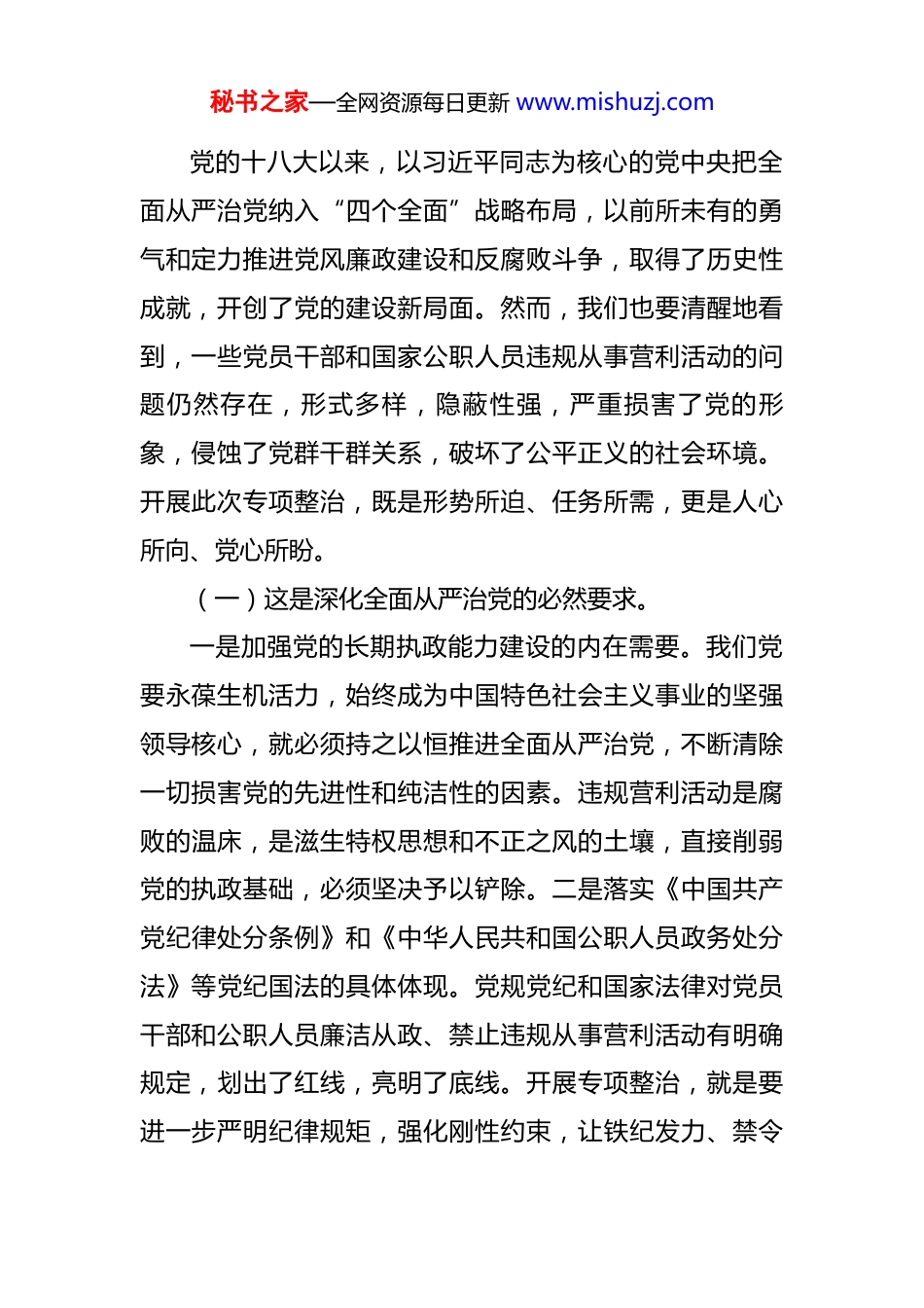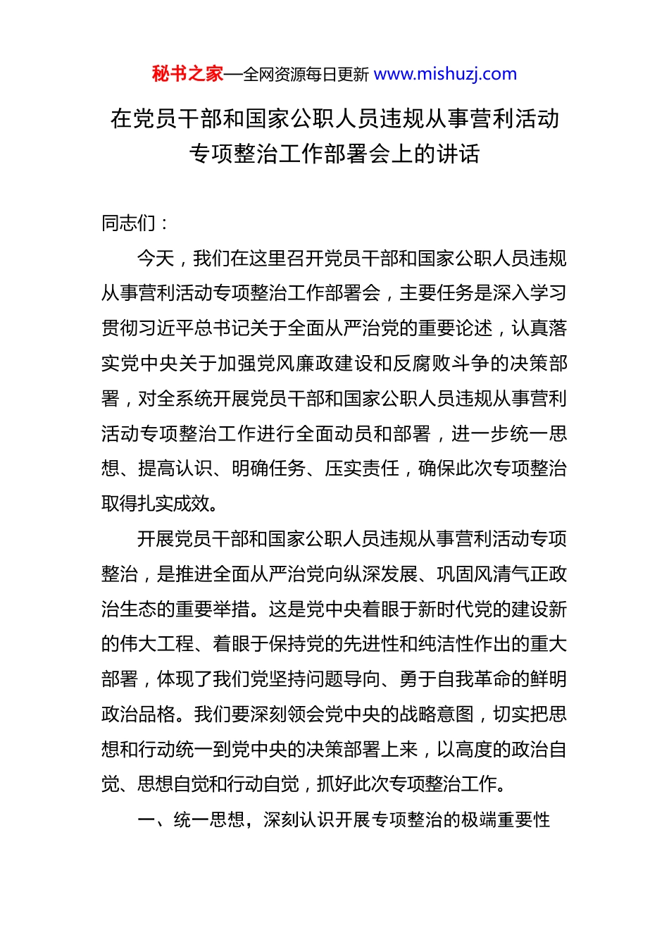 秘书之家—全网资源每日更新 www.mishuzj.com在党员干部和国家公职人员违规从事营利活动专项整治工作部署会上的讲话 同志们:今天,我们在这里召开党员干部和国家公职人员违规从事营利活动专项整治工作部署会,主要任务是深入学习贯彻习近平总书记关于全面从严治党的重要论述,认真落实党中央关于加强党风廉政建设和反腐败斗争的决策部署,对全系统开展党员干部和国家公职人员违规从事营利活动专项整治工作进行全面动员和部署,进一步统一思想、提高认识、明确任务、压实责任,确保此次专项整治取得扎实成效。开展党员干部和国家公职人员违规从事营利活动专项整治,是推进全面从严治党向纵深发展、巩固风清气正政治生态的重要举措。这是党中央着眼于新时代党的建设新的伟大工程、着眼于保持党的先进性和纯洁性作出的重大部署,体现了我们党坚持问题导向、勇于自我革命的鲜明政治品格。我们要深刻领会党中央的战略意图,切实把思想和行动统一到党中央的决策部署上来,以高度的政治自觉、思想自觉和行动自觉,抓好此次专项整治工作。一、统一思想,深刻认识开展专项整治的极端重要性秘书之家—全网资源每日更新 www.mishuzj.com党的十八大以来,以习近平同志为核心的党中央把全面从严治党纳入“四个全面”战略布局,以前所未有的勇气和定力推进党风廉政建设和反腐败斗争,取得了历史性成就,开创了党的建设新局面。然而,我们也要清醒地看到,一些党员干部和国家公职人员违规从事营利活动的问题仍然存在,形式多样,隐蔽性强,严重损害了党的形象,侵蚀了党群干群关系,破坏了公平正义的社会环境。开展此次专项整治,既是形势所迫、任务所需,更是人心所向、党心所盼。(一)这是深化全面从严治党的必然要求。一是加强党的长期执政能力建设的内在需要。我们党要永葆生机活力,始终成为中国特色社会主义事业的坚强领导核心,就必须持之以恒推进全面从严治党,不断清除一切损害党的先进性和纯洁性的因素。违规营利活动是腐败的温床,是滋生特权思想和不正之风的土壤,直接削弱党的执政基础,必须坚决予以铲除。二是落实《中国共产党纪律处分条例》和《中华人民共和国公职人员政务处分法》等党纪国法的具体体现。党规党纪和国家法律对党员干部和公职人员廉洁从政、禁止违规从事营利活动有明确规定,划出了红线,亮明了底线。开展专项整治,就是要进一步严明纪律规矩,强化刚性约束,让铁纪发力、禁令秘书之家—全网资源每日更新 www.mishuzj.com生威,确保各项规定落地生根。三是巩固拓展作风建设成果的重要举措。党的作风是党的形象,关系人心向背。违规营利活动往往与不正之风交织,与特权思想作祟,与权力寻租勾连,是“四风”问题的变种和延伸。通过专项整治,能够有效遏制不正之风,进一步涵养新风正气,使党风政风持续向上向好。(二)这是净化政治生态、维护党群干群关系的迫切需要。一是营造良好政治生态的坚实保障。风清气正的政治生态是党的事业健康发展的生命线。党员干部和国家公职人员违规从事营利活动,不仅会败坏社会风气,更会污染地方和部门的政治生态,导致拉帮结派、权钱交易、利益输送等问题滋生蔓延。只有彻底清除这些“毒瘤”,才能正本清源,为干事创业营造海晏河清的政治环境。二是维护社会公平正义的重要体现。公职人员的权力是人民赋予的,只能用来为人民服务,绝不能成为谋取私利的工具。违规营利活动直接损害了市场公平竞争,破坏了营商环境,更让人民群众对党和政府的公信力产生怀疑。此次整治,就是要坚决纠正权力滥用、以权谋私的行为,让人民群众切实感受到公平正义就在身边。三是密切党群干群关系的必然要求。水能载舟亦能覆舟。党员干部和公职人员秘书之家—全网资源每日更新 www.mishuzj.com的言行举止,直接影响党在人民群众心中的形象。违规营利活动背离了党的宗旨,损害了人民群众的根本利益,必然会导致党群干群关系疏远。通过专项整治,坚决纠正损害群众利益的行为,才能赢得人民群众的信任和拥护,巩固党的执政根基。(三)这是对党员干部和公职人员的教育警醒和关心爱护。一是划清公与私的界限。作为党员干部和公职人员,肩负着为人民服...