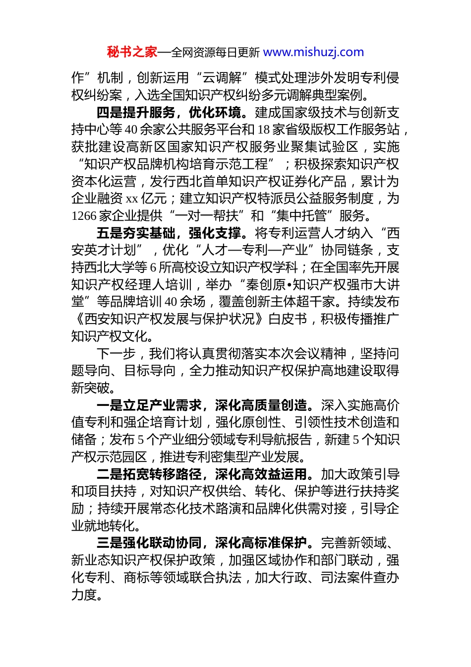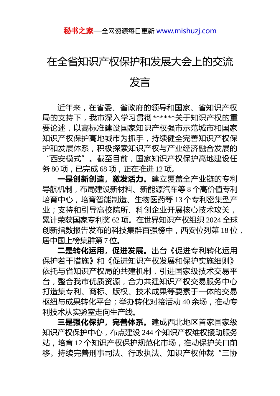 秘书之家—全网资源每日更新 www.mishuzj.com在全省知识产权保护和发展大会上的交流发言近年来,在省委、省政府的领导和国家、省知识产权局的支持下,我市深入学习贯彻******关于知识产权的重要论述,以高标准建设国家知识产权强市示范城市和国家知识产权保护高地城市为抓手,持续健全完善知识产权保护和发展体系,积极探索知识产权与产业经济融合发展的“西安模式”。截至目前,国家知识产权保护高地建设任务 80 项,已完成 68 项,正在推进 12 项。一是创新创造,激发活力。建立覆盖全产业链的专利导航机制,布局建设新材料、新能源汽车等 8 个高价值专利培育中心,培育智能制造、生物医药等 13 个专利密集型产业;支持和引导高校院所、科创企业开展核心技术攻关,累计荣获国家专利奖 62 项。在世界知识产权组织 2024 全球创新指数报告发布的科技集群百强榜中,西安位列第 18 位,居中国上榜集群第 7 位。二是转化运用,促进发展。出台《促进专利转化运用保护若干措施》和《促进知识产权发展和保护实施细则》依托与省知识产权局的共建机制,引进国家级技术交易平台,整合我市优质资源,合力共建知识产权交易服务中心打造集专利、商标、版权、技术成果等要素于一体的交易枢纽与成果转化平台;举办转化对接活动 40 余场,推动专利技术从实验室走向生产线。三是强化保护,完善体系。建成西北地区首家国家级知识产权保护中心,布点建设 244 个知识产权维权援助服务站,培育 12 个知识产权保护规范化市场,推动保护关口前移。持续完善刑事司法、行政执法、知识产权仲裁“三协秘书之家—全网资源每日更新 www.mishuzj.com作”机制,创新运用“云调解”模式处理涉外发明专利侵权纠纷案,入选全国知识产权纠纷多元调解典型案例。四是提升服务,优化环境。建成国家级技术与创新支持中心等 40 余家公共服务平台和 18 家省级版权工作服务站,获批建设高新区国家知识产权服务业聚集试验区,实施“知识产权品牌机构培育示范工程”;积极探索知识产权资本化运营,发行西北首单知识产权证券化产品,累计为企业融资 xx 亿元;建立知识产权特派员公益服务制度,为1266 家企业提供“一对一帮扶”和“集中托管”服务。五是夯实基础,强化支撑。将专利运营人才纳入“西安英才计划”,优化“人才—专利—产业”协同链条,支持西北大学等 6 所高校设立知识产权学科;在全国率先开展知识产权经理人培训,举办“秦创原•知识产权强市大讲堂”等品牌培训 40 余场,覆盖创新主体超千家。持续发布《西安知识产权发展与保护状况》白皮书,积极传播推广知识产权文化。下一步,我们将认真贯彻落实本次会议精神,坚持问题导向、目标导向,全力推动知识产权保护高地建设取得新突破。一是立足产业需求,深化高质量创造。深入实施高价值专利和强企培育计划,强化原创性、引领性技术创造和储备;发布 5 个产业细分领域专利导航报告,新建 5 个知识产权示范园区,推进专利密集型产业发展。二是拓宽转移路径,深化高效益运用。加大政策引导和项目扶持,对知识产权供给、转化、保护等进行扶持奖励;持续开展常态化技术路演和品牌化供需对接,引导企业就地转化。三是强化联动协同,深化高标准保护。完善新领域、新业态知识产权保护政策,加强区域协作和部门联动,强化专利、商标等领域联合执法,加大行政、司法案件查办力度。秘书之家—全网资源每日更新 www.mishuzj.com四是营造最优生态,深化高品质服务。加快建设西安知识产权交易服务中心,开展“千企百城”商标品牌价值提升行动,打造知识产权标志性工程,推动知识产权服务和产品“遍地开花”。