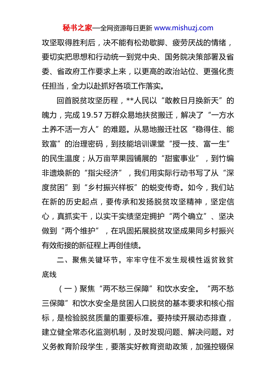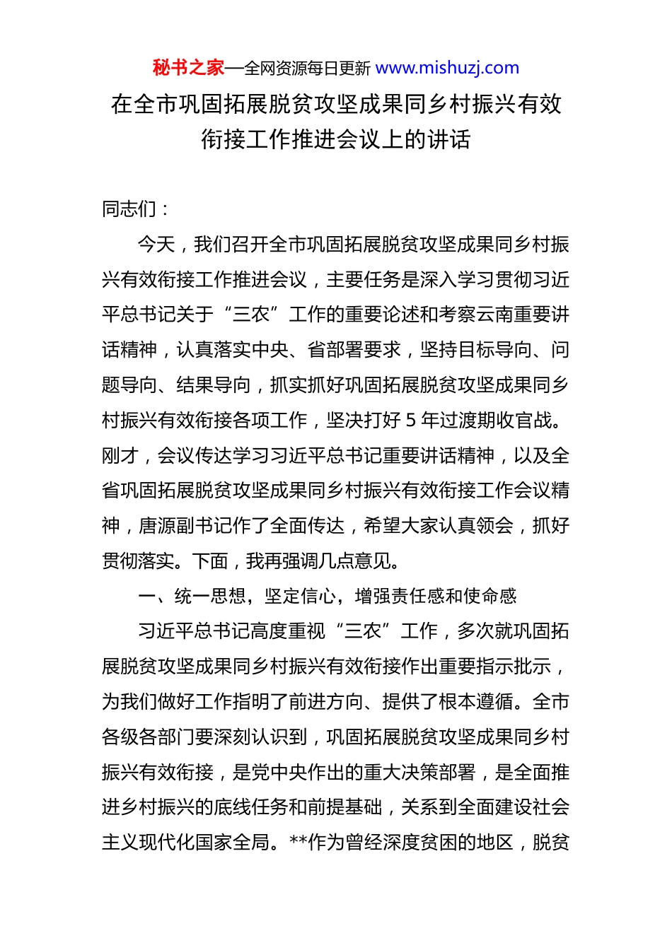 秘书之家—全网资源每日更新 www.mishuzj.com在全市巩固拓展脱贫攻坚成果同乡村振兴有效衔接工作推进会议上的讲话 同志们:今天,我们召开全市巩固拓展脱贫攻坚成果同乡村振兴有效衔接工作推进会议,主要任务是深入学习贯彻习近平总书记关于“三农”工作的重要论述和考察云南重要讲话精神,认真落实中央、省部署要求,坚持目标导向、问题导向、结果导向,抓实抓好巩固拓展脱贫攻坚成果同乡村振兴有效衔接各项工作,坚决打好 5 年过渡期收官战。刚才,会议传达学习习近平总书记重要讲话精神,以及全省巩固拓展脱贫攻坚成果同乡村振兴有效衔接工作会议精神,唐源副书记作了全面传达,希望大家认真领会,抓好贯彻落实。下面,我再强调几点意见。一、统一思想,坚定信心,增强责任感和使命感习近平总书记高度重视“三农”工作,多次就巩固拓展脱贫攻坚成果同乡村振兴有效衔接作出重要指示批示,为我们做好工作指明了前进方向、提供了根本遵循。全市各级各部门要深刻认识到,巩固拓展脱贫攻坚成果同乡村振兴有效衔接,是党中央作出的重大决策部署,是全面推进乡村振兴的底线任务和前提基础,关系到全面建设社会主义现代化国家全局。**作为曾经深度贫困的地区,脱贫秘书之家—全网资源每日更新 www.mishuzj.com攻坚取得胜利后,决不能有松劲歇脚、疲劳厌战的情绪,要切实把思想和行动统一到党中央、国务院决策部署及省委、省政府工作要求上来,以更高的政治站位、更强化责任担当,全力以赴抓好各项工作落实。回首脱贫攻坚历程,**人民以“敢教日月换新天”的魄力,完成 19.57 万群众易地扶贫搬迁,解决了“一方水土养不活一方人”的难题。从易地搬迁社区“稳得住、能致富”的治理密码,到技能培训课堂“授一技、富一生”的民生温度;从万亩苹果园铺展的“甜蜜事业”,到竹编非遗焕新的“指尖经济”,我们用实际行动书写了从“深度贫困”到“乡村振兴样板”的蜕变传奇。如今,我们站在新的历史起点,要传承和发扬脱贫攻坚精神,坚定信心,真抓实干,以实干实绩坚定拥护“两个确立”、坚决做到“两个维护”,在巩固拓展脱贫攻坚成果同乡村振兴有效衔接的新征程上再创佳绩。二、聚焦关键环节,牢牢守住不发生规模性返贫致贫底线(一)聚焦“两不愁三保障”和饮水安全。“两不愁三保障”和饮水安全是贫困人口脱贫的基本要求和核心指标,是检验脱贫质量的重要标准。要持续开展动态排查,建立健全常态化监测机制,及时发现问题、解决问题。对义务教育阶段学生,要落实好教育资助政策,加强控辍保秘书之家—全网资源每日更新 www.mishuzj.com学工作,确保每一个孩子都能接受良好的教育;对基本医疗保障,要强化医保政策宣传,提高群众参保率,确保贫困人口看得起病;对住房安全保障,要加强农村危房改造动态监测,及时消除住房安全隐患;对饮水安全保障,要加强水源保护和供水设施维护管理,确保群众喝上安全水、放心水。(二)聚焦风险防范化解。要建立健全防返贫动态监测和帮扶机制,织密监测网络,做到早发现、早干预、早帮扶。加强对脱贫不稳定户、边缘易致贫户,以及因病因灾因意外事故等刚性支出较大或收入大幅缩减导致基本生活出现严重困难户的监测,将符合条件的及时纳入监测范围,精准分析返贫致贫风险,采取针对性帮扶措施。充分运用大数据平台,整合医保、教育、民政等部门数据,实现信息共享,提高监测效率和精准度。(三)聚焦各类问题整改清零。问题整改是提升工作质量的重要抓手。要对各级各类检查考核、评估督导发现的问题,进行全面梳理,建立问题清单,明确整改责任、整改措施和整改时限,实行台账管理,确保问题整改清零。坚持举一反三,深入分析问题产生的根源,健全完善长效机制,防止问题反弹回潮。加强对问题整改的跟踪问效,定期开展“回头看”,对整改不力、敷衍塞责的严肃问责,以问题整改推动工作落实,不断提升巩固拓展脱贫秘书之家—全网资源每日更新 www.mishuzj.com攻坚成果同乡村振兴有效衔接工作水平。三、多措并举,千方百计促进群众持续稳定增收(一)因地制宜发展乡村富民产业。产业是发展的根基,是群众增收的重要支撑。要立足**资源禀赋和产业基...