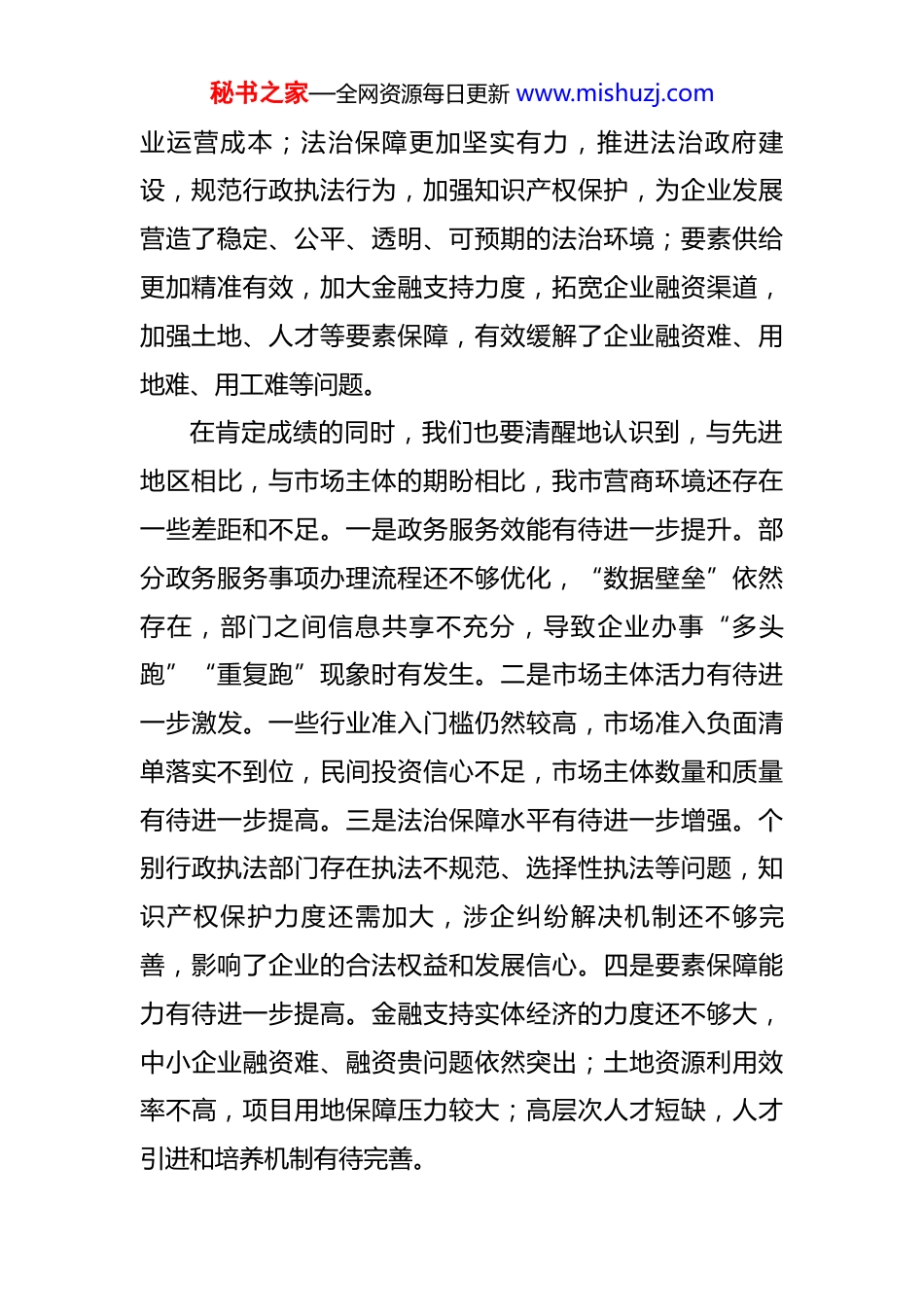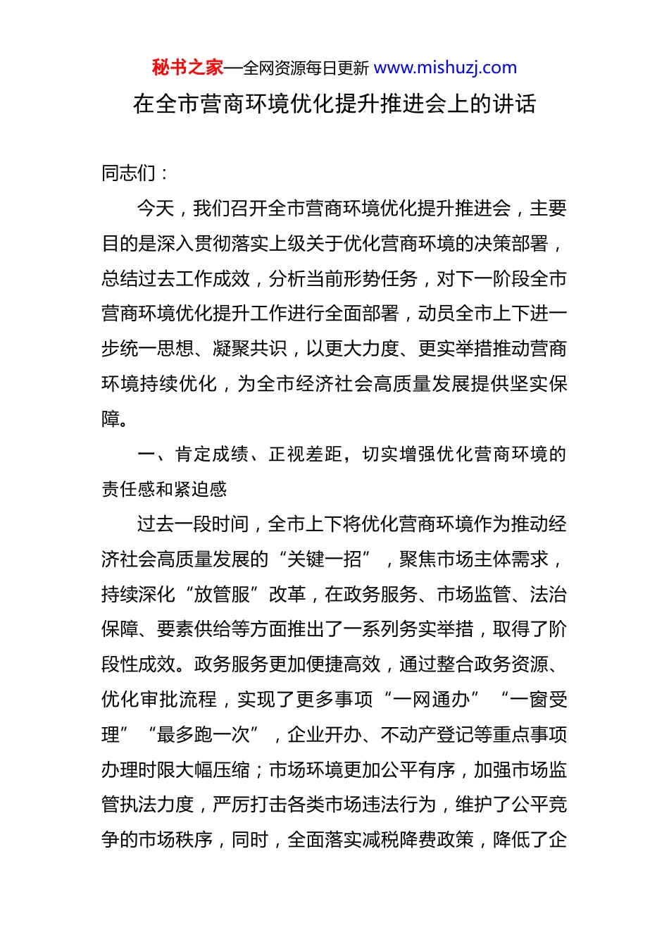 秘书之家—全网资源每日更新 www.mishuzj.com在全市营商环境优化提升推进会上的讲话 同志们:今天,我们召开全市营商环境优化提升推进会,主要目的是深入贯彻落实上级关于优化营商环境的决策部署,总结过去工作成效,分析当前形势任务,对下一阶段全市营商环境优化提升工作进行全面部署,动员全市上下进一步统一思想、凝聚共识,以更大力度、更实举措推动营商环境持续优化,为全市经济社会高质量发展提供坚实保障。一、肯定成绩、正视差距,切实增强优化营商环境的责任感和紧迫感过去一段时间,全市上下将优化营商环境作为推动经济社会高质量发展的“关键一招”,聚焦市场主体需求,持续深化“放管服”改革,在政务服务、市场监管、法治保障、要素供给等方面推出了一系列务实举措,取得了阶段性成效。政务服务更加便捷高效,通过整合政务资源、优化审批流程,实现了更多事项“一网通办”“一窗受理”“最多跑一次”,企业开办、不动产登记等重点事项办理时限大幅压缩;市场环境更加公平有序,加强市场监管执法力度,严厉打击各类市场违法行为,维护了公平竞争的市场秩序,同时,全面落实减税降费政策,降低了企秘书之家—全网资源每日更新 www.mishuzj.com业运营成本;法治保障更加坚实有力,推进法治政府建设,规范行政执法行为,加强知识产权保护,为企业发展营造了稳定、公平、透明、可预期的法治环境;要素供给更加精准有效,加大金融支持力度,拓宽企业融资渠道,加强土地、人才等要素保障,有效缓解了企业融资难、用地难、用工难等问题。在肯定成绩的同时,我们也要清醒地认识到,与先进地区相比,与市场主体的期盼相比,我市营商环境还存在一些差距和不足。一是政务服务效能有待进一步提升。部分政务服务事项办理流程还不够优化,“数据壁垒”依然存在,部门之间信息共享不充分,导致企业办事“多头跑”“重复跑”现象时有发生。二是市场主体活力有待进一步激发。一些行业准入门槛仍然较高,市场准入负面清单落实不到位,民间投资信心不足,市场主体数量和质量有待进一步提高。三是法治保障水平有待进一步增强。个别行政执法部门存在执法不规范、选择性执法等问题,知识产权保护力度还需加大,涉企纠纷解决机制还不够完善,影响了企业的合法权益和发展信心。四是要素保障能力有待进一步提高。金融支持实体经济的力度还不够大,中小企业融资难、融资贵问题依然突出;土地资源利用效率不高,项目用地保障压力较大;高层次人才短缺,人才引进和培养机制有待完善。秘书之家—全网资源每日更新 www.mishuzj.com这些问题,既是我们在优化营商环境过程中面临的挑战,也是我们下一步工作的着力点和突破口。我们必须以“等不起”的紧迫感、“慢不得”的危机感、“坐不住”的责任感,采取有效措施加以解决,推动营商环境持续优化提升。二、聚焦重点、精准发力,全力推动营商环境优化提升取得新突破优化营商环境是一项系统工程,涉及方方面面。我们要聚焦市场主体关切,抓住关键环节,精准发力、综合施策,全力打造市场化、法治化、国际化一流营商环境。(一)以深化“放管服”改革为抓手,提升政务服务效能政务服务是营商环境的重要体现。我们要持续深化“放管服”改革,进一步优化政务服务流程,提高政务服务质量和效率。要加大简政放权力度,持续清理规范行政许可事项,动态调整权责清单,最大限度减少政府对市场资源的直接配置和对市场活动的直接干预。要加强政务服务平台建设,推进政务服务“一网通办”向基层延伸,实现更多事项“全程网办”“掌上办”。要深化“一件事一次办”改革,围绕企业开办、项目审批、不动产登记等重点领域,梳理整合关联事项,优化再造办事流程,实现“一次告知、一表申请、一套材料、一窗受理、一网办秘书之家—全网资源每日更新 www.mishuzj.com理”。要加强政务服务队伍建设,开展政务服务窗口人员业务培训,提高服务意识和业务水平,打造一支高素质、专业化的政务服务队伍。(二)以激发市场主体活力为目标,营造公平竞争市场环境市场主体是经济发展的根基和动力源泉。我们要坚持“两个毫不动摇”,为各类市场主体创造公平竞争的市场环境。要全...