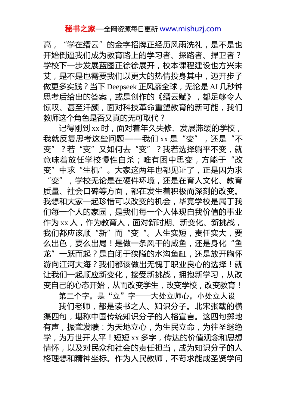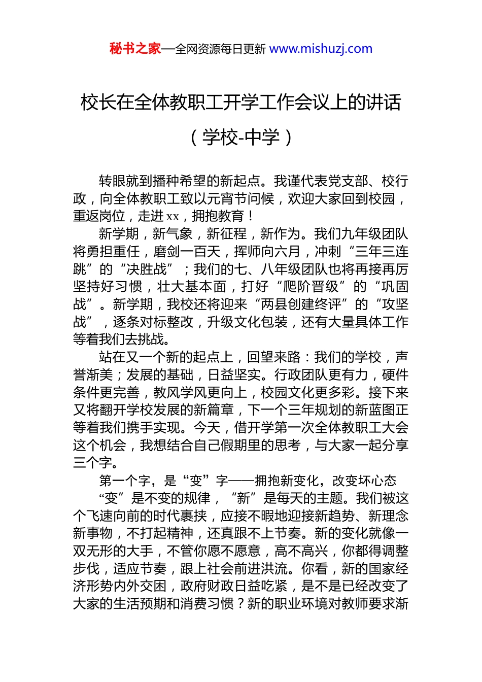 秘书之家—全网资源每日更新 www.mishuzj.com校长在全体教职工开学工作会议上的讲话(学校-中学)转眼就到播种希望的新起点。我谨代表党支部、校行政,向全体教职工致以元宵节问候,欢迎大家回到校园,重返岗位,走进 xx,拥抱教育!新学期,新气象,新征程,新作为。我们九年级团队将勇担重任,磨剑一百天,挥师向六月,冲刺“三年三连跳”的“决胜战”;我们的七、八年级团队也将再接再厉坚持好习惯,壮大基本面,打好“爬阶晋级”的“巩固战”。新学期,我校还将迎来“两县创建终评”的“攻坚战”,逐条对标整改,升级文化包装,还有大量具体工作等着我们去挑战。站在又一个新的起点上,回望来路:我们的学校,声誉渐美;发展的基础,日益坚实。行政团队更有力,硬件条件更完善,教风学风更向上,校园文化更多彩。接下来又将翻开学校发展的新篇章,下一个三年规划的新蓝图正等着我们携手实现。今天,借开学第一次全体教职工大会这个机会,我想结合自己假期里的思考,与大家一起分享三个字。第一个字,是“变”字——拥抱新变化,改变坏心态“变”是不变的规律,“新”是每天的主题。我们被这个飞速向前的时代裹挟,应接不暇地迎接新趋势、新理念新事物,不打起精神,还真跟不上节奏。新的变化就像一双无形的大手,不管你愿不愿意,高不高兴,你都得调整步伐,适应节奏,跟上社会前进洪流。你看,新的国家经济形势内外交困,政府财政日益吃紧,是不是已经改变了大家的生活预期和消费习惯?新的职业环境对教师要求渐秘书之家—全网资源每日更新 www.mishuzj.com高,“学在缙云”的金字招牌正经历风雨洗礼,是不是也开始倒逼我们成为教育路上的学习者、探路者、捍卫者?学校下一步发展蓝图正徐徐展开,校本课程建设也方兴未艾,是不是也需要我们以更大的热情投身其中,迈开步子做更多实践?当下 Deepseek 正风靡全球,无论是 AI 几秒钟思考后给出的答案,或是创作的《缙云赋》,都足够令人惊叹、甚至汗颜,面对科技革命重塑教育的新可能,我们教师这个角色是否又真的无可取代?记得刚到 xx 时,面对着年久失修、发展滞缓的学校,我就反复思考这些问题——我们 xx 是“变”,还是“不变”?若“变”又如何去“变”?我若选择躺平不变,就意味着放任学校慢性自杀;唯有困中思变,方能于“改变”中求“生机”。大家这两年也都见证了,正是因为求“变”,学校无论是在硬件环境,还是在育人文化、教育质量、社会口碑等方面,都在发生着积极而深刻的改变。我想和大家一起珍惜可以改变的机会,毕竟学校是属于我们每一个人的家园,是我们每一个人体现自我价值的事业作为 xx 人,作为教育人,面对新时期、新变化、新挑战,我们都应该顺“新”而“变“。人生实短,责任实大,要么出色,要么出局!是做一条风干的咸鱼,还是身化“鱼龙”一跃而起?是自闭于狭隘的水沟鱼缸,还是放开胸怀游向江河大海?我们都该做出无愧于职业良心的选择!就让我们一起顺应新变化,接受新挑战,拥抱新学习,从改变自己的心态开始,从而改变学生,改变学校,改变教育!第二个字,是“立”字——大处立师心,小处立人设我们老师,都是读书之人、知识分子。北宋张载的横渠四句,堪称中国传统知识分子的人格宣言。这四句掷地有声,振聋发聩:为天地立心,为生民立命,为往圣继绝学,为万世开太平!短短 xx 多字,传达的价值观念和思想情怀,以及对民众和社会的责任担当,成为知识分子的人格理想和精神坐标。作为人民教师,不苛求能成圣贤学问秘书之家—全网资源每日更新 www.mishuzj.com千秋伟业,但起码也要立得起“学高为师、身正为范“的天地师心、师道尊严。大家都是知识分子,在有生之年,须时时警醒自己,不违教育初心。我也知道,当下各种价值观念冲突,个人主义大有市场,躺平主义四下盛行,很多人也只想把教书用来安身立命。但我想,教师这个职业实在太特殊了,我们既要教书更该育人,怎么可以谋生而已,苟且偷安!电影《第二十条》里有一句话令人震撼:“你们有没有想过,我们判的不是别人的案子,而是别人的人生!”对于我们教师而言我们肩上的责任又何尝不是如此?我们教的何止是书,更...