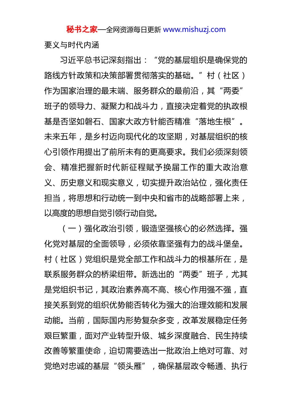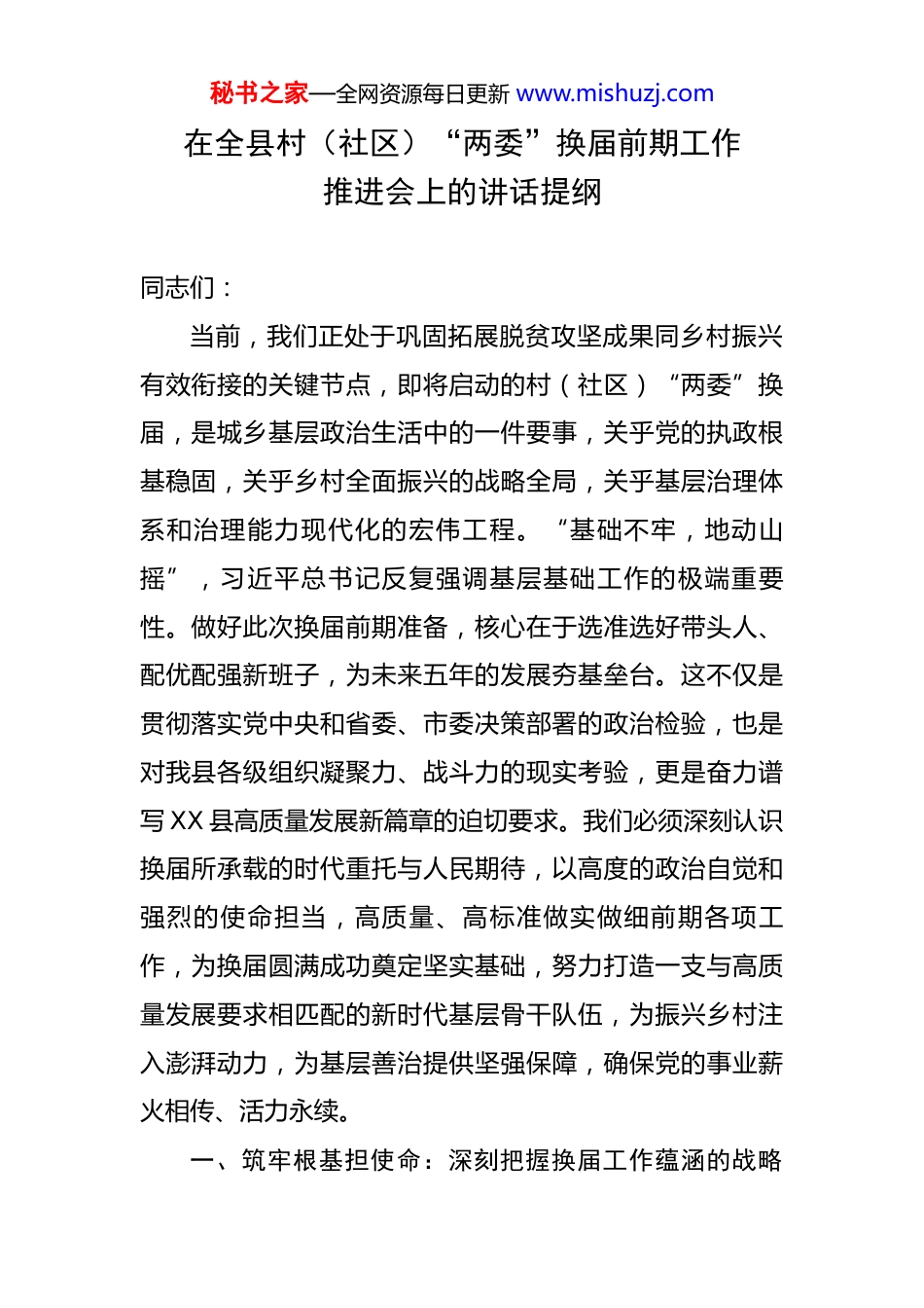 秘书之家—全网资源每日更新 www.mishuzj.com在全县村(社区)“两委”换届前期工作推进会上的讲话提纲 同志们:当前,我们正处于巩固拓展脱贫攻坚成果同乡村振兴有效衔接的关键节点,即将启动的村(社区)“两委”换届,是城乡基层政治生活中的一件要事,关乎党的执政根基稳固,关乎乡村全面振兴的战略全局,关乎基层治理体系和治理能力现代化的宏伟工程。“基础不牢,地动山摇”,习近平总书记反复强调基层基础工作的极端重要性。做好此次换届前期准备,核心在于选准选好带头人、配优配强新班子,为未来五年的发展夯基垒台。这不仅是贯彻落实党中央和省委、市委决策部署的政治检验,也是对我县各级组织凝聚力、战斗力的现实考验,更是奋力谱写 XX 县高质量发展新篇章的迫切要求。我们必须深刻认识换届所承载的时代重托与人民期待,以高度的政治自觉和强烈的使命担当,高质量、高标准做实做细前期各项工作,为换届圆满成功奠定坚实基础,努力打造一支与高质量发展要求相匹配的新时代基层骨干队伍,为振兴乡村注入澎湃动力,为基层善治提供坚强保障,确保党的事业薪火相传、活力永续。一、筑牢根基担使命:深刻把握换届工作蕴涵的战略秘书之家—全网资源每日更新 www.mishuzj.com要义与时代内涵习近平总书记深刻指出:“党的基层组织是确保党的路线方针政策和决策部署贯彻落实的基础。”村(社区)作为国家治理的最末端、服务群众的最前沿,其“两委”班子的领导力、凝聚力和战斗力,直接决定着党的执政根基是否坚如磐石、国家大政方针能否精准“落地生根”。未来五年,是乡村迈向现代化的攻坚期,对基层组织的核心引领作用提出了前所未有的更高要求。我们必须深刻领会、精准把握新时代新征程赋予换届工作的重大政治意义、历史意义和现实意义,切实提升政治站位,强化责任担当,将思想和行动统一到中央和省市的战略部署上来,以高度的思想自觉引领行动自觉。(一)强化政治引领,锻造坚强核心的必然选择。强化党对基层的全面领导,必须依靠坚强有力的战斗堡垒。村(社区)党组织是党全部工作和战斗力的根基所在,是联系服务群众的桥梁纽带。新选出的“两委”班子,尤其是党组织书记,其政治素养高不高、核心作用强不强,直接关系到党的组织优势能否转化为强大的治理效能和发展动能。当前,国际国内形势复杂多变,改革发展稳定任务艰巨繁重,面对产业转型升级、城乡深度融合、民生持续改善等繁重使命,迫切需要选出一批政治上绝对可靠、对党绝对忠诚的基层“领头雁”,确保基层政令畅通、执行秘书之家—全网资源每日更新 www.mishuzj.com坚决。这就要求我们在换届工作中,必须把是否坚定拥护“两个确立”、增强“四个意识”、坚定“四个自信”、做到“两个维护”作为选人用人的首要标准,确保“两委”成员在大是大非面前头脑清醒、立场坚定,在各种风险考验面前敢于斗争、善于斗争,在任何时候任何情况下都同党中央保持高度一致。通过换届,真正把那些理想信念坚定、政治立场稳固、能够坚决贯彻执行党的路线方针政策的优秀分子选进班子,特别是选优配强党组织书记这个“关键少数”,使之成为基层干部群众信赖的主心骨和顶梁柱,不断巩固党的执政根基和社会基础。(二)紧扣振兴伟业,驱动乡村发展的关键引擎。全面推进乡村振兴战略实施,呼唤更强引擎驱动。中央农村工作会议对当前和今后一个时期“三农”工作作出系统部署,明确了全面推进乡村振兴的总抓手地位。村(社区)“两委”班子是落实这一战略的最直接组织者和推动者。未来五年,是新一届班子履职尽责的完整周期,肩负着保障国家粮食安全、发展特色优势产业、建设和美宜居乡村、深化农村综合改革、提升乡风文明水平、优化乡村治理格局等一系列重大历史任务。这亟需一支既懂农业、爱农村、爱农民,又具备现代市场意识、科技创新能力、经营管理素养和群众工作本领的复合型干部队伍。从我县初步摸底情况看,优化班子结构已刻不容缓。班子成员平均秘书之家—全网资源每日更新 www.mishuzj.com年龄 44.2 岁(基于合理推断),50 岁以上人员占比偏高(基于合理推断);大专及以上学历成员仅占 28.5%(基于合理推断),...