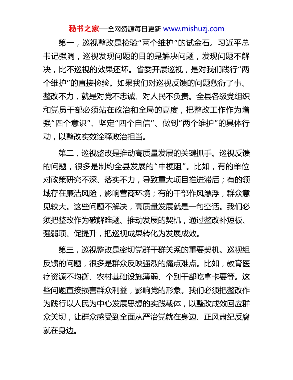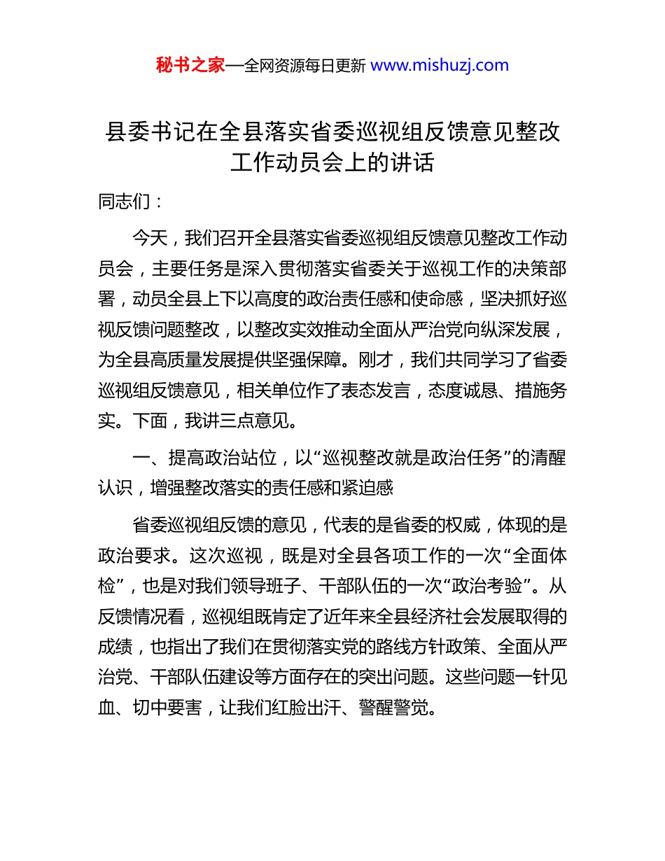 秘书之家—全网资源每日更新 www.mishuzj.com县委书记在全县落实省委巡视组反馈意见整改工作动员会上的讲话同志们:今天,我们召开全县落实省委巡视组反馈意见整改工作动员会,主要任务是深入贯彻落实省委关于巡视工作的决策部署,动员全县上下以高度的政治责任感和使命感,坚决抓好巡视反馈问题整改,以整改实效推动全面从严治党向纵深发展,为全县高质量发展提供坚强保障。刚才,我们共同学习了省委巡视组反馈意见,相关单位作了表态发言,态度诚恳、措施务实。下面,我讲三点意见。“”一、提高政治站位,以 巡视整改就是政治任务 的清醒认识,增强整改落实的责任感和紧迫感省委巡视组反馈的意见,代表的是省委的权威,体现的是“政治要求。这次巡视,既是对全县各项工作的一次 全面体”“”检 ,也是对我们领导班子、干部队伍的一次 政治考验 。从反馈情况看,巡视组既肯定了近年来全县经济社会发展取得的成绩,也指出了我们在贯彻落实党的路线方针政策、全面从严治党、干部队伍建设等方面存在的突出问题。这些问题一针见血、切中要害,让我们红脸出汗、警醒警觉。秘书之家—全网资源每日更新 www.mishuzj.com“”第一,巡视整改是检验 两个维护 的试金石。习近平总书记强调,巡视发现问题的目的是解决问题,发现问题不解“决,比不巡视的效果还坏。省委开展巡视,是对我们践行 两”个维护 的直接检验。如果我们对巡视反馈的问题敷衍了事、整改不力,就是对党不忠诚、对人民不负责。全县各级党组织和党员干部必须站在政治和全局的高度,把整改工作作为增“”“”“”强 四个意识 、坚定 四个自信 、做到 两个维护 的具体行动,以整改实效诠释政治担当。第二,巡视整改是推动高质量发展的关键抓手。巡视反馈“”的问题,很多是制约全县发展的 中梗阻 。比如,有的单位对政策研究不深、落实不力,导致重大项目推进滞后;有的领域存在廉洁风险,影响营商环境;有的干部作风漂浮,群众意见较大。这些问题不解决,高质量发展就是一句空话。我们必须把整改作为破解难题、推动发展的契机,通过整改补短板、强弱项、促提升,把巡视成果转化为发展成效。第三,巡视整改是密切党群干群关系的重要契机。巡视组反馈的问题,很多是群众反映强烈的痛点难点。比如,教育医疗资源不均衡、农村基础设施薄弱、个别干部吃拿卡要等。这些问题直接损害群众利益,影响党的形象。我们必须把整改作为践行以人民为中心发展思想的实践载体,以整改成效回应群众关切,让群众感受到全面从严治党就在身边、正风肃纪反腐就在身边。秘书之家—全网资源每日更新 www.mishuzj.com“”二、坚持问题导向,以 刀刃向内、刮骨疗毒 的决心勇气,推动整改任务落地见效省委巡视组反馈的问题,涉及党的建设、经济发展、民生保障、作风建设等各个方面,问题表现具体、责任链条清晰。全县各级各部门必须坚持问题导向、目标导向、结果导向相统“”“”一,以 钉钉子 精神抓好整改,确保反馈问题 清零见底 。“”第一,聚焦 政治担当 ,在贯彻落实党的路线方针政策上动真格。巡视反馈指出,有的单位对党中央决策部署和省委“”工作要求理解不深、落实不力,存在 上热中温下冷 现象。“”比如,在乡村振兴战略实施中,部分乡镇存在 等靠要 思想,产业规划脱离实际;在生态环境保护中,个别部门监管责任缺失,导致污染问题反弹。整改这些问题的关键,在于强化政治担当。“”要建立 第一议题 跟踪问效机制,对习近平总书记重要指示批示和党中央重大决策部署,第一时间传达学习、第一时“间研究落实、第一时间跟踪问效。要开展 政策落地专项行”动 ,由分管县领导牵头,对近三年出台的重大政策进行全面梳理,逐项评估执行效果,对落实不力的单位约谈提醒、挂牌“”督办。要完善 四不两直 调研制度,县领导带头深入基层一“线,现场发现问题、解决问题,杜绝 以会议落实会议、以文”件落实文件 。秘书之家—全网资源每日更新 www.mishuzj.com“”第二,聚焦 两个责任 ,在推进全面从严治党上出重拳。巡视反馈指出,有的党组织主体责任虚化空转,纪委监督执纪宽松软,重点领域廉洁风险...