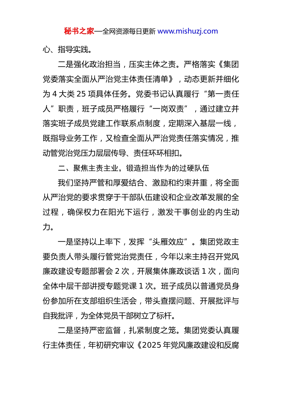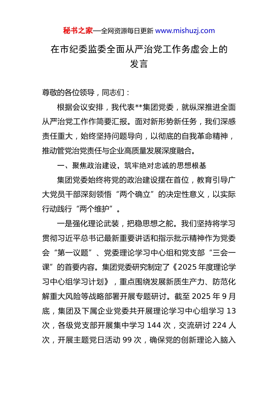 秘书之家—全网资源每日更新 www.mishuzj.com在市纪委监委全面从严治党工作务虚会上的发言 尊敬的各位领导,同志们:根据会议安排,我代表**集团党委,就纵深推进全面从严治党工作作简要汇报。面对新形势新任务,我们深感责任重大,始终坚持问题导向,以彻底的自我革命精神,推动管党治党责任与企业高质量发展深度融合。一、聚焦政治建设,筑牢绝对忠诚的思想根基集团党委始终将党的政治建设摆在首位,教育引导广大党员干部深刻领悟“两个确立”的决定性意义,以实际行动践行“两个维护”。一是强化理论武装,把稳思想之舵。我们坚持将学习贯彻习近平总书记最新重要讲话和指示批示精神作为党委会“第一议题”、党委理论学习中心组和党支部“三会一课”的首要内容。集团党委研究制定了《2025 年度理论学习中心组学习计划》,重点围绕发展新质生产力、防范化解重大风险等战略部署开展专题研讨。截至 2025 年 9 月底,集团及下属企业党委共开展理论学习中心组学习 13次,各级党支部开展集中学习 144 次,交流研讨 224 人次,开展主题党日活动 99 次,确保党的创新理论入脑入秘书之家—全网资源每日更新 www.mishuzj.com心、指导实践。二是强化政治担当,压实主体之责。严格落实《集团党委落实全面从严治党主体责任清单》,动态更新并细化为 4 大类 25 项具体任务。党委书记认真履行“第一责任人”职责,班子成员严格履行“一岗双责”,通过建立并落实班子成员党建工作联系点制度,定期深入基层一线,既指导业务工作,又检查全面从严治党责任落实情况,推动管党治党压力层层传导、责任环环相扣。二、聚焦主责主业,锻造担当作为的过硬队伍我们坚持严管和厚爱结合、激励和约束并重,将全面从严治党的要求贯穿于干部队伍建设和企业改革发展的全过程,确保权力在阳光下运行,激发干事创业的内生动力。一是坚持以上率下,发挥“头雁效应”。集团党政主要负责人带头履行管党治党责任,今年以来主持召开党风廉政建设专题部署会 2 次,开展集体廉政谈话 1 次,面向全体中层干部讲授专题党课 1 次。班子成员以普通党员身份参加所在支部组织生活会,带头查摆问题、开展批评与自我批评,为全体党员干部树立了标杆。二是坚持严密监督,扎紧制度之笼。集团党委认真履行主体责任,年初研究审议《2025 年党风廉政建设和反腐秘书之家—全网资源每日更新 www.mishuzj.com败工作要点》,明确了 13 项重点工作任务。我们特别针对近年来业务发展中暴露出的风险点,聚焦工程招投标、大宗物资采购、资产处置等关键环节,修订完善了《集团采购管理办法》等 5 项内控制度,利用数字化监督平台对关键业务流程进行实时监控,从源头上防范廉政风险。三是坚持精准问责,用好执纪之尺。我们强化监督执纪问责,对苗头性、倾向性问题早发现、早提醒、早纠正。今年以来,开展政治生态谈话 14 人次,对相关人员进行提醒告诫。同时,严格执行廉政审核前置程序,在干部选拔任用、评先评优等工作中,坚决执行“凡提四必”,已出具廉政审查意见 8 份,坚决防止“带病提拔”“带病评优”,营造风清气正的政治生态。三、聚焦作风建设,涵养风清气正的政治生态集团党委持之以恒落实中央八项规定及其实施细则精神,以钉钉子精神纠治“四风”问题,推动党风企风持续向好。一是常态化开展警示教育。坚持用身边事教育身边人,组织党员干部赴市廉政警示教育基地实地践学,集中观看《反腐为了人民》等警示教育片,并对近年来查处的违纪违法典型案例进行内部通报剖析,引导广大党员干部知敬畏、存戒惧、守底线。今年以来,班子成员已深入各秘书之家—全网资源每日更新 www.mishuzj.com自党建联系点讲授纪律党课 12 次。二是持续性深化正风肃纪。紧盯重要节点,坚持“逢节必查、逢查必报”,在元旦、春节、清明、五一、端午、中秋、国庆等节前,通过多种形式重申作风纪律要求31 次,并组织专项检查组对公车私用、违规吃喝、滥发津补贴等问题进行明察暗访,做到监督检查“常态化、高频率、全覆盖”。四、聚焦问题整改,以自我革命精神推动高质量发展坦诚地讲,对照市委、市纪委监委的高标准严要...