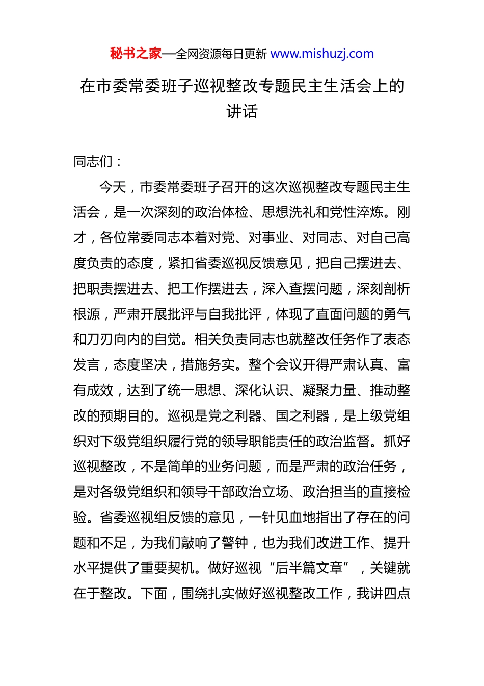 秘书之家—全网资源每日更新 www.mishuzj.com在市委常委班子巡视整改专题民主生活会上的讲话 同志们:今天,市委常委班子召开的这次巡视整改专题民主生活会,是一次深刻的政治体检、思想洗礼和党性淬炼。刚才,各位常委同志本着对党、对事业、对同志、对自己高度负责的态度,紧扣省委巡视反馈意见,把自己摆进去、把职责摆进去、把工作摆进去,深入查摆问题,深刻剖析根源,严肃开展批评与自我批评,体现了直面问题的勇气和刀刃向内的自觉。相关负责同志也就整改任务作了表态发言,态度坚决,措施务实。整个会议开得严肃认真、富有成效,达到了统一思想、深化认识、凝聚力量、推动整改的预期目的。巡视是党之利器、国之利器,是上级党组织对下级党组织履行党的领导职能责任的政治监督。抓好巡视整改,不是简单的业务问题,而是严肃的政治任务,是对各级党组织和领导干部政治立场、政治担当的直接检验。省委巡视组反馈的意见,一针见血地指出了存在的问题和不足,为我们敲响了警钟,也为我们改进工作、提升水平提供了重要契机。做好巡视“后半篇文章”,关键就在于整改。下面,围绕扎实做好巡视整改工作,我讲四点秘书之家—全网资源每日更新 www.mishuzj.com意见。一、提升政治站位,深刻领会巡视整改的极端重要性党的十八大以来,以习近平同志为核心的党中央高度重视巡视工作,将其作为推进党的自我革命、全面从严治党的战略性制度安排。习近平总书记关于巡视工作的重要论述,特别是关于党的自我革命的重要思想,为我们深化政治巡视、抓好整改落实提供了根本遵循和行动指南。我们必须从政治和全局的高度,深刻认识抓好巡视整改的重大意义。首先,抓好巡视整改是坚定拥护“两个确立”、坚决做到“两个维护”的具体行动。政治上的看齐、思想上的追随、行动上的紧跟,最终都要落实在具体工作中、体现在整改成效上。省委巡视反馈的问题,无论是思想层面的、工作层面的,还是作风层面的,归根结底都是政治问题,反映出我们在贯彻落实党中央决策部署和省委工作要求上还存在差距。能否以最坚决的态度、最果断的措施、最扎实的作风抓好整改,是检验我们政治忠诚度的“试金石”。必须把巡视整改作为一项严肃的政治纪律和政治规矩,以“不贰过”的决心,不折不扣、不遗不漏地完成好各项整改任务,用实际行动诠释对党的绝对忠诚。其次,抓好巡视整改是纵深推进全面从严治党、营造秘书之家—全网资源每日更新 www.mishuzj.com风清气正政治生态的必然要求。巡视是发现问题的“显微镜”,整改是解决问题的“手术刀”。巡视发现的问题,往往是管党治党中的“老大难”问题、是制约发展的深层次问题。对此,决不能有任何“闯关”心态或“侥幸”心理。必须坚决扛起全面从严治党主体责任,以此次巡视整改为契机,深入查找权力运行、监督管理、制度建设等方面的漏洞和薄弱环节。要坚持标本兼治,既要拿出“当下改”的举措,集中力量解决巡视指出的具体问题;更要形成“长久立”的机制,注重从制度层面堵塞漏洞、固化成果,做到以巡促改、以巡促建、以巡促治,努力实现政治生态的持久风清气正。最后,抓好巡视整改是奋力谱写**高质量发展新篇章的强大动力。当前,**正处在全方位转型的关键时期。市委确立的建设“一个核心、两大示范、三大门户”战略目标是立足**发展阶段、资源禀赋和区位优势作出的重大部署。然而,巡视反馈的一些问题,如思想解放不够、创新能力不强、部分干部担当作为精神不足等,正是阻碍我们实现这一宏伟蓝图的“绊脚石”和“拦路虎”。必须把巡视整改与贯彻落实习近平总书记考察**重要讲话重要指示精神结合起来,与完整、准确、全面贯彻新发展理念结合起来,与全市中心工作结合起来,通过解决一个问题,带秘书之家—全网资源每日更新 www.mishuzj.com动一片工作,实现一次提升。要把整改压力转化为推动高质量发展的强大动力,把整改成果体现为转型发展的实际成效。二、坚持问题导向,以钉钉子精神确保整改任务落地见效问题是时代的声音,也是工作的导向。巡视反馈的意见,就是一份详尽的“问题清单”和“任务书”。我们必须以最坚决的态度正视问题,以最严格的标准剖析问题,...