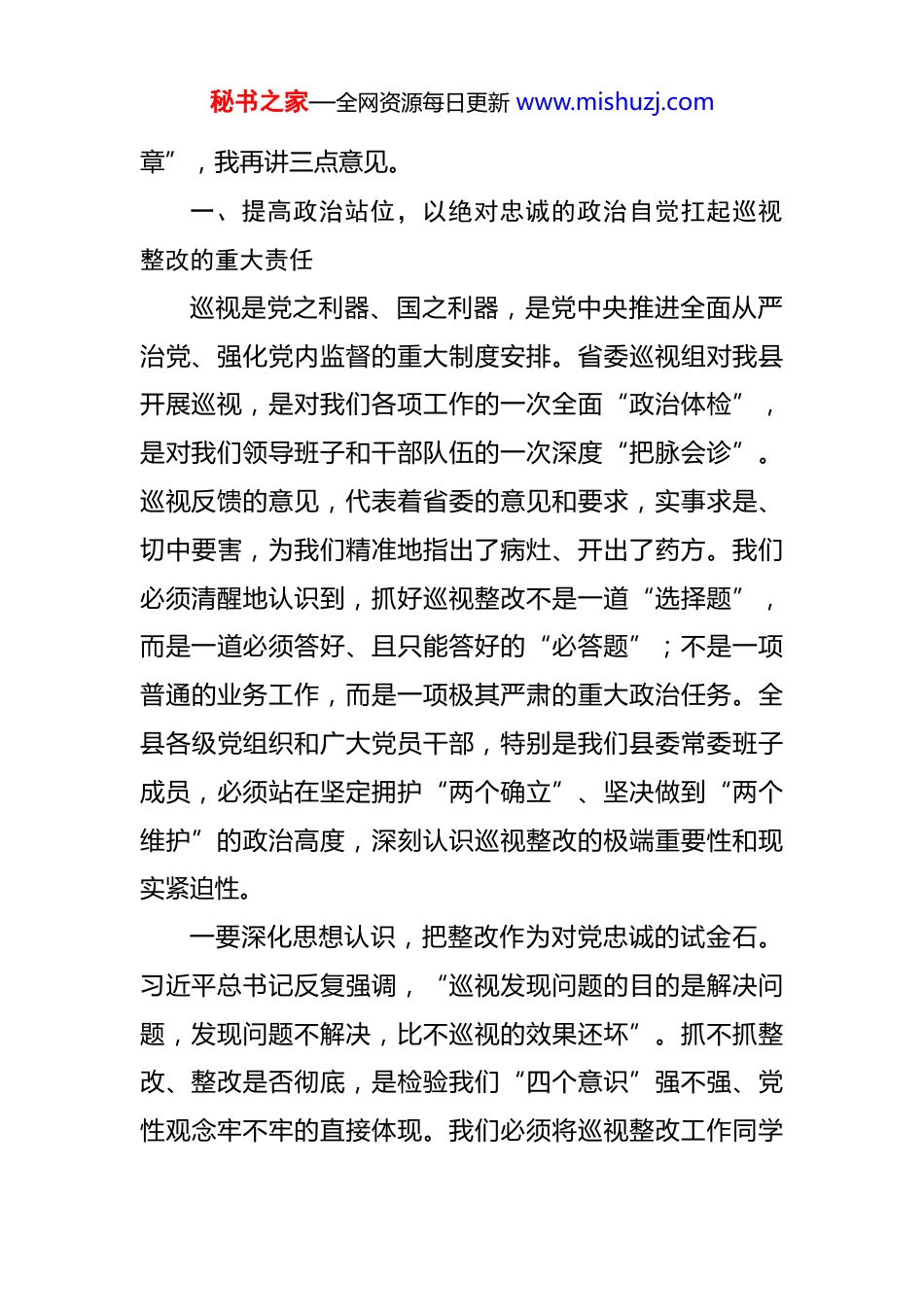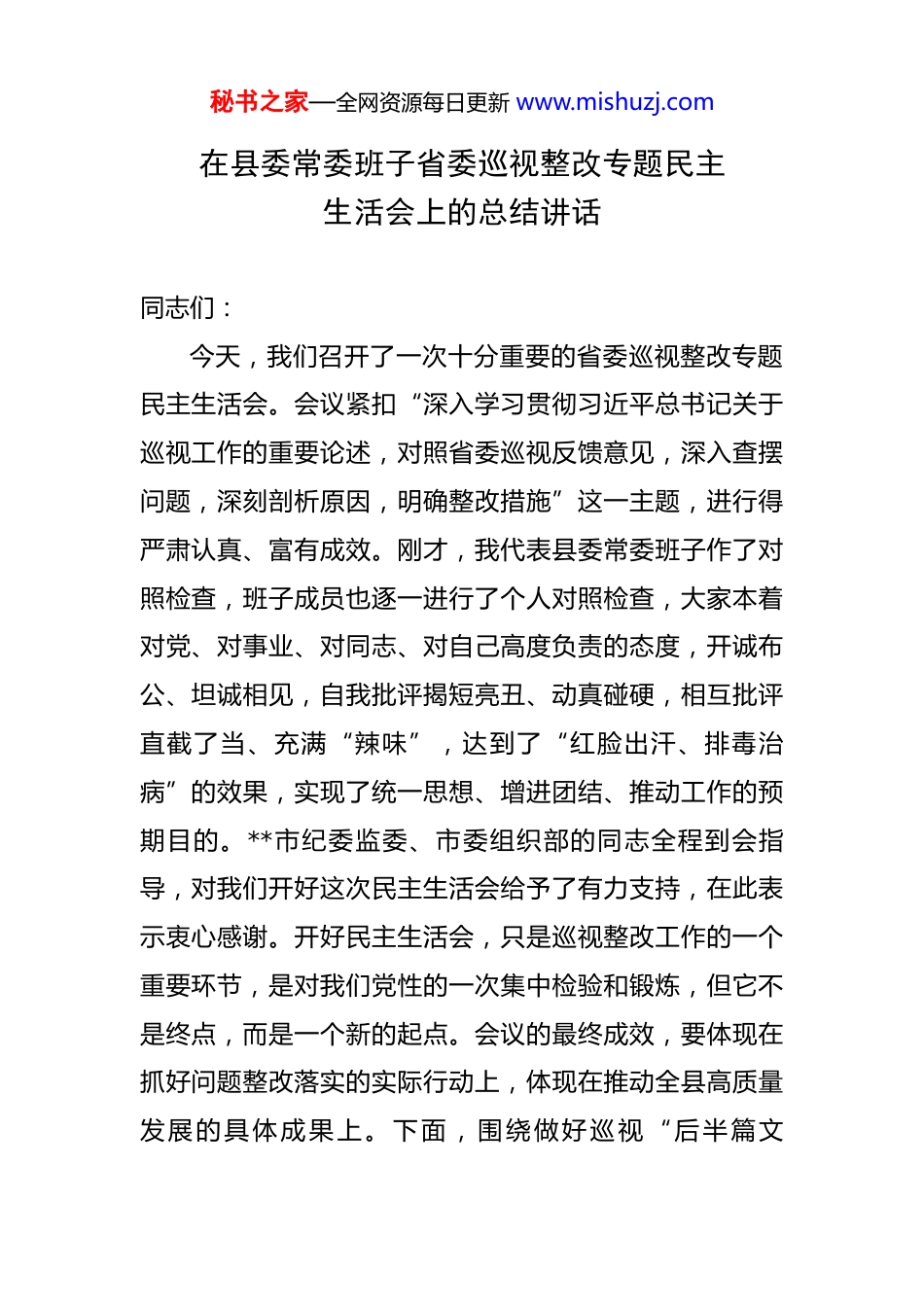 秘书之家—全网资源每日更新 www.mishuzj.com在县委常委班子省委巡视整改专题民主生活会上的总结讲话 同志们:今天,我们召开了一次十分重要的省委巡视整改专题民主生活会。会议紧扣“深入学习贯彻习近平总书记关于巡视工作的重要论述,对照省委巡视反馈意见,深入查摆问题,深刻剖析原因,明确整改措施”这一主题,进行得严肃认真、富有成效。刚才,我代表县委常委班子作了对照检查,班子成员也逐一进行了个人对照检查,大家本着对党、对事业、对同志、对自己高度负责的态度,开诚布公、坦诚相见,自我批评揭短亮丑、动真碰硬,相互批评直截了当、充满“辣味”,达到了“红脸出汗、排毒治病”的效果,实现了统一思想、增进团结、推动工作的预期目的。**市纪委监委、市委组织部的同志全程到会指导,对我们开好这次民主生活会给予了有力支持,在此表示衷心感谢。开好民主生活会,只是巡视整改工作的一个重要环节,是对我们党性的一次集中检验和锻炼,但它不是终点,而是一个新的起点。会议的最终成效,要体现在抓好问题整改落实的实际行动上,体现在推动全县高质量发展的具体成果上。下面,围绕做好巡视“后半篇文秘书之家—全网资源每日更新 www.mishuzj.com章”,我再讲三点意见。一、提高政治站位,以绝对忠诚的政治自觉扛起巡视整改的重大责任巡视是党之利器、国之利器,是党中央推进全面从严治党、强化党内监督的重大制度安排。省委巡视组对我县开展巡视,是对我们各项工作的一次全面“政治体检”,是对我们领导班子和干部队伍的一次深度“把脉会诊”。巡视反馈的意见,代表着省委的意见和要求,实事求是、切中要害,为我们精准地指出了病灶、开出了药方。我们必须清醒地认识到,抓好巡视整改不是一道“选择题”,而是一道必须答好、且只能答好的“必答题”;不是一项普通的业务工作,而是一项极其严肃的重大政治任务。全县各级党组织和广大党员干部,特别是我们县委常委班子成员,必须站在坚定拥护“两个确立”、坚决做到“两个维护”的政治高度,深刻认识巡视整改的极端重要性和现实紧迫性。一要深化思想认识,把整改作为对党忠诚的试金石。习近平总书记反复强调,“巡视发现问题的目的是解决问题,发现问题不解决,比不巡视的效果还坏”。抓不抓整改、整改是否彻底,是检验我们“四个意识”强不强、党性观念牢不牢的直接体现。我们必须将巡视整改工作同学秘书之家—全网资源每日更新 www.mishuzj.com习贯彻习近平总书记考察四川重要讲话重要指示精神紧密结合起来,同贯彻落实党的二十大和二十届二中、三中、四中全会精神,以及省委、市委历次全会精神紧密结合起来,不断增强推进巡视整改的政治自觉、思想自觉和行动自觉。要彻底摒弃“过关”思想、“交差”心态,坚决杜绝“与己无关”的旁观主义和“新官不理旧账”的错误观念,真正把巡视组反馈的每一个问题都当作“政治必答题”,以最坚决的态度、最果断的措施,不折不扣地抓好落实。二要强化理论武装,从思想根源上筑牢整改防线。问题表现在下面,根子往往在上面,具体体现在工作中,但深层原因在于思想上。这次巡视反馈指出的“推动高质量转型发展能力不足”等问题,究其根本,还是我们的理论学习不够深入、思想解放不够到位、发展理念没有完全跟上新时代节拍。常委班子要带头加强理论学习,持续在学懂弄通做实习近平新时代中国特色社会主义思想上下功夫,坚持读原著、学原文、悟原理,深刻领会其核心要义、精神实质、丰富内涵和实践要求。要通过学习,不断改造主观世界,校准思想偏差,真正把党的创新理论转化为谋划工作的正确思路、破解难题的有效方法、推动发展的强大动力,从世界观、人生观、价值观的深层次解决好秘书之家—全网资源每日更新 www.mishuzj.com“总开关”问题,为彻底整改提供坚实的思想保证。三要坚持以上率下,层层压实整改的政治责任。整改落实,关键在人,关键在责任。作为“关键少数”,县委常委班子成员必须发挥“头雁效应”。我作为县委书记,是第一责任人,对全县的整改工作负总责,对班子和个人的问题整改负首要责任,我将带头领办最难啃的“硬骨头”,带头督办最棘手的问题。各位常委同...