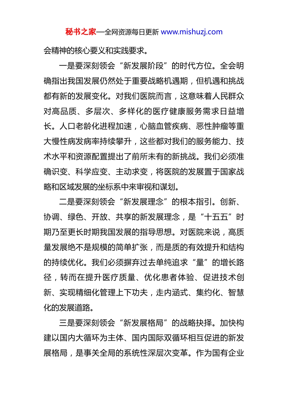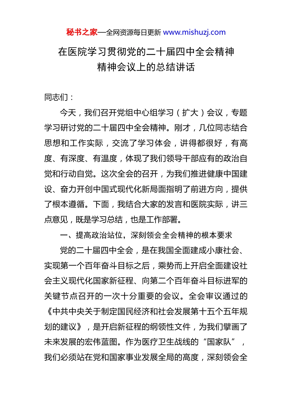 秘书之家—全网资源每日更新 www.mishuzj.com在医院学习贯彻党的二十届四中全会精神精神会议上的总结讲话 同志们:今天,我们召开党组中心组学习(扩大)会议,专题学习研讨党的二十届四中全会精神。刚才,几位同志结合思想和工作实际,交流了学习体会,讲得都很好,有高度、有深度、有温度,体现了我们领导干部应有的政治自觉和行动自觉。这次全会的召开,为我们推进健康中国建设、奋力开创中国式现代化新局面指明了前进方向,提供了根本遵循。下面,我结合大家的发言和医院实际,讲三点意见,既是学习总结,也是工作部署。一、提高政治站位,深刻领会全会精神的根本要求党的二十届四中全会,是在我国全面建成小康社会、实现第一个百年奋斗目标之后,乘势而上开启全面建设社会主义现代化国家新征程、向第二个百年奋斗目标进军的关键节点召开的一次十分重要的会议。全会审议通过的《中共中央关于制定国民经济和社会发展第十五个五年规划的建议》,是开启新征程的纲领性文件,为我们擘画了未来发展的宏伟蓝图。作为医疗卫生战线的“国家队”,我们必须站在党和国家事业发展全局的高度,深刻领会全秘书之家—全网资源每日更新 www.mishuzj.com会精神的核心要义和实践要求。一是要深刻领会“新发展阶段”的时代方位。全会明确指出我国发展仍然处于重要战略机遇期,但机遇和挑战都有新的发展变化。对我们医院而言,这意味着人民群众对高品质、多层次、多样化的医疗健康服务需求日益增长。人口老龄化进程加速,心脑血管疾病、恶性肿瘤等重大慢性病发病率持续攀升,这些都对我们的服务能力、技术水平和资源配置提出了前所未有的新挑战。我们必须准确识变、科学应变、主动求变,将医院的发展置于国家战略和区域发展的坐标系中来审视和谋划。二是要深刻领会“新发展理念”的根本指引。创新、协调、绿色、开放、共享的新发展理念,是“十五五”时期乃至更长时期我国发展的指导思想。对医院来说,高质量发展绝不是规模的简单扩张,而是质的有效提升和结构的持续优化。我们必须摒弃过去单纯追求“量”的增长路径,转而在提升医疗质量、优化患者体验、促进技术创新、实现精细化管理上下功夫,走内涵式、集约化、智慧化的发展道路。三是要深刻领会“新发展格局”的战略抉择。加快构建以国内大循环为主体、国内国际双循环相互促进的新发展格局,是事关全局的系统性深层次变革。作为国有企业秘书之家—全网资源每日更新 www.mishuzj.com举办的医疗机构,我们是服务国内大循环、保障国民健康的重要支点。我们要充分发挥在区域医疗体系中的龙头作用,通过资源整合、技术辐射和人才培养,带动区域医疗服务水平的整体提升,畅通优质医疗资源的供给循环,在服务国家战略中找准定位、展现作为。二、聚焦主责主业,以高质量党建引领医院高质量发展学习贯彻全会精神,关键在于行动,在于落实。我们要始终坚持和加强党的全面领导,把党建工作深度融入医院改革发展的全过程、各方面,以高质量党建引领高质量发展,确保全会精神在医院落地生根、开花结果。(一)强化党的领导,在深化改革中彰显“主力军”担当。国有企业办医疗机构改革已基本完成,全国国资系统监管企业医疗机构改革完成率达到 99.6%。但这不意味着改革的终结,而是专业化整合、高质量发展新征程的开始。作为**集团医疗健康板块的核心力量,我们要在新一轮国企改革深化提升行动中继续当先锋、作表率。党组要切实发挥“把方向、管大局、保落实”的领导作用,坚持公立医院的公益性导向,确保改革不偏向、发展不走样。我们要主动融入区域医疗一体化发展,牵头构建紧密型医联体,将我们的优质资源、先进技术和管理经验下沉到基秘书之家—全网资源每日更新 www.mishuzj.com层,提升区域医疗服务的同质化、均质化水平,在破解群众“看病难”问题上发挥关键作用。这既是我们的社会责任,也是我们作为国有医疗机构“主力军”的核心价值所在。(二)紧扣年度目标,在精细化管理中提升发展“含金量”。发展是硬道理,数据是试金石。面对即将到来的2025 年收官之战,我们必须紧盯年度目标不放松,以钉钉子精神抓好各项任务落实。根据院务会研究的...