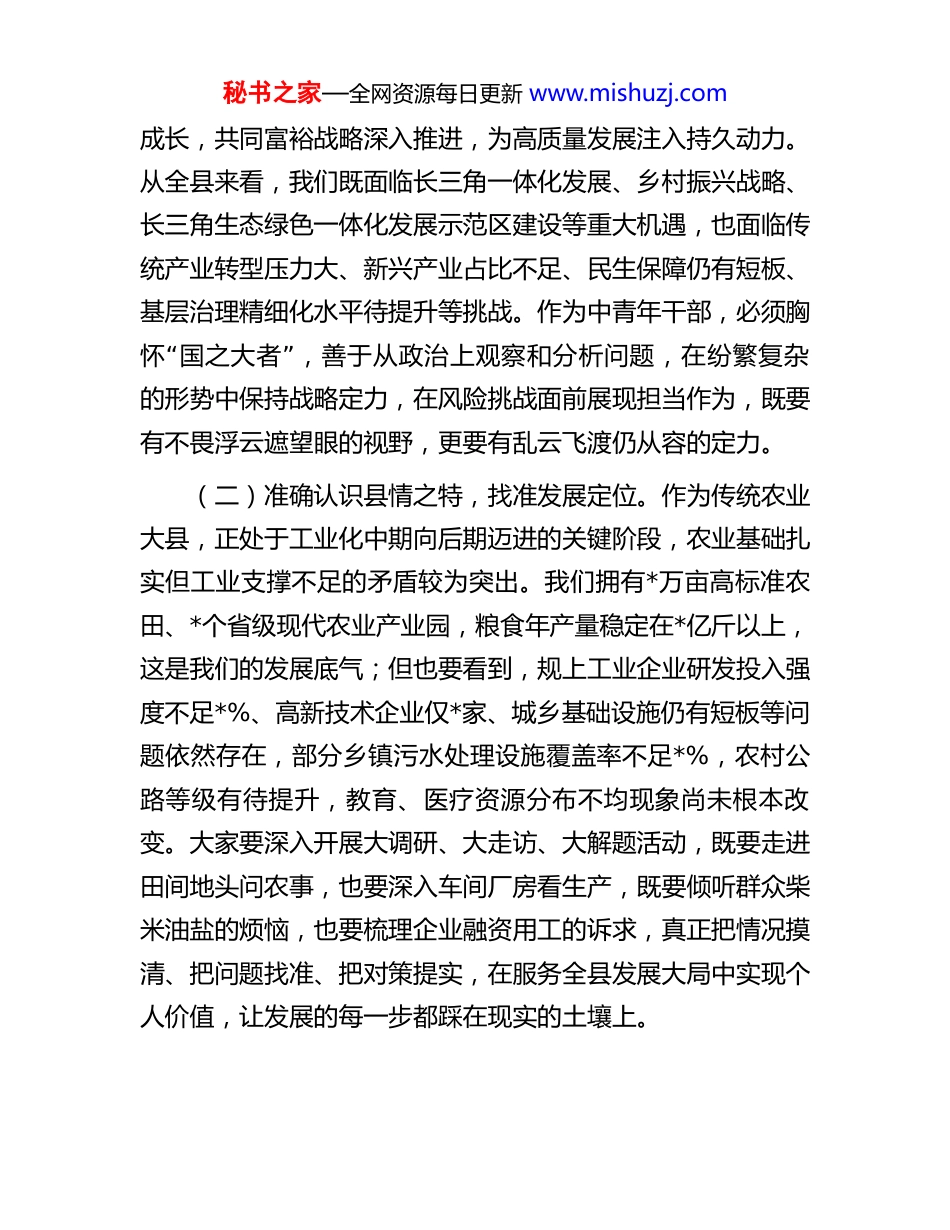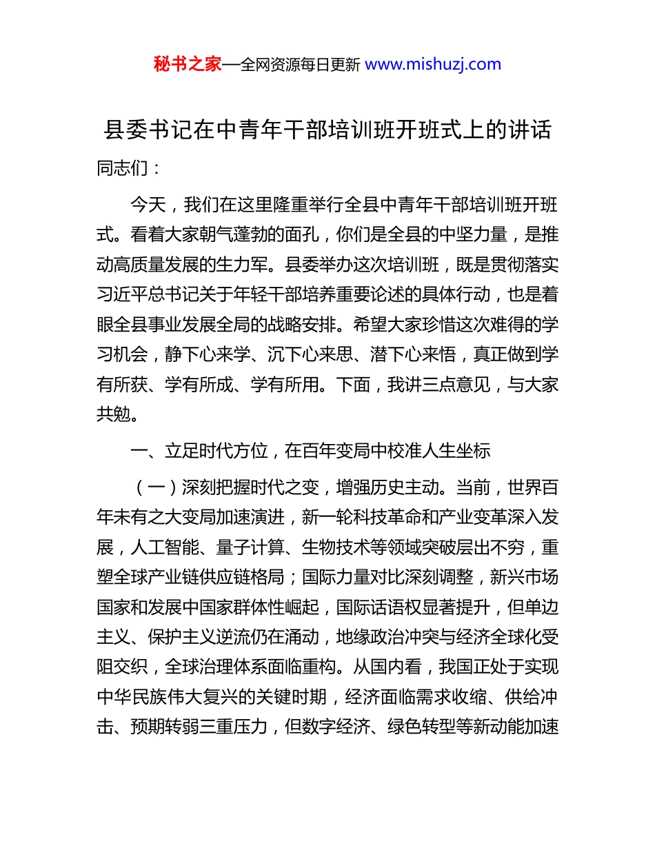 秘书之家—全网资源每日更新 www.mishuzj.com县委书记在中青年干部培训班开班式上的讲话同志们:今天,我们在这里隆重举行全县中青年干部培训班开班式。看着大家朝气蓬勃的面孔,你们是全县的中坚力量,是推动高质量发展的生力军。县委举办这次培训班,既是贯彻落实习近平总书记关于年轻干部培养重要论述的具体行动,也是着眼全县事业发展全局的战略安排。希望大家珍惜这次难得的学习机会,静下心来学、沉下心来思、潜下心来悟,真正做到学有所获、学有所成、学有所用。下面,我讲三点意见,与大家共勉。一、立足时代方位,在百年变局中校准人生坐标(一)深刻把握时代之变,增强历史主动。当前,世界百年未有之大变局加速演进,新一轮科技革命和产业变革深入发展,人工智能、量子计算、生物技术等领域突破层出不穷,重塑全球产业链供应链格局;国际力量对比深刻调整,新兴市场国家和发展中国家群体性崛起,国际话语权显著提升,但单边主义、保护主义逆流仍在涌动,地缘政治冲突与经济全球化受阻交织,全球治理体系面临重构。从国内看,我国正处于实现中华民族伟大复兴的关键时期,经济面临需求收缩、供给冲击、预期转弱三重压力,但数字经济、绿色转型等新动能加速秘书之家—全网资源每日更新 www.mishuzj.com成长,共同富裕战略深入推进,为高质量发展注入持久动力。从全县来看,我们既面临长三角一体化发展、乡村振兴战略、长三角生态绿色一体化发展示范区建设等重大机遇,也面临传统产业转型压力大、新兴产业占比不足、民生保障仍有短板、基层治理精细化水平待提升等挑战。作为中青年干部,必须胸“”怀 国之大者 ,善于从政治上观察和分析问题,在纷繁复杂的形势中保持战略定力,在风险挑战面前展现担当作为,既要有不畏浮云遮望眼的视野,更要有乱云飞渡仍从容的定力。(二)准确认识县情之特,找准发展定位。作为传统农业大县,正处于工业化中期向后期迈进的关键阶段,农业基础扎实但工业支撑不足的矛盾较为突出。我们拥有*万亩高标准农田、*个省级现代农业产业园,粮食年产量稳定在*亿斤以上,这是我们的发展底气;但也要看到,规上工业企业研发投入强度不足*%、高新技术企业仅*家、城乡基础设施仍有短板等问题依然存在,部分乡镇污水处理设施覆盖率不足*%,农村公路等级有待提升,教育、医疗资源分布不均现象尚未根本改变。大家要深入开展大调研、大走访、大解题活动,既要走进田间地头问农事,也要深入车间厂房看生产,既要倾听群众柴米油盐的烦恼,也要梳理企业融资用工的诉求,真正把情况摸清、把问题找准、把对策提实,在服务全县发展大局中实现个人价值,让发展的每一步都踩在现实的土壤上。秘书之家—全网资源每日更新 www.mishuzj.com(三)勇担使命践初心砥砺奋进新时代。习近平总书记强调,年轻干部要起而行之、勇挑重担。作为新时代的中坚力量,80 后、90 后的同志们正处于干事创业的黄金期,既充满激情与活力,又具备一定的经验与智慧。面对时代赋予的重任,我们要坚决破除躺平思想,摒弃内卷焦虑,以功成不必在我的精神境界和功成必定有我的历史担当,在各自岗位上奋发有为、建功立业。要学习全国劳模的奉献精神,扎根乡村振兴一线,带领群众发展特色产业,让希望的田野结出致富的硕果;要弘扬援藏干部的奋斗品格,在艰苦环境中磨砺意志,在急难险重任务中锤炼本领,用实干实绩诠释对党的忠诚、对人民的赤诚。(一)提升政治能力,做政治上的明白人。政治能力是干“”部的立身之本、从政之基。要建立 第一议题 制度,把学习习近平新时代中国特色社会主义思想作为党委(党组)会、支部会的首要内容,通过专题研讨、案例剖析等方式,深刻领“”“”“悟 两个确立 的决定性意义,增强 四个意识 、坚定 四个自”“”信 、做到 两个维护 。要严守政治纪律和政治规矩,把《中国共产党章程》《中国共产党纪律处分条例》作为行为准则,在涉及原则的问题上旗帜鲜明,在重大政治考验面前立场坚定。要善于从政治上观察、分析、解决问题,比如在信访维稳工作中,既要严格依法依规处理,又要注重群众情感需求,通秘书之家—全网资源每日更新 www.mishuzj...